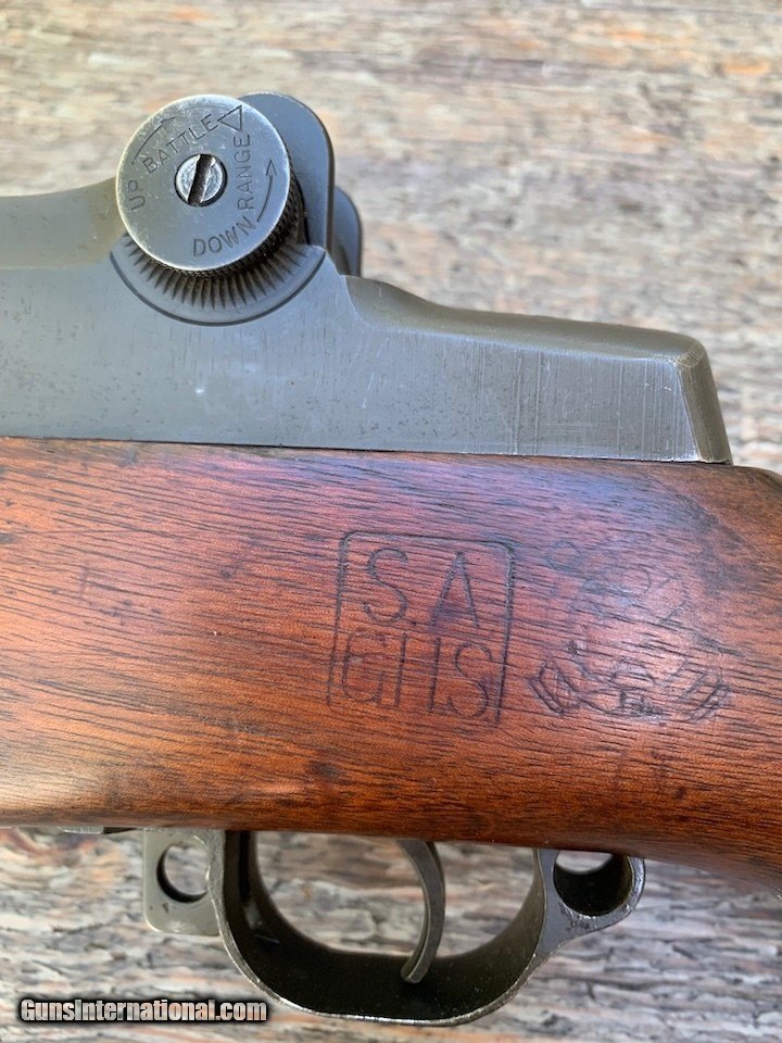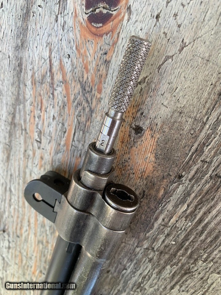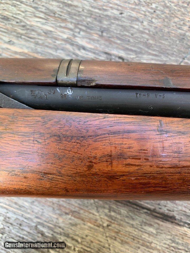 This is a 100% original M1 Garand Lend Lease. One of 38000 Garands transferred to England during WW2 under the Lend-Lease Program. It is in excellent condition and shows ALL the Lend Lease characteristics, Including the correct SERIAL RANGE, FLUSH-NUT REAR SIGHT, UNCUT OPERATING ROD, MILLED TRIGGER GUARD, GROOVED REAR HANDGUARD BAND, Front SIGHT CAP, UPSIDE DOWN BARREL DATE(Aug 41') and PROPER BRITISH PROOF MARKS. IT HAS A NICE CLEAR CARTOUCHE AND CIRCLE P PROOF. The finish is excellent, the bore is bright and shiny and the barrel gauges at a ONE. It also still has its original roll pin.