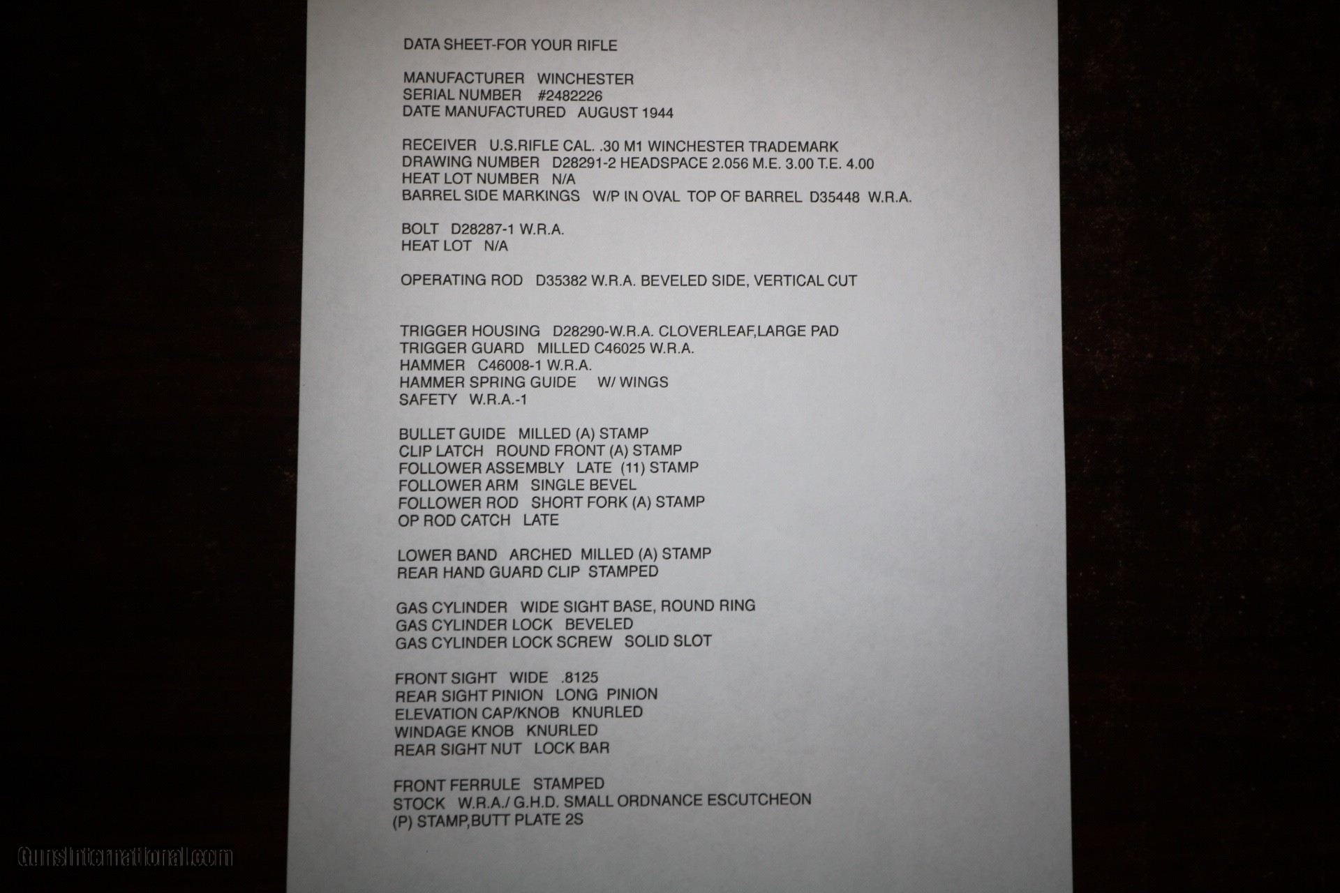 Description: Serial #2482xxx August of 1944. All W.R.A.parts,stock cartouche W.R.A./G.H.D.with small ordnance escutcheon.Proof stamp on stock is faint at trigger guard but is there.Butt plate stamped 2S. Pictures show as much detail as possible.I will send additional pictures to interested buyers. Data sheet list all parts.I am a member of Garand Collectors Association and Life Member of NRA.Price is negotiable,serious buyers only. Thank you. SOLD Curio/Relic: Yes Manufacturer: WINCHESTER Model: M1 GARAND Serial Number: 2482XXX Condition: VERY GOOD Metal Condition: VERY GOOD Wood Condition: VERY GOOD Bore Condition: GOOD Action: SEMI-AUTO Manufacture Date: AUGUST 1944 |