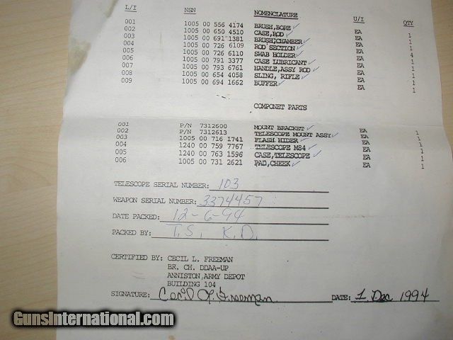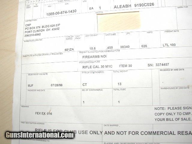 Description: THIS IS AN AUTHENTIC, NEW IN THE BOX SPRINGFIELD ARMORY M1-C SNIPER RIFLE, WITH DOCUMENTATION. IT WAS ISSUED BY THE CMP FROM GOVERNMENT STORAGE IN 1999, STILL IN IT'S SEALED BOX. THE ORIGINAL OWNER OPENED THE RIFLE FROM IT'S MATCHING NUMBERED WATERPROOF BAG, ALONG WITH THE SEALED NUMBERED SCOPE FOR DISPLAY PURPOSES ONLY. IT WAS NEVER FIRED. EVERYTHING ELSE IT WAS ISSUED WITH, SUCH AS CHEEK PAD, RUBBER EYE PIECE, SLING, CLEANING TOOLS ETC, ARE STILL SEALED IN THEIR ORIGINAL BAGS. COMES IN IT'S ORIGINAL SHIPPING BOX. IT HAS ALL IT'S ORIGINAL PAPERWORK WITH RIFLE SERIAL NUMBER, SCOPE NUMBER, PACKING LIST, DATA SHEET ETC, SIGNED IN ORIGINAL INK. MATCHING SCOPE BASE. A MINT, 100% GUARANTEED DOCUMENTED AUTHENTIC GOV'T ISSUED M1C SNIPER RIFLE, C&R OK SOLD Curio/Relic: Yes |