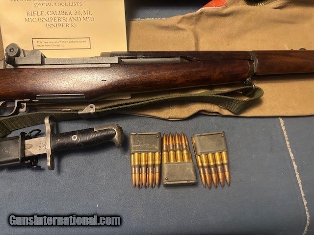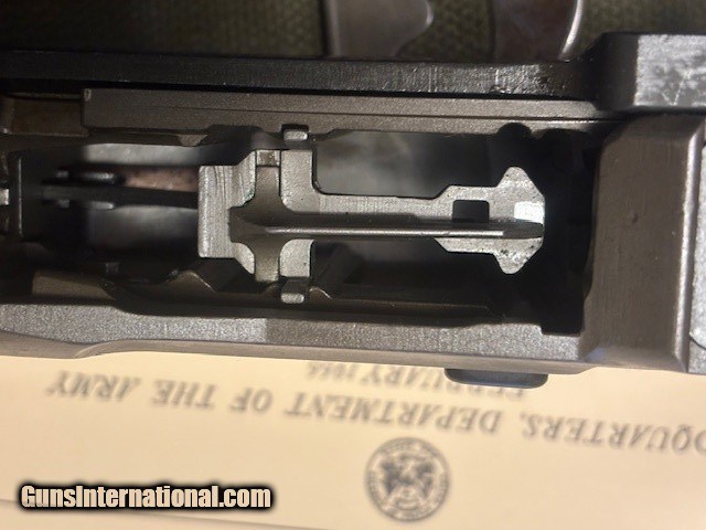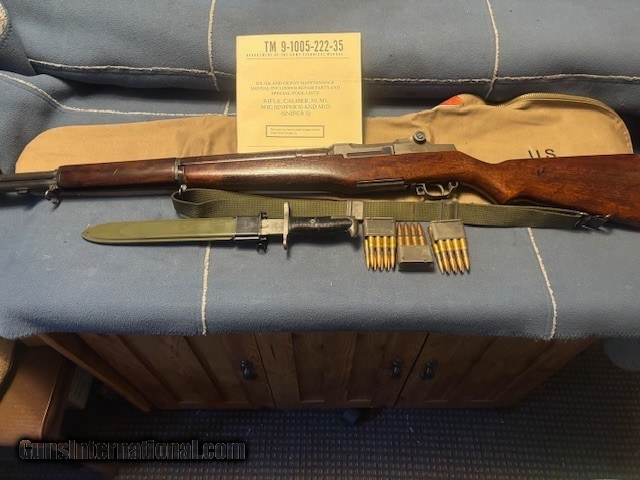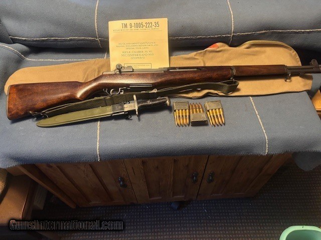 Description: Springfield Armory M1 Garand dated Jan. 1944 with origianal Springfield Armory Barrel in excellent condition for age. Stock is very good, not all banged up as many are. Solid no cracks. Stock has the DOD Cartouche and the P acceptance Mark. Action operates smoothly as it should. Springfield Armory bolt and trigger group. Bore is bright and shiny with good rifling. That is a 30 06 bullet in muzzel. See pictures for condition. Comes with USGISling, US marked M1 Garand carry case, Bayonet marked UFH - US ANd Flaming Bomb. missing locking pin, Scabbard marked US with Flaming Bomb and 3 enbloc clips with 24 rounds of US .30 Cal. Ball ammo (30-06) included and a M1 Garand DOD Matinance Manual. I am 81 and selling my collection. I'm a US Army Veteran and my MOS was Armorer (gunsmith) and I can assure you this is exactly as described. See my othe listings on this site. Shipping $80. PRIVATE SELLER, RIFLE MUST SHIP TO AN FFL FOR PICKUP. C&R OK. NO CALIFORNIA SHIPPING. SOLD Curio/Relic: Yes Rifle Caliber: .30-06 Springfield Manufacturer: SPRINGFIELD ARMORY Model: M1 GARAND Condition: VERY GOOD Metal Condition: VERY GOOD Wood Condition: VERY GOOD Bore Condition: VERY GOOD Manufacture Date: 1044 |