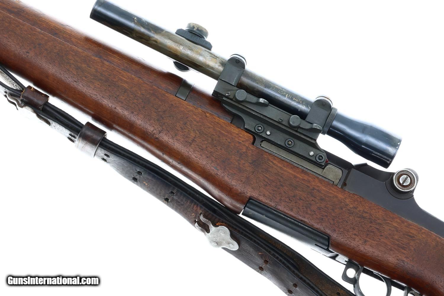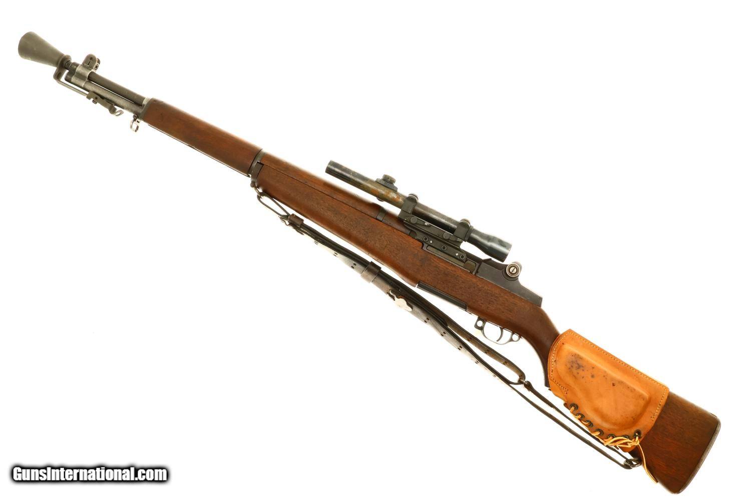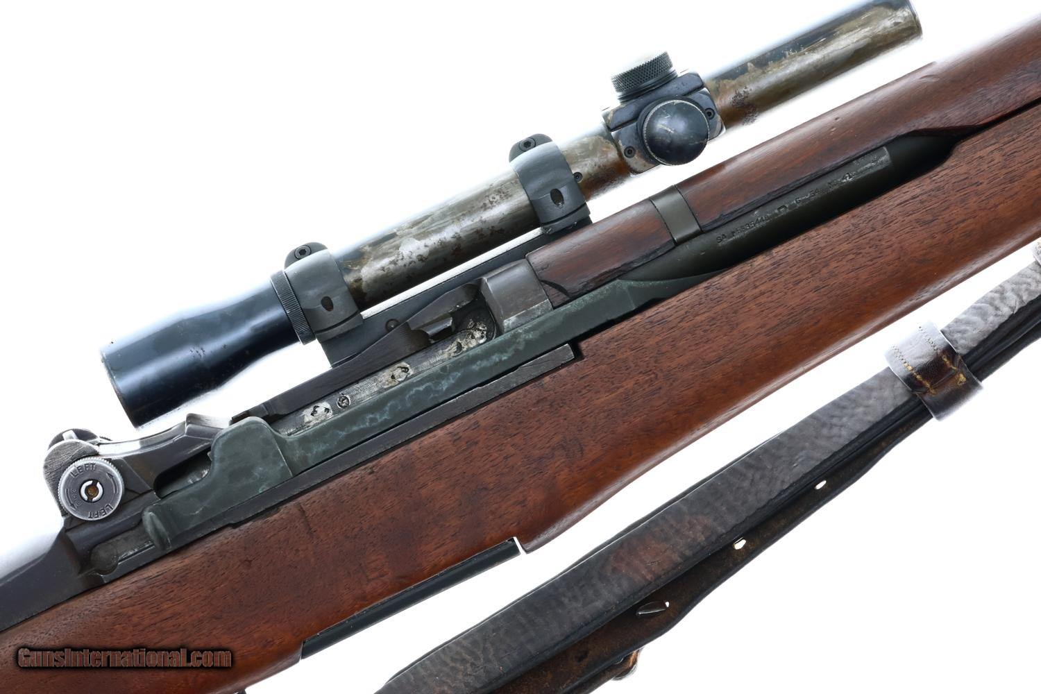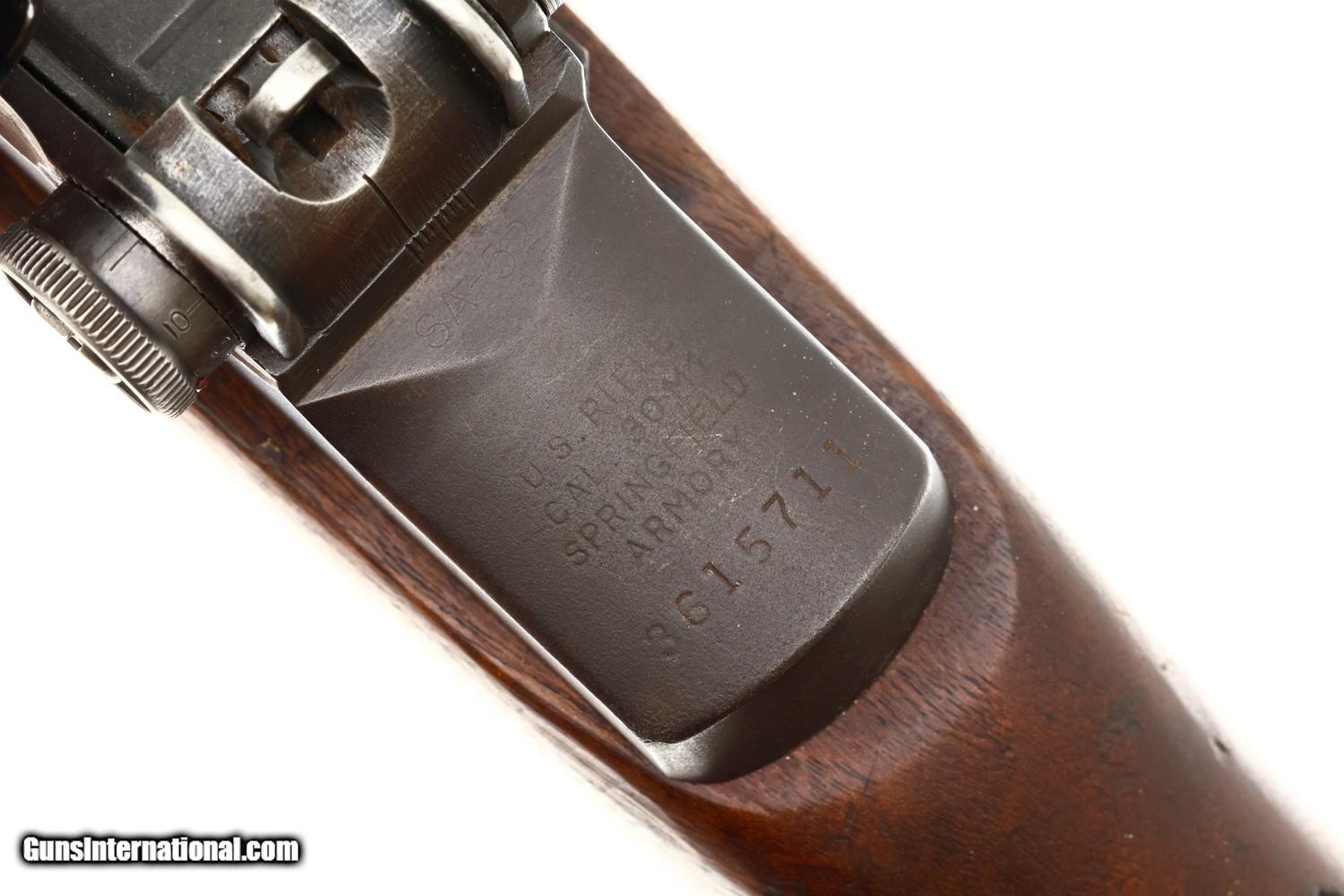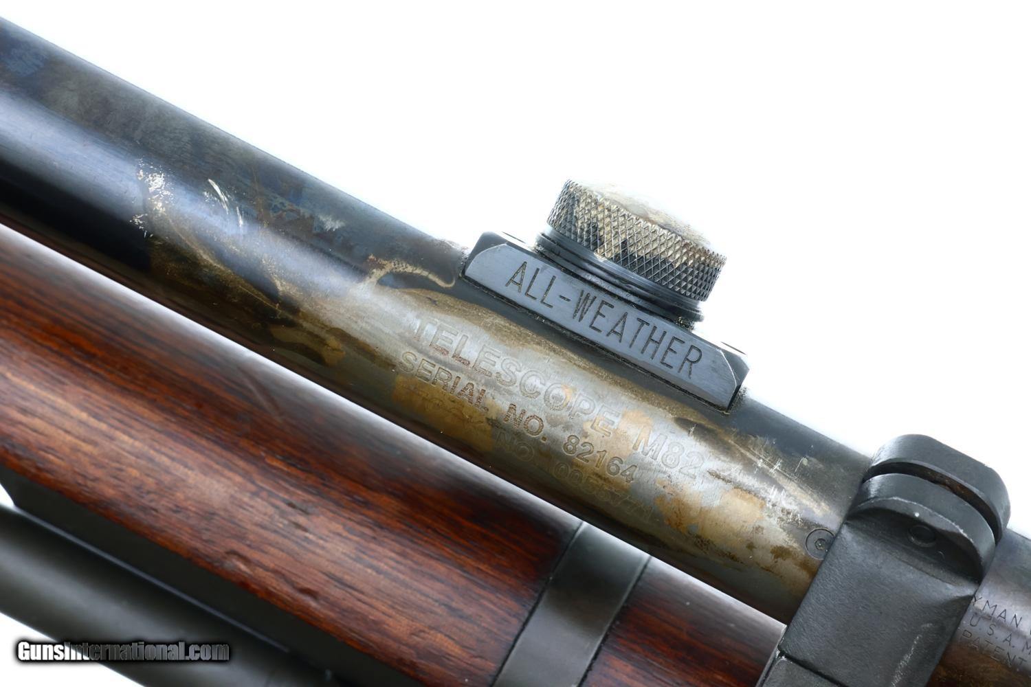 This WWII U.S. Springfield M1C Sniper Rifle, cal .30-06, SN: 3615711, fewer than 13,000 built, with a Lyman Alaskan M82 Telescopic Sight, cone flash hider, correct sling, in usual serial range and DCM letter of authenticity. The rifle was originally manufactured in late 1944-early 1945, later reworked/refurbished for Korea as it is marked on the rear flat behind the rear sight with "SA-52". The side of the receiver is fitted with a M1C scope bracket. The base itself is correctly held on with three cap head screws and two taper pins. The mount is fitted with an original WWII contract M82 sniper scope marked on the left side: "TELESCOPE M82/SERIAL NO. 82164/ STOCK NO. 0055771". The rifle was refurbished for Korea as it is marked on the rear flat behind the rear sight with "SA-52". SA barrel dated 6-54. No discernible markings on bayonet lug. The receiver has standard Springfield markings and is fitted with a post-war rear sight assembly a post-war wide gas cylinder and a mix of WWII and post war Springfield Armory markings. It is fitted with an arsenal rework walnut stock with boxed "P" on pistol grip and SA buttplate and has a russet leather, "MRT/ 11-58" marked, lace-on cheekpiece. Complete with a cone type flash hider. CMP certificate identifying this rifle as an authentic M1C by serial number.