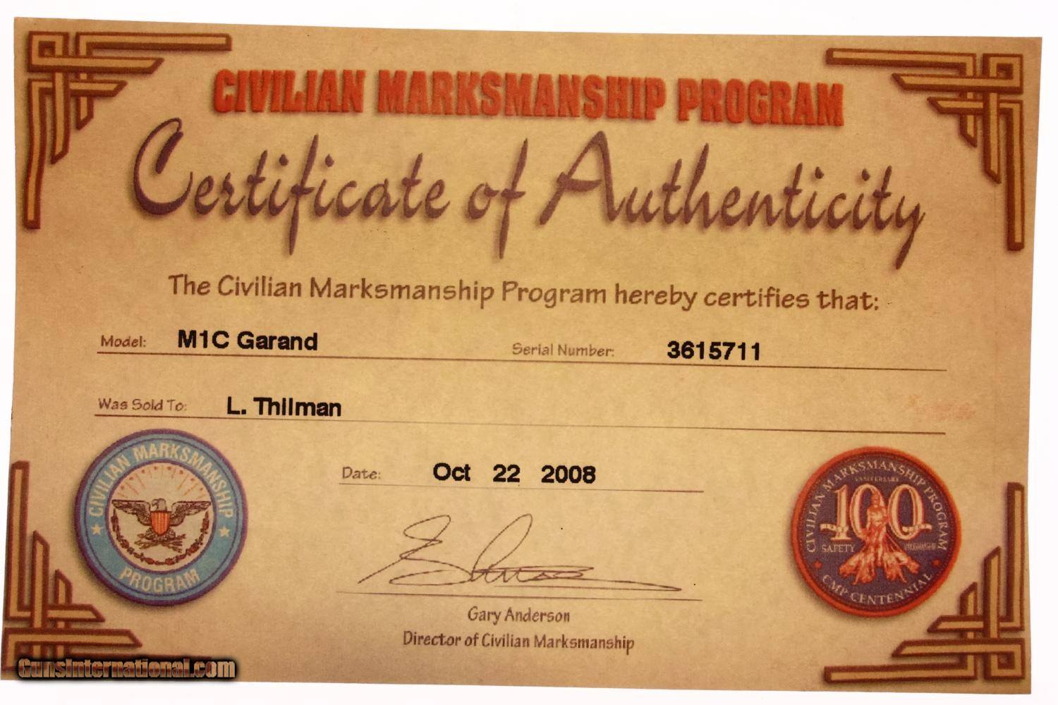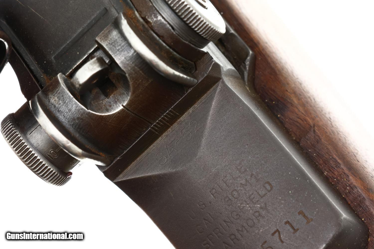 Scarce Springfield Armory M1C Garand Sniper Rifle, a WWII-era firearm chambered in .30-06, with a Lyman Alaskan M82 telescopic sight, cone flash hider, marked "SA-52" indicating refurbishment for the Korean War, complete with a DCM certificate of authenticity.
