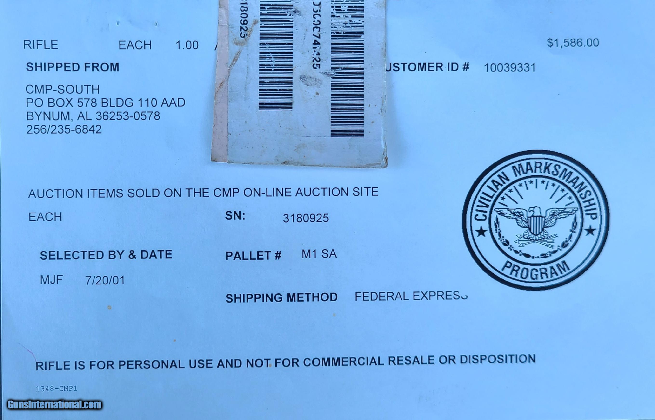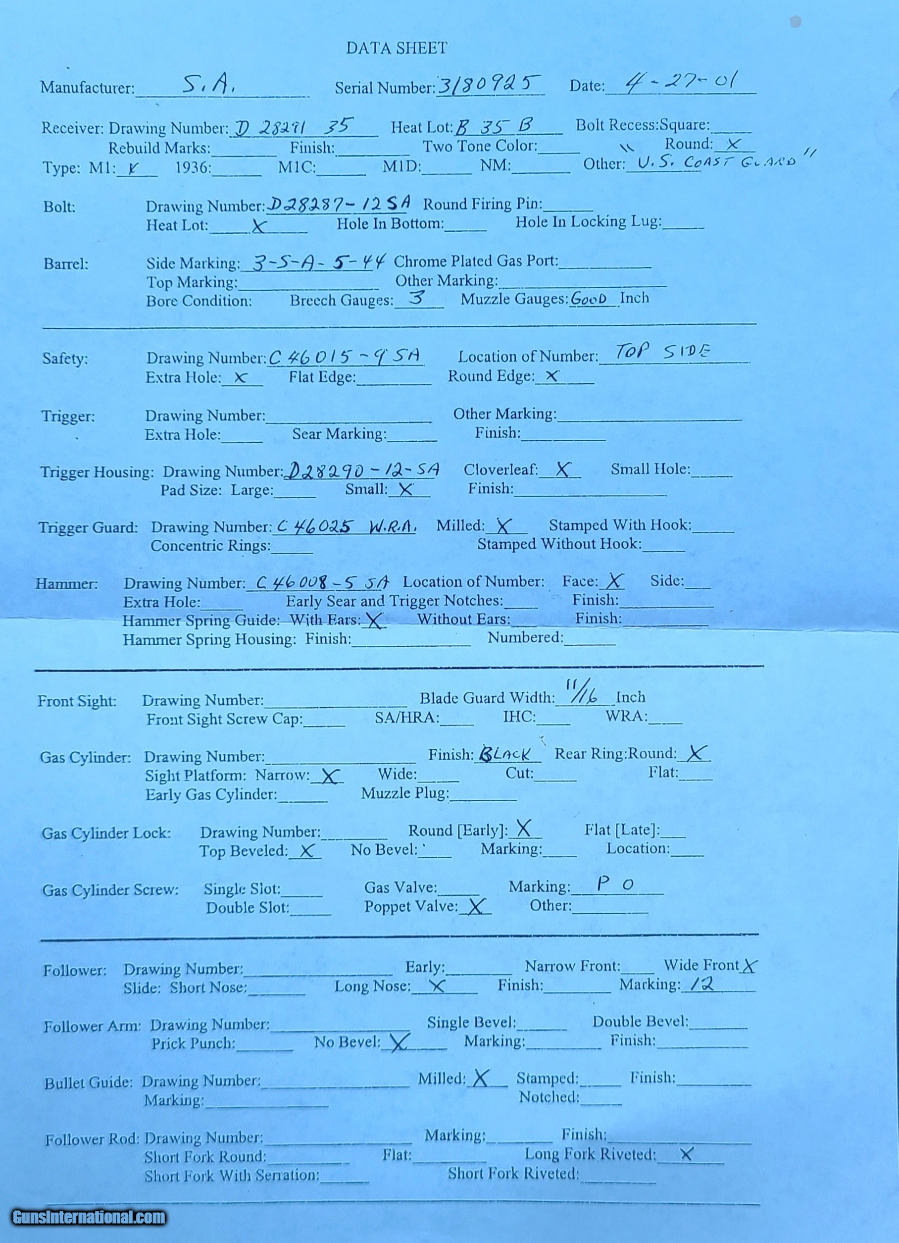 Description: If you like rare, this is for you. If you are a Coast Guard guy and a M1 garand guy, it is a must have. I have only seen a handful of these in 15 years of collecting garands and this is the only one I've seen with paperwork. It is a U.S. Coast Guard marked M1 garand. It is a 2001 CMP rifle and comes with the paperwork, military hang tag, CMP certificate, and CMP data sheet. Specifics....SA 5-44 barrel with TE 3.5, MW 1, WRA op rod, WRA narrow based gas cylinder, stock SA open box with H on left side, type 3 lockbar. No reproduction parts, no import marks. Ships from my FFL to FFL or C&R. $3795 Shipping $75 extra SOLD Curio/Relic: Yes Rifle Caliber: .30-06 Springfield Manufacturer: Springfield Model: garand Serial Number: 3180925 Condition: nice |