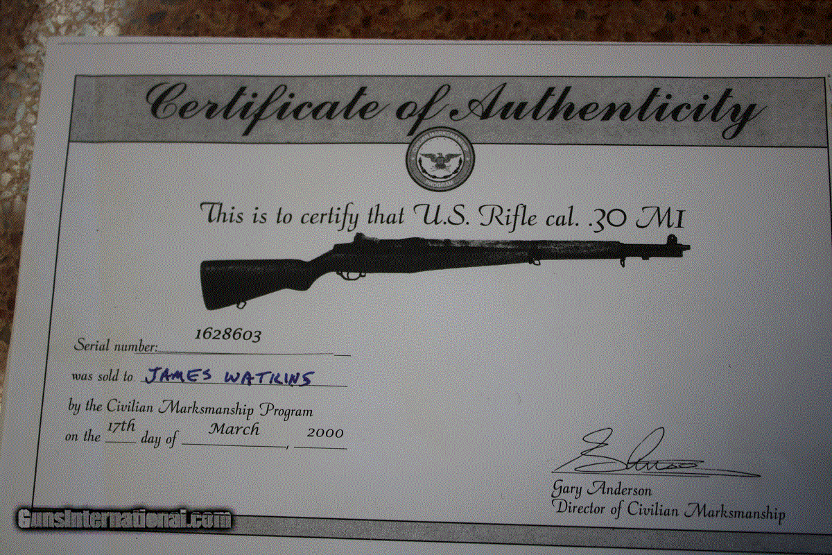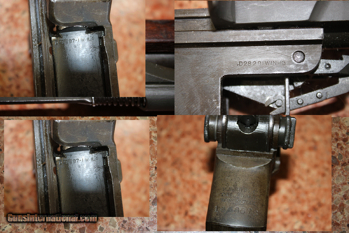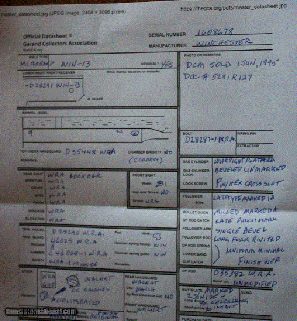 Description: SOLD SN 1608678 is a Win 13 which was the contract for the last 39,000 Winchester Garands made between Jan 1945 and June 1945. This rifle come with DCM and CMP provenance. The rifle was originally sold by the DCM on June 1, 1995. I have prepared a Garand Collector's Association Official data sheet for this rifle. All parts are numbered correctly and show the same coloration and wear patterns. The ME measures under 1 and the TE measures about 1.5. It also has a WRA lock bar rear sight which is correct on these rifles. The heel of the action shows some greenish brown coloration indicating some storage issues but in no way reduces the functionality of the rifle. The OC wheel was stamped on it's right side(happens) and the Circle P on the grip is worn off. I'll take $2500 delivered to your FFL/C&R. I am a current C&R licensee. SOLD SOLD Curio/Relic: Yes Rifle Caliber: .30-06 Springfield Manufacturer: Winchester Model: M1 Garand Serial Number: 1608678 Barrel Length: 24 Condition: very good+ Metal Condition: very good Wood Condition: good Bore Condition: excellent Manufacture Date: early 1945 Item Location: Linneus, MO |