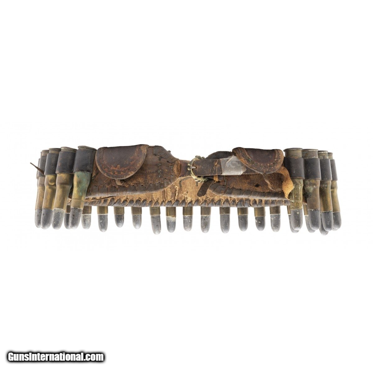 Description: " Rifle has no British markings but is an excellent example of the silver work seen on discarded European weapons and taken by Afghans and outfitted in their style. This is a superior example with finely decorated silver wire at the wrist and silver embossed barrel bands. Barrel length is approximately 31.5"" and 48"" overall. Bore has very strong rifling. Action works properly. Possibly one of the most interesting thing that goes with this rifle is a bandolier of .577-450 cartridges of the period. The bandolier is a real piece of native handicraft and somewhat miraculous that it is still intact! Overall an ensemble very hard to duplicate. Whoever buys this really neat outfit should, in our opinion, leave the bandolier intact as it is. We feel that removal of the cartridges may damage the leather and fabric. SOLD |