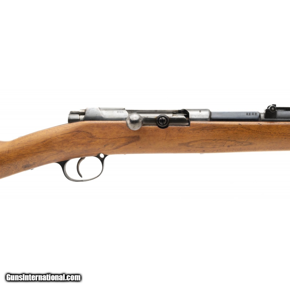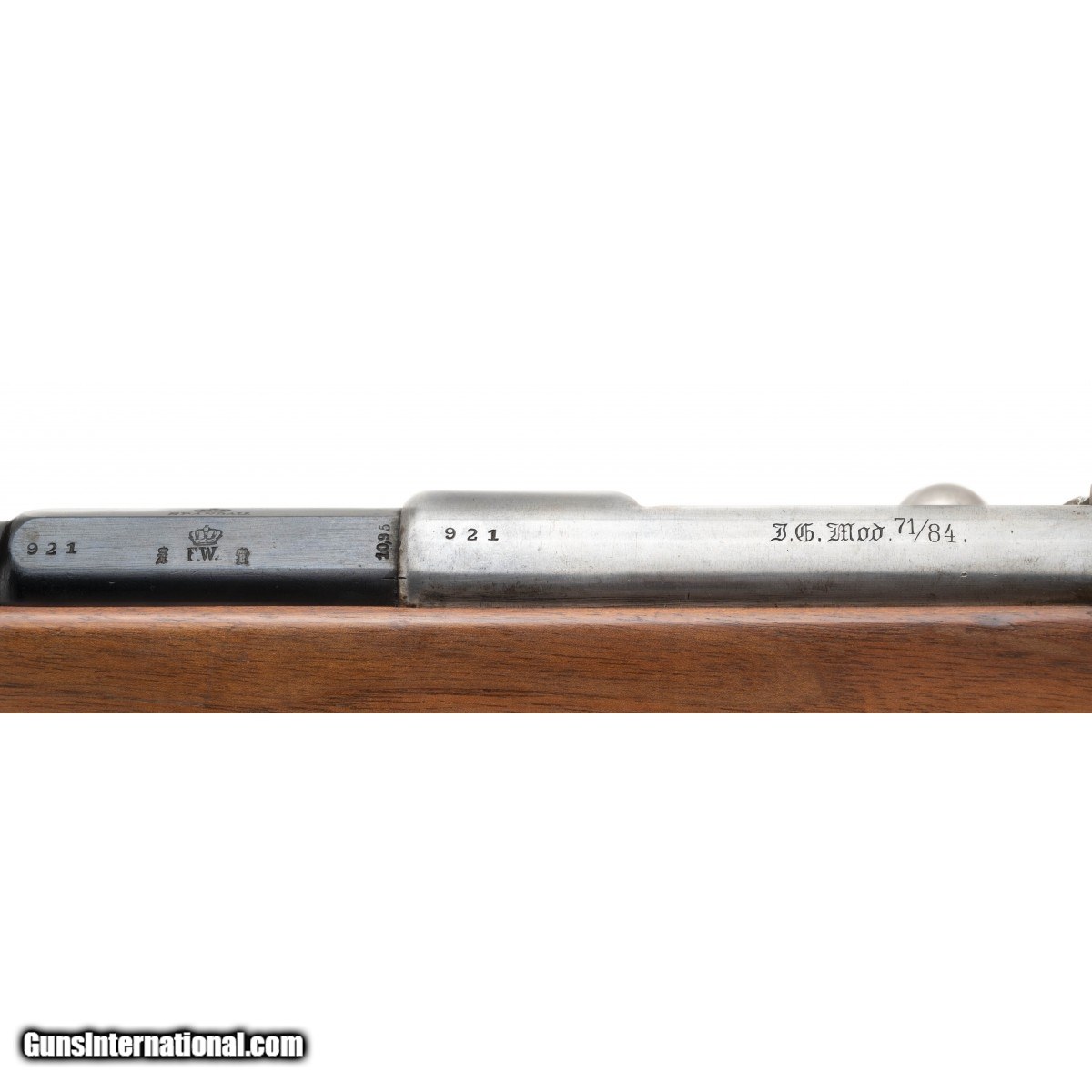 This Spandau manufactured Model 71/84 rifle is in excellent condiition. The 11mm Mauser bore is excellent with bright, strong rifling. The blue is approx. 99% with minor storage wear. The stock is excellent with minor storage dents and dings. All the numbers (s/n 921) match. The left side of the receiver is marked I.G. Mod 71/84 (Infantry rifle Model 71/84). The right side is dated 1886. The top of the barrel knox form has a crown over SPANDAU on top, the left side has 921 followed by a crown over B(?) proof followed by a larger crown over F.W. (Fredrick Wilhelm) flollowed by a crown over B(?) proof followed by the caliber 10,95, and the right side has an additional four inspection stamps. The buttplate tang is unit marked G.J.R. over 50. This most likely stands for Degachment Garde-Jager-Regiment, rifle No. 50. The action functions correctly. This top notch Spandau Modle 71/84 rifle is ready for the finest collection.