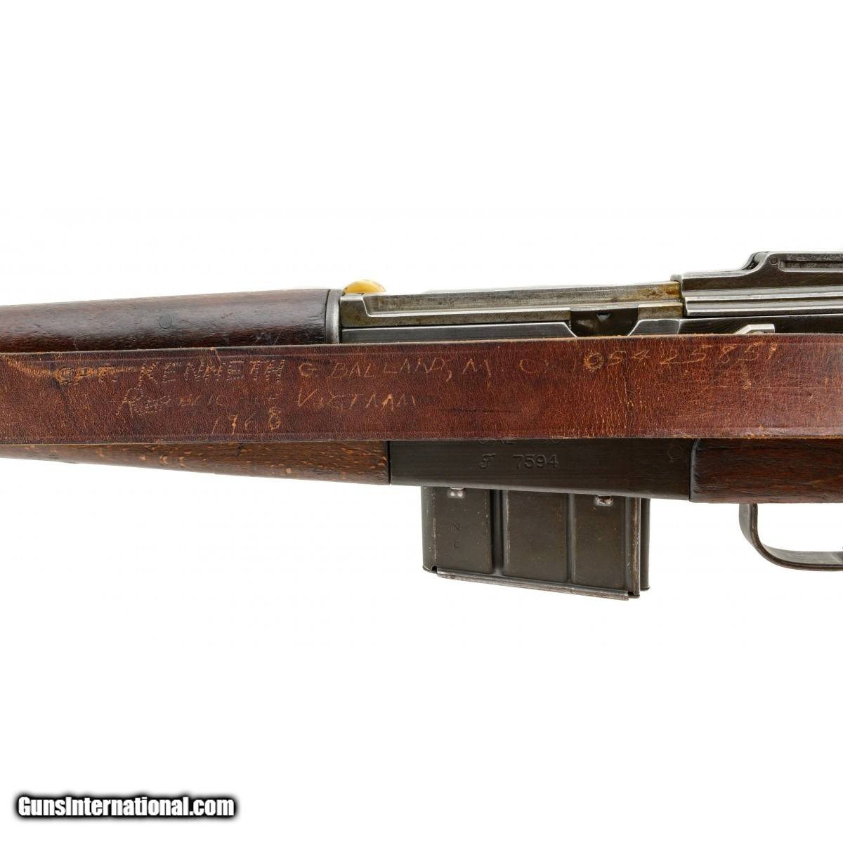 Description: " Serial No. G7594, circa 1950""s, 7.5 French, 23.25"" round barrel. Overall very good condition, bore is bright with strong rifling noted. Stock has a crack visible from the rear of the receiver the comes around to the right side roughly 4.5"". Sling is marked "" CPT. KENNETH G. BALLARD, M.O. 0542589/ REPUBLIC OF VIETNAM/1968. Action functions correctly. SOLD Curio/Relic: Yes |