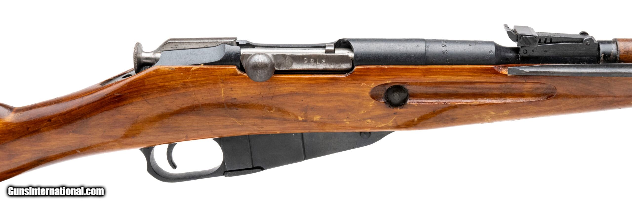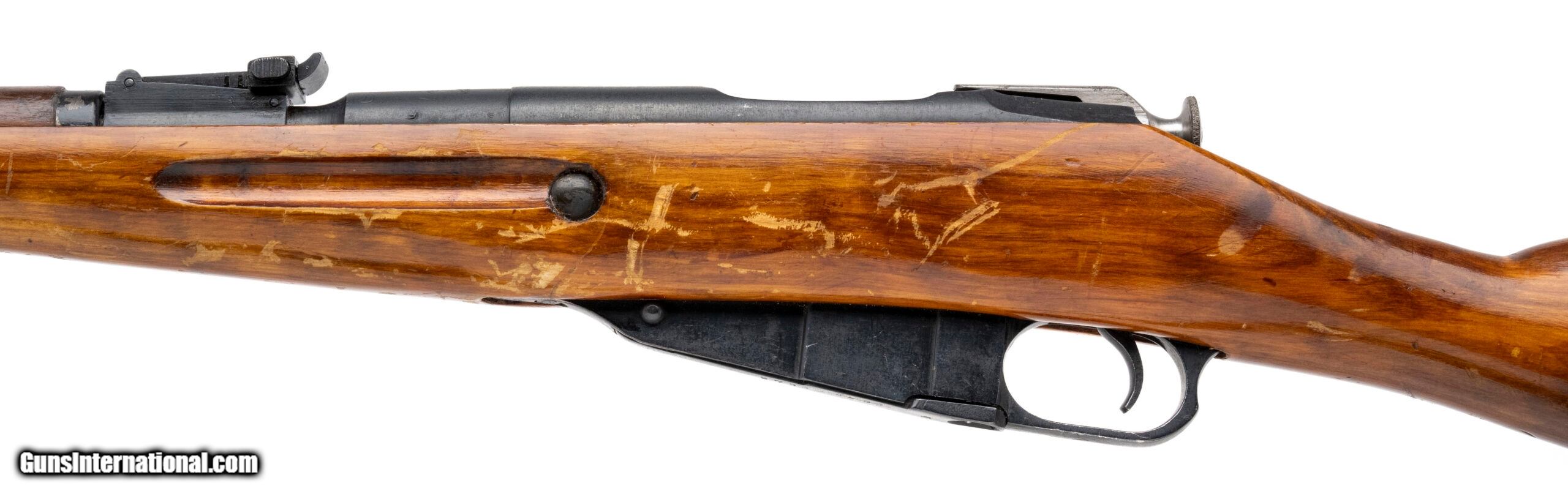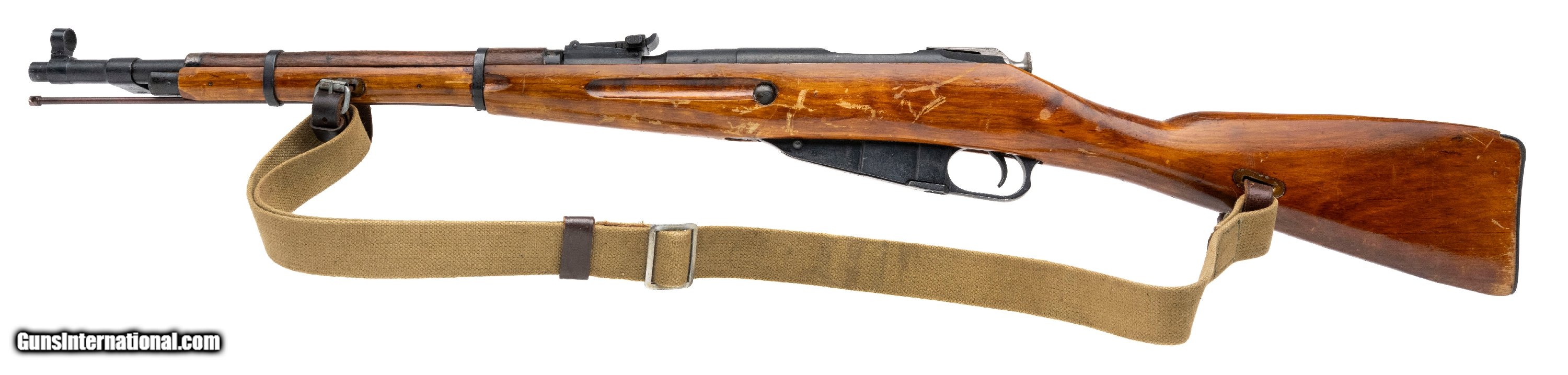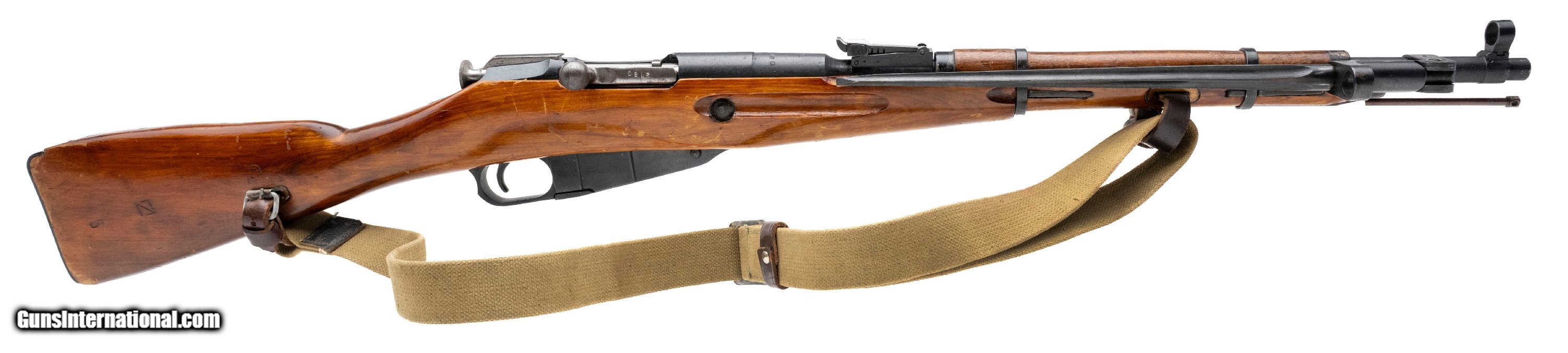 Description: "SN: 44-4276 (importer. Original ""Zhe"" ""I"" 2780). Bolt-action Russian military rifle made by Izhevsk in 1944. Standard 20"" barrel chambered for 7.62x54R. Good condition with typical handling marks for a battle rifle, with reblued barrel and receiver. Bore is slightly frosted with good rifling. Matching barrel, bolt and buttplate. Force-matched Izhevsk magazine. Comes with correct canvas and leather ""dog collar"" sling. SOLD Curio/Relic: Yes |