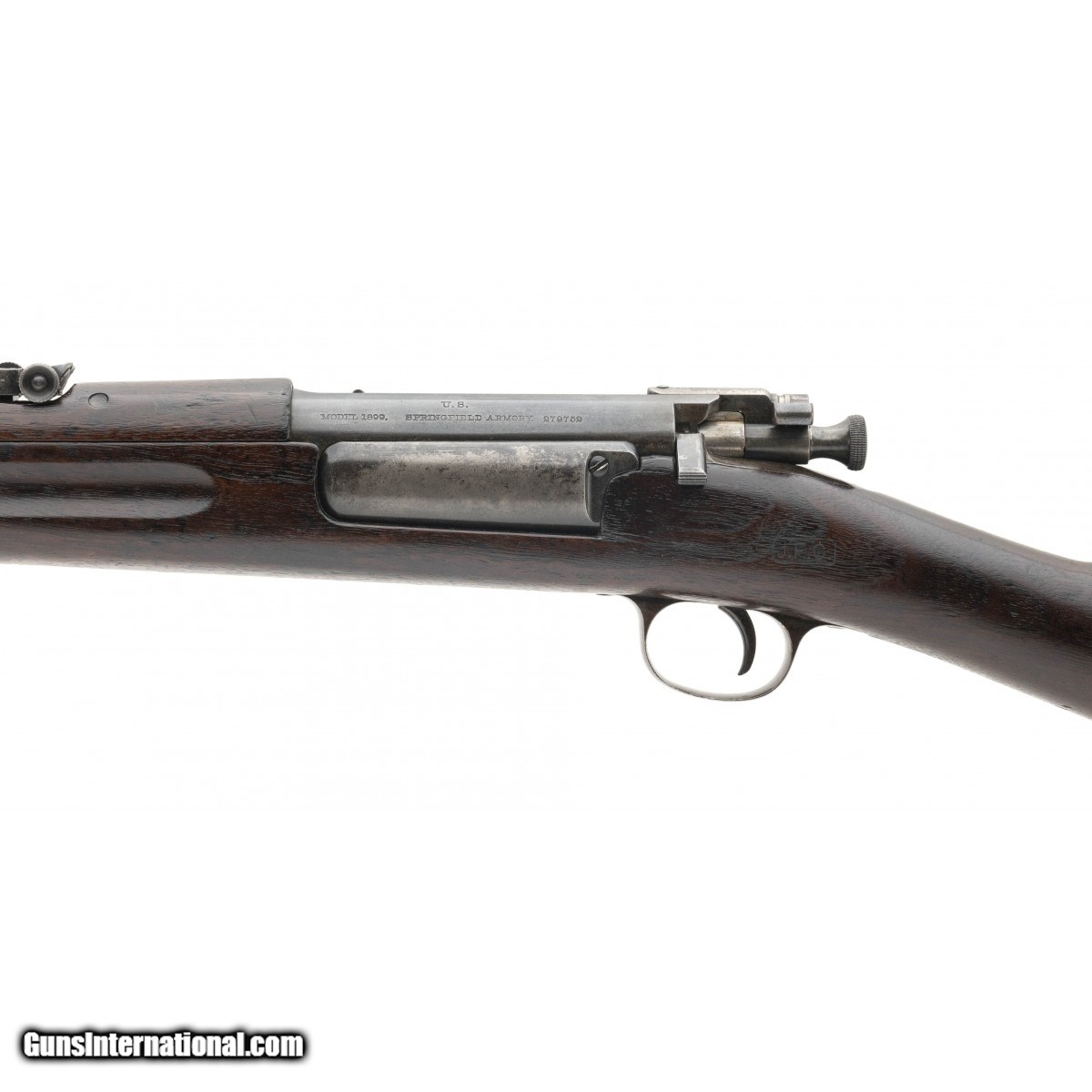 The Springfield, Manila, and Rock Island Arsenals altered approx. 8,000 30 U.S. caliber (30-40) Krag carbines (mostly 1899 Models like this one) to Constabulary configuration between 1906 and 1916. In addition to the Philippine Constabulary, these interesting guns were supplied to ROTC and other school units. The alteration consisted of placing the carbine in a shortened (by 8"") Model 1898 rifle stock (which had to have the lightening cut in the barrel channel filled and the forend worked down for the front band), turning the carbine muzzle down to fit the Krag or Model 1905 bayonet, and reforming the front band to properly fit the barrel. This Krag Philippine Constabulary carbine is one of the very desirable ones that was altered by the Springfield Armory as evidenced by the very nice J.F.C. stock cartouche. It has a correctly altered stock, muzzle, and front band and is equipped with the Model 1902 rear sight. The rods and oiler are in the butt. The bore is excellent with bright, strong rifling. The metal is a pleasing blue-brown overall. The stock is fine with very light issue dents and dings, a strong cartouche, and no chips or cracks. The firing proof is light but visible. The action functions correctly. This is one of the nicest Phillipine Constabulary Krag carbines we have seen, especially for a Springfield-altered gun. Don't miss it!