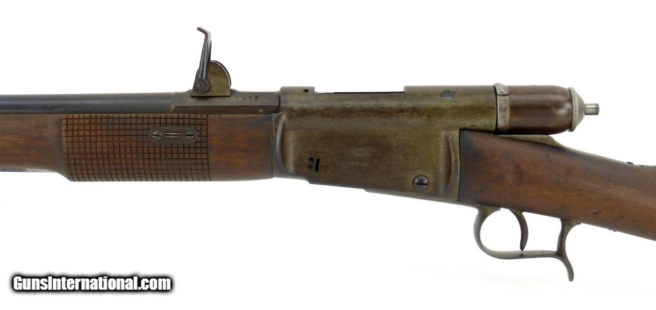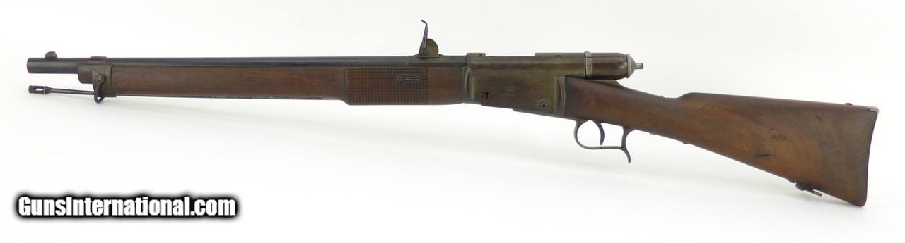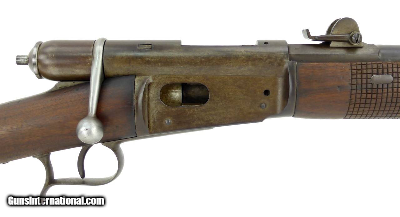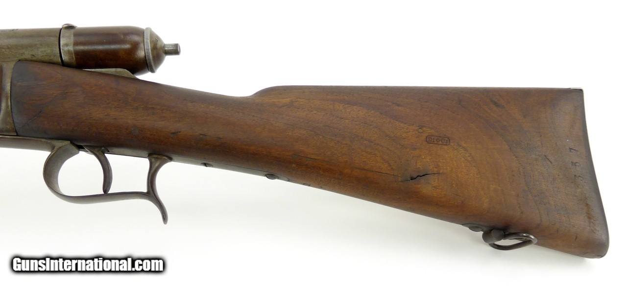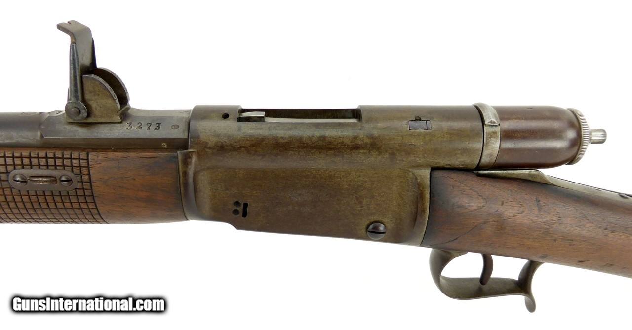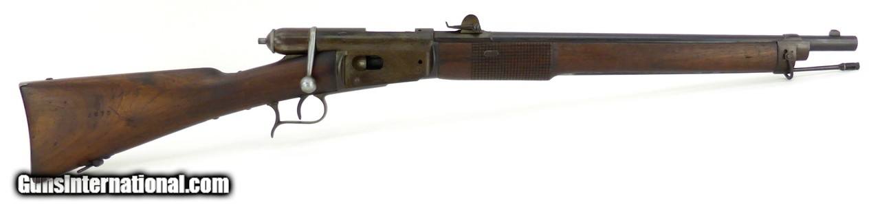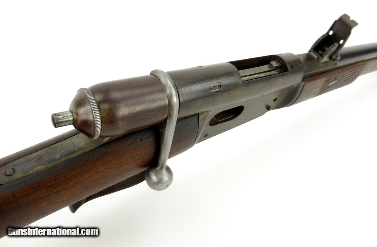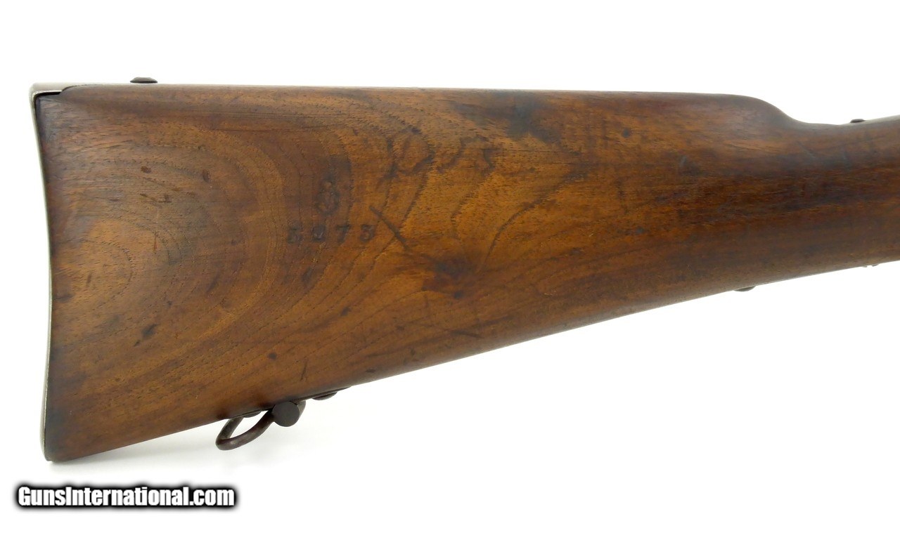 Description: "Swiss 1869 10.4x38mm caliber carbine. Designed by Johann-Friedrich Vetterli. Has a six round tubular magazine. These rifles were in service from 1869 to 1890. The carbine version is a cutdown converted Model 1869/71 and was produced/converted in the 1870’s and 1880’s. Overall length is 38½" and has a barrel length of 21". Wood is in excellent condition with minor dents and dings and shows minor age cracking in the buttstock. All matching serial numbers. Metal has a brown patina finish. Bore is dark in the grooves. Very good to excellent overall condition. (DALLAS LOCATION) Antique: Yes Price: $3,250.00 Contact Seller |