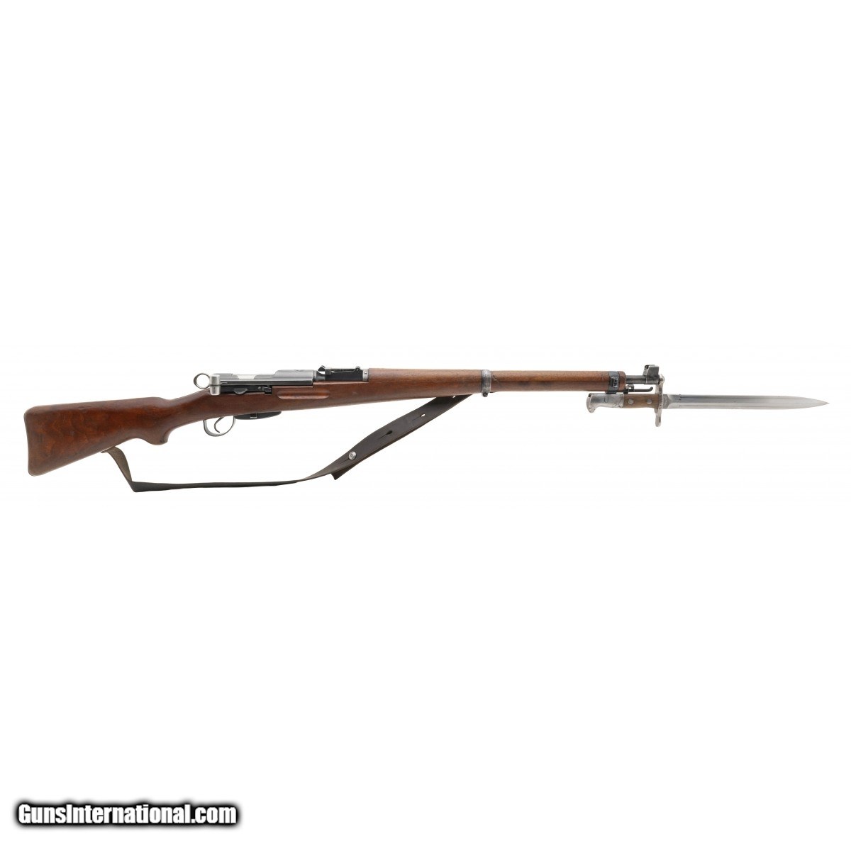 Description: " Serial No. 751926, chambered in 7.5x55 Swiss with a 26"" round barrel. Overall good condition with slight handling and usage wear noted. Bore is bright and shiny with strong rifling visible. Comes with muzzle cap and bayonet. Action functions correctly. SOLD |