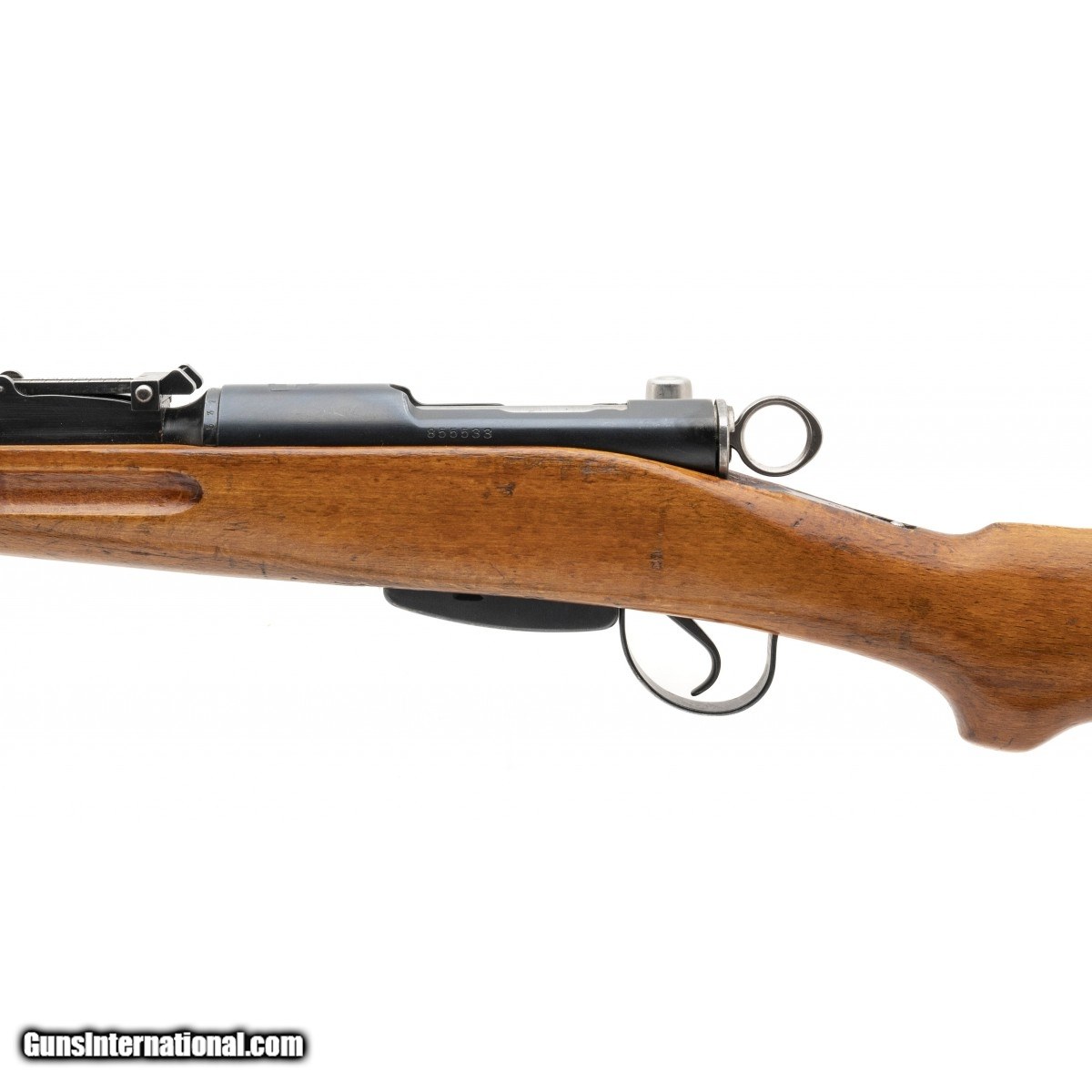 SN: 855533. Manufactured in 1945 straight pull bolt action rifle with a 25"" barrel in 7.5x55 Swiss and muzzle protector. All matching parts in excellent condition.