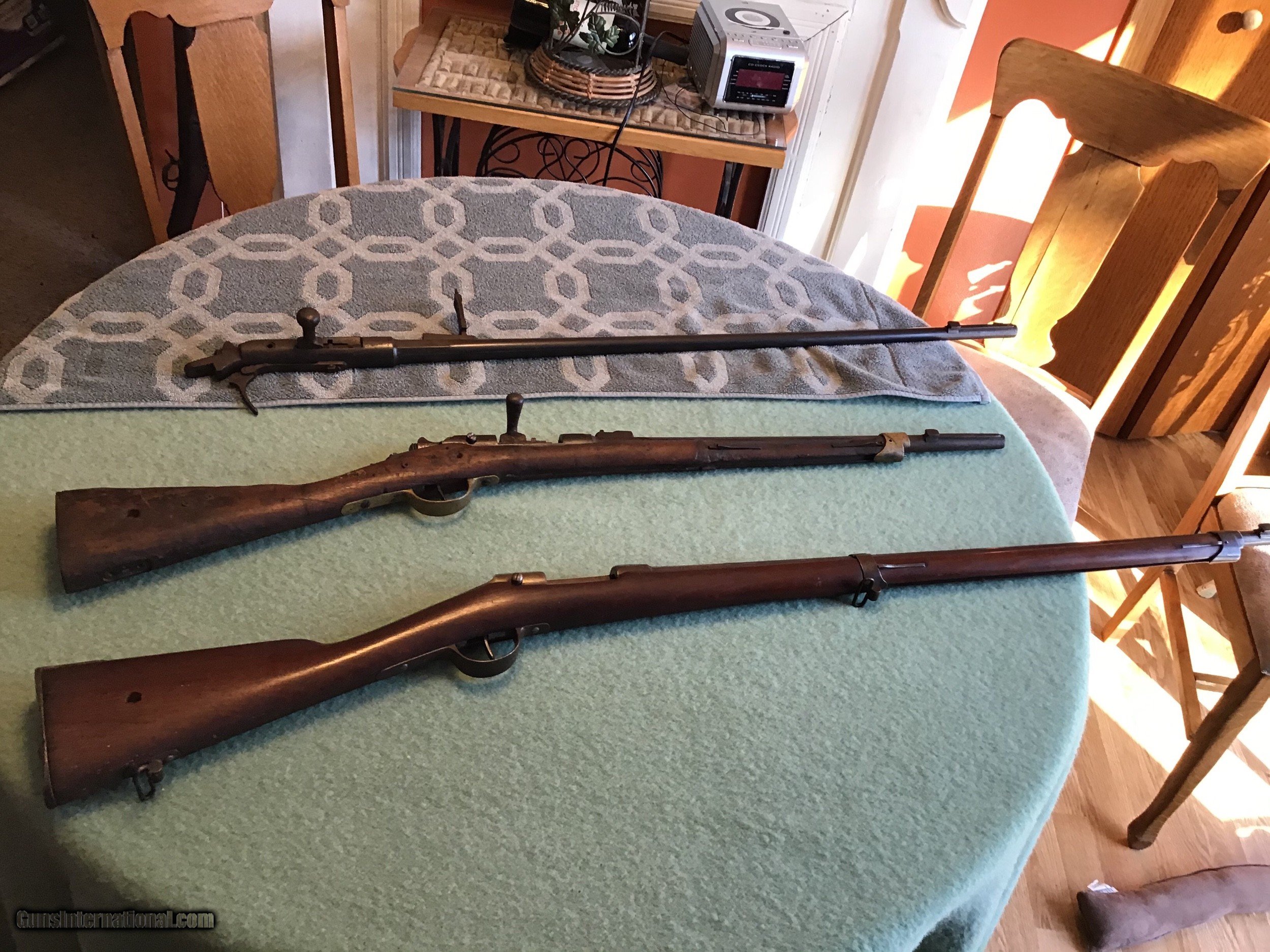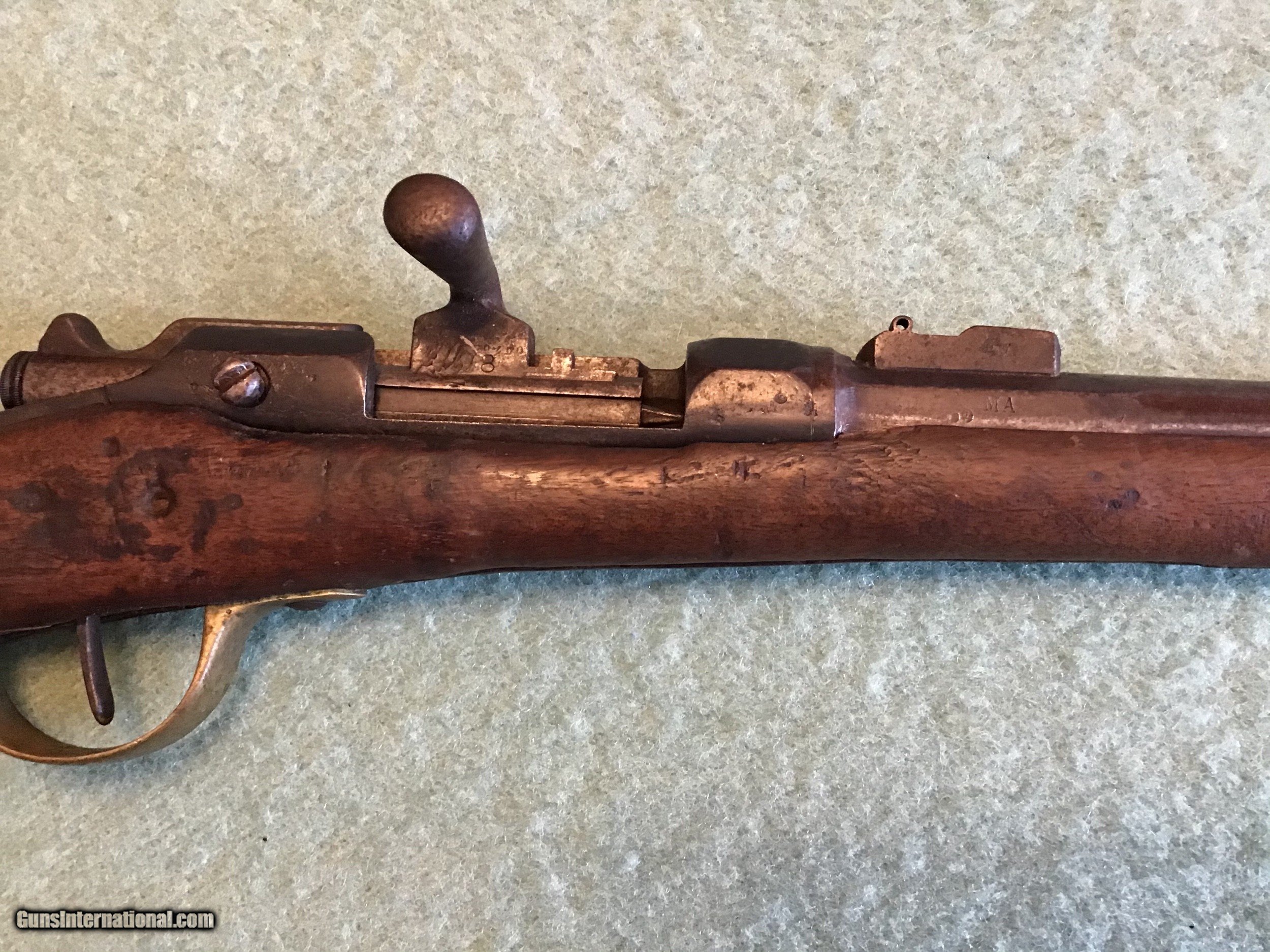 Description: On Hold Sale Pending . These are 2 incomplete French military rifles as well as a 1874 Gras barreled action. The first is a very good 1866 11mm Chassepot missing the bolt and rear site, The stock has been refinished and is in very good condition. The barrel is dated 1867, has a smooth brown patina as the rest of the metal parts with a very good bore. The next is 1866-74 as marked French military carbine or artillery rifle also 11 mm,. The stock is rough from use as well as cracks chips dents and loss towards the forearm. It is missing the but plate, the lower band, the site base is present but the ladder is missing. This I believe to be a rare gun that needs TLC. There are no cleaning rods also. The last is a 1874 French 11mm military Gras barreled action with the bolt and both sights. The exterior is dark with scattered rust and the bore is dark. One price for all 3. Shipping for all 3 will be actual cost approximately 65.00 due to weight. Please feel free to call me with any questions 218-839-9272 chriskobberdahl2gmail SOLD Antique: Yes Manufacturer: French Model: 1866&1874 |