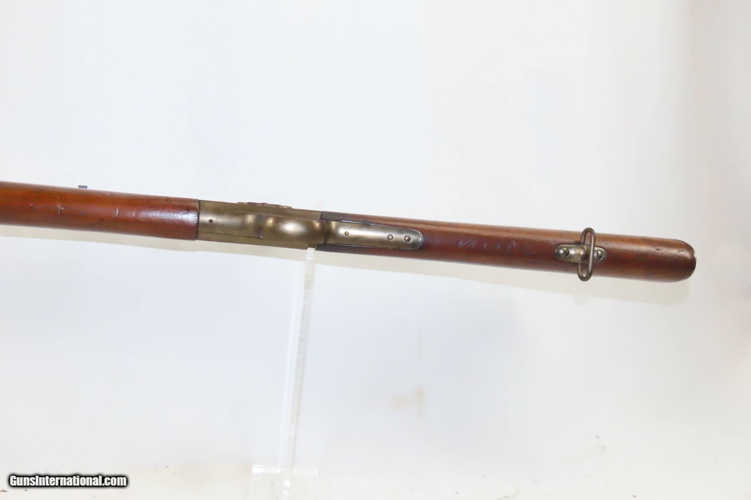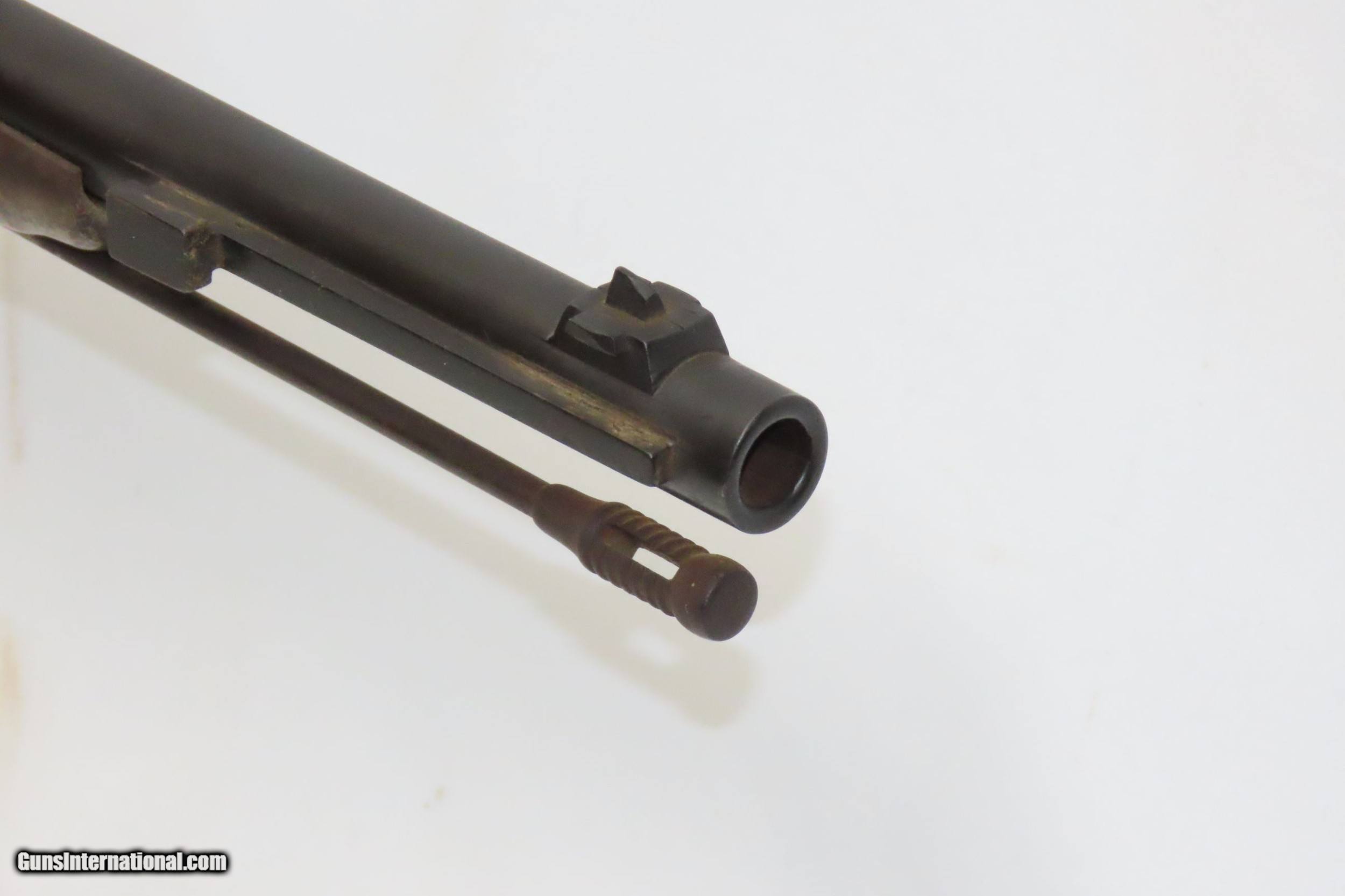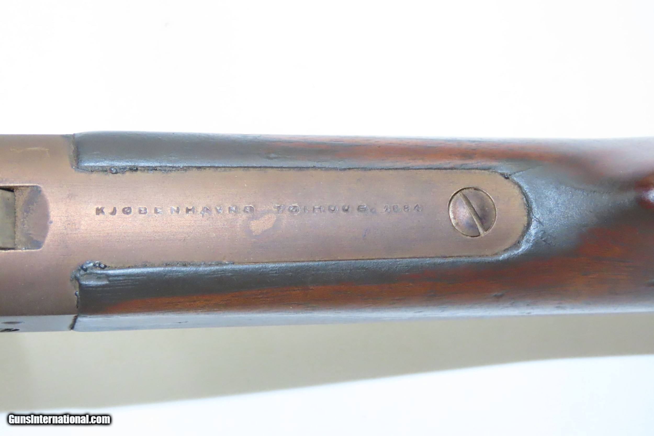 Description: Antique DANISH MODEL Remington Rolling Block Model 1867/96 MILITARY Rifle Made in COPENHAGEN & Dated 1884 with BAYONET Here we present an antique Remington Rolling Block Model 1867/96 Military Rifle, made in 1884 at the Kjobenhavns Toihuus Arsenal at Copenhagen for the Danish Army. Denmark was the first of a long list of countries that would adopt the Remington Rolling Block for their militaries, after Sam Remington’s exhibition trip to Europe in 1866. Norway and Sweden each followed suit. The appeal of the Rolling Block was its strong, simple action. Though repeating rifles were becoming more and more refined and prevalent in civilian circles, militaries all around the world were still married to the idea of large bore, single shot rifles. Denmark’s initial chambering was for a rimfire cartridge, but they soon adopted a centerfire cartridge. With tons of the older rimfire ammunition still around, modifications were performed so that the rifles could fire either centerfire or rimfire by simply backing out the screw on the left side of the breech block and putting the firing pin through the appropriate aperture. This specimen was manufactured in Denmark in 1884, having been licensed to do so by Remington and paying a royalty. It features a reversible firing pin for either centerfire or rimfire ammunition. There is a long bayonet lug on the right side of the barrel for mounting a long saber bayonet. The cleaning rod screws in tight in the channel. “KJOBENHAVNS TOIHUUS, 1884” is stamped into the receiver tang, which is the arsenal and year of manufacture. Crowned proof marks can be found throughout. The overall condition is near fine. Original finish and patina. Excellent action. The bore is shiny bright with sharp rifling. The stock is fine, with just a tiny split behind the lower tang. Numbers match on the gun. The bayonet and scabbard are in near fantastic shape. Own the original! This is a legitimate antique and not a reproduction. Barrel is 35-1/2 inches. Caliber: 11.7x51R Overall condition as seen in photos. Very Fast. Very Safe. FREE SHIPPING WORLDWIDE. Delivered directly to your door by express mail! Guaranteed AUTHENTIC & Includes CERTIFICATE OF AUTHENTICITY. ancestryguns $1400 #226886 SOLD Antique: Yes |