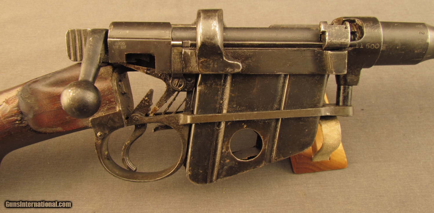 Description: Serial #11500, .303 British, 17” barrel with a dark, pitted bore. This is an Australian stamped (“D/Broad Arrow”) action, most likely manufactured by Lithgow, with mounted Lithgow-made barrel, magazine, and buttstock, and has been extensively cut-away in order to reveal the inner workings of the rifle. The metal has 85-90% of the original blued finish with a gray band on the barrel where the rear sight base used to be, and further gray fading along the sides of the barrel and on the exposed edges and surfaces. The exposed mechanisms have protective grease covering them and are fully functional. The buttstock and receiver ring have an identical “3MD” marking, and the wood has some minor handling marks in the otherwise fine military oil finish. These skeleton/cut-away training actions are not common at all, and Australian marked examples are very rare. This one is in very good condition and would make a great addition to any collection. FFL or C&R SOLD Curio/Relic: Yes Manufacturer: Enfield Model: SMLE Serial Number: 11500 Caliber Info: .303 Gauge Info: .303 |