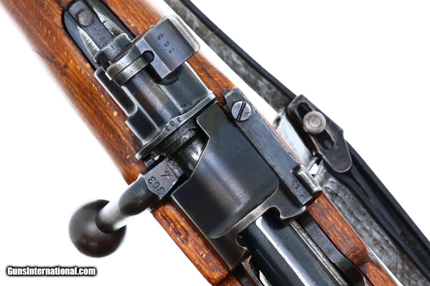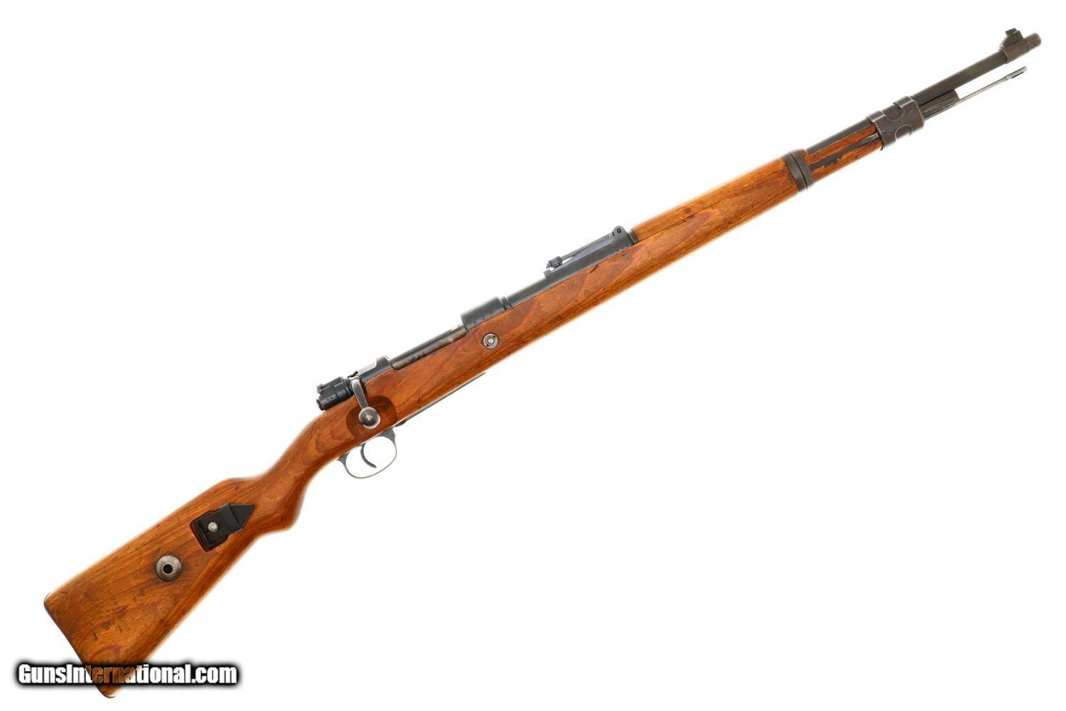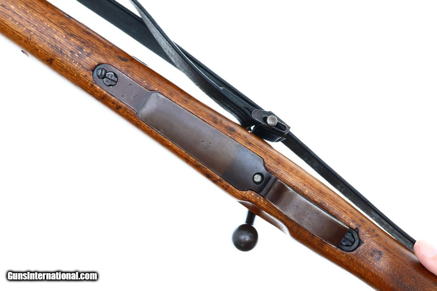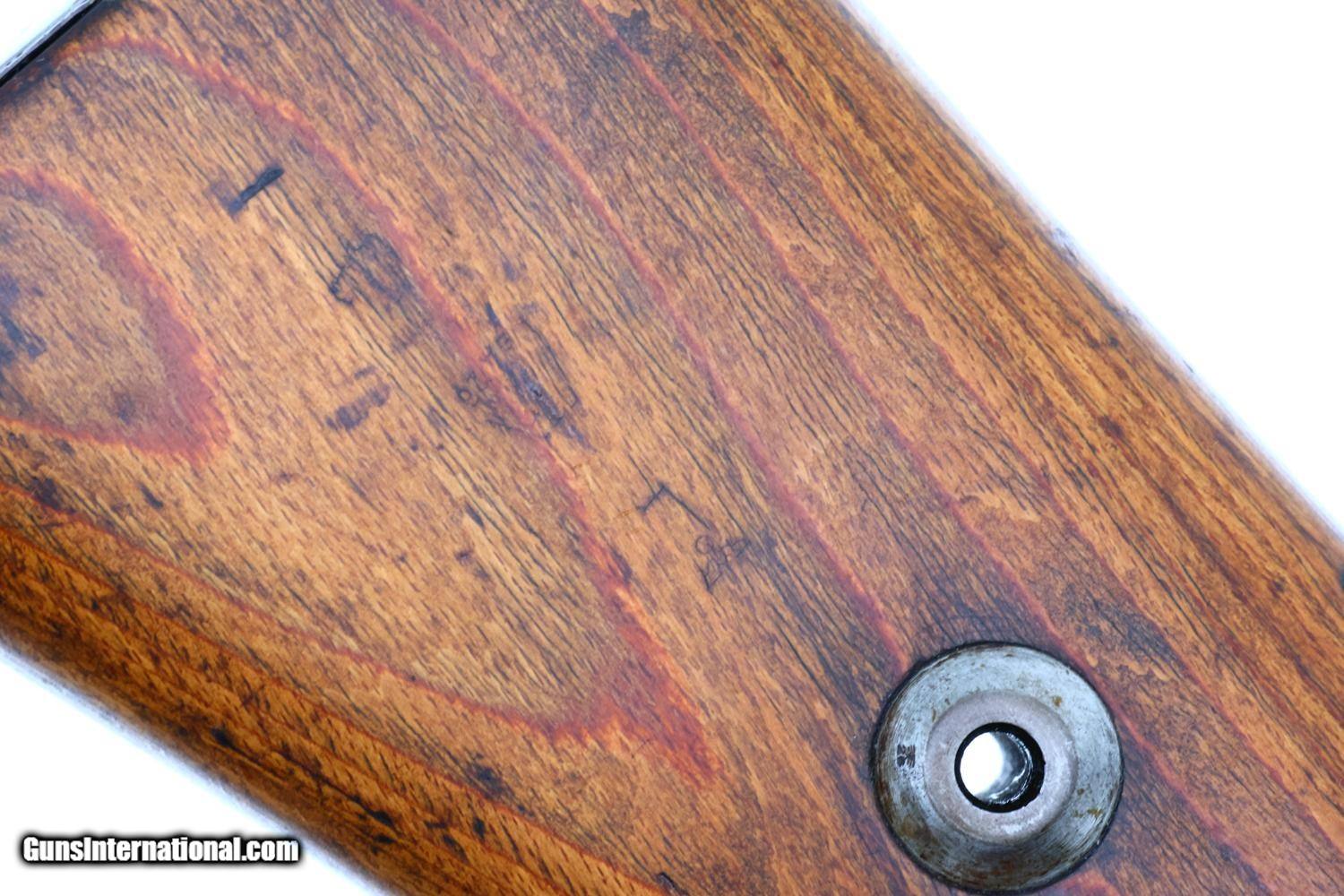 Description: Synopsis: This Berlin-Lubecker K98k is German WWII military rifle made 1938, cal. 8mm, all visible numbers matching, with bright bore and a correct sling. A classic World War II military rifle! Description: Berlin-Lubecke K98k made in 1938 for the German military. Standard configuration rifle with horizontally adjustable, inverted V front sight and tangent rear sight graduated from 1-20. Chamber coded S/237 along with the production year 1938. The left side of the receiver ring was marked with the full serial number 363b that was carried through to all visible/normally matching parts (except cleaning rod) including the bayonet lug, both barrel bands, tangent rear sight, barrel, receiver, all components of the trigger guard and floor plate, all components of the bolt assembly, the magazine follower, and even the butt plate. Cleaning rod #75. Complete with leather sling. Condition: VG with wear as one would expect from a carried gun that was in service throughout World War II. Areas of usual contact and use with toning and early thinning, especially around the forward barrel band and components of the trigger guard, floorplate, and butt plate. Stock and hand guard have been lightly sanded and refinished, the markings on the right side of the butt stock barely discernible. Action was not removed from the stock. Sling is dark and oil soaked. Surprisingly bright bore with strong rifling. Correct manual mechanics. A classic K98k made by Berlin Lubeck in 1938 and used by the German military throughout World War II. SOLD Manufacturer: Berlin-Lubecker Model: K98K Serial Number: 363b Caliber Info: 8mm Condition: VG |