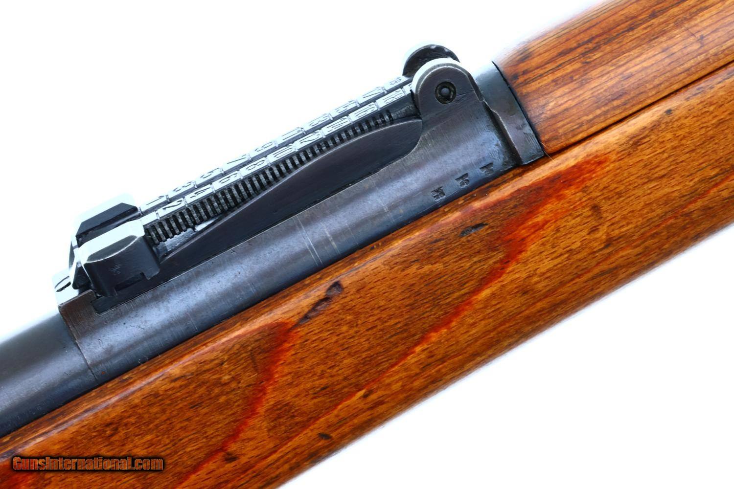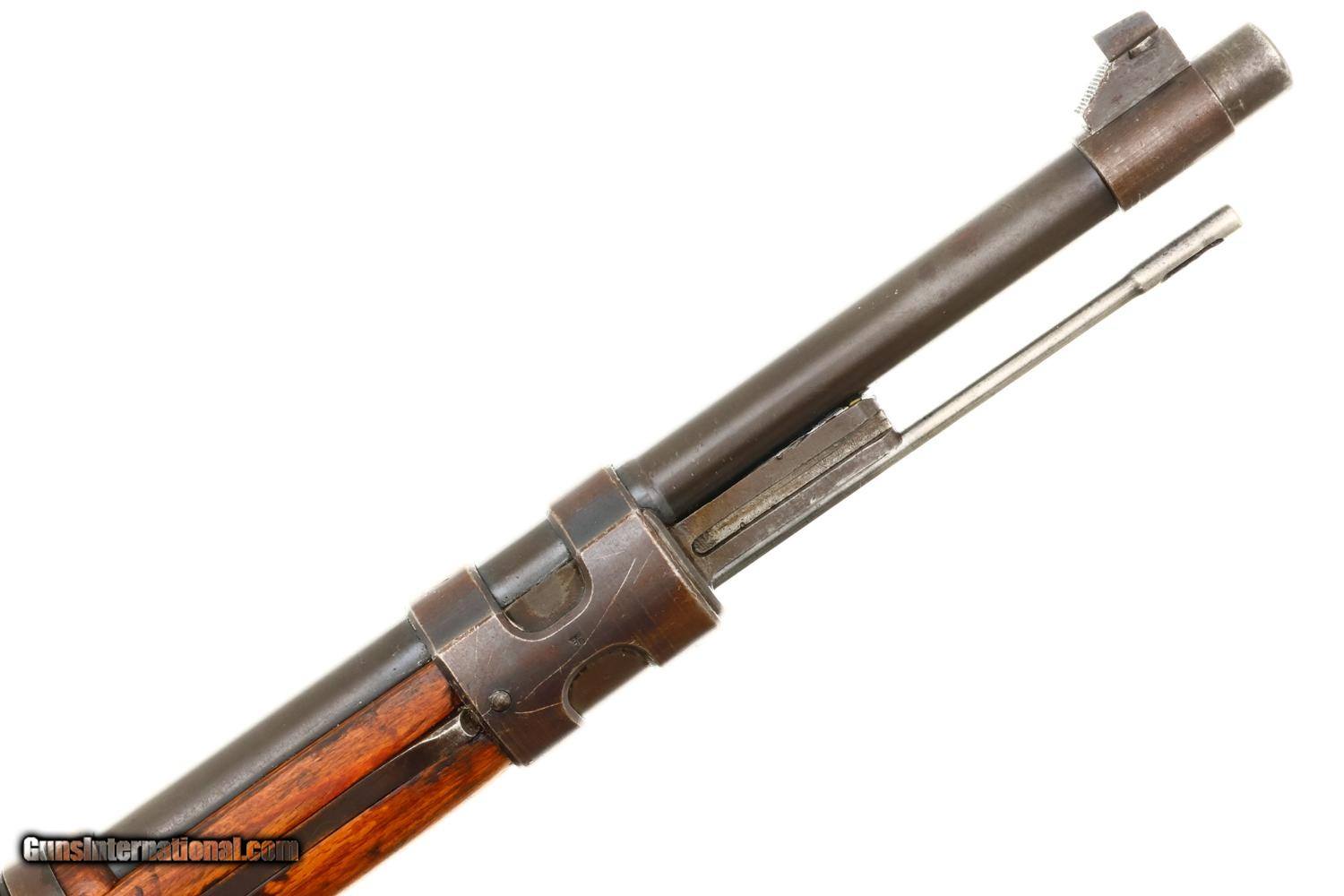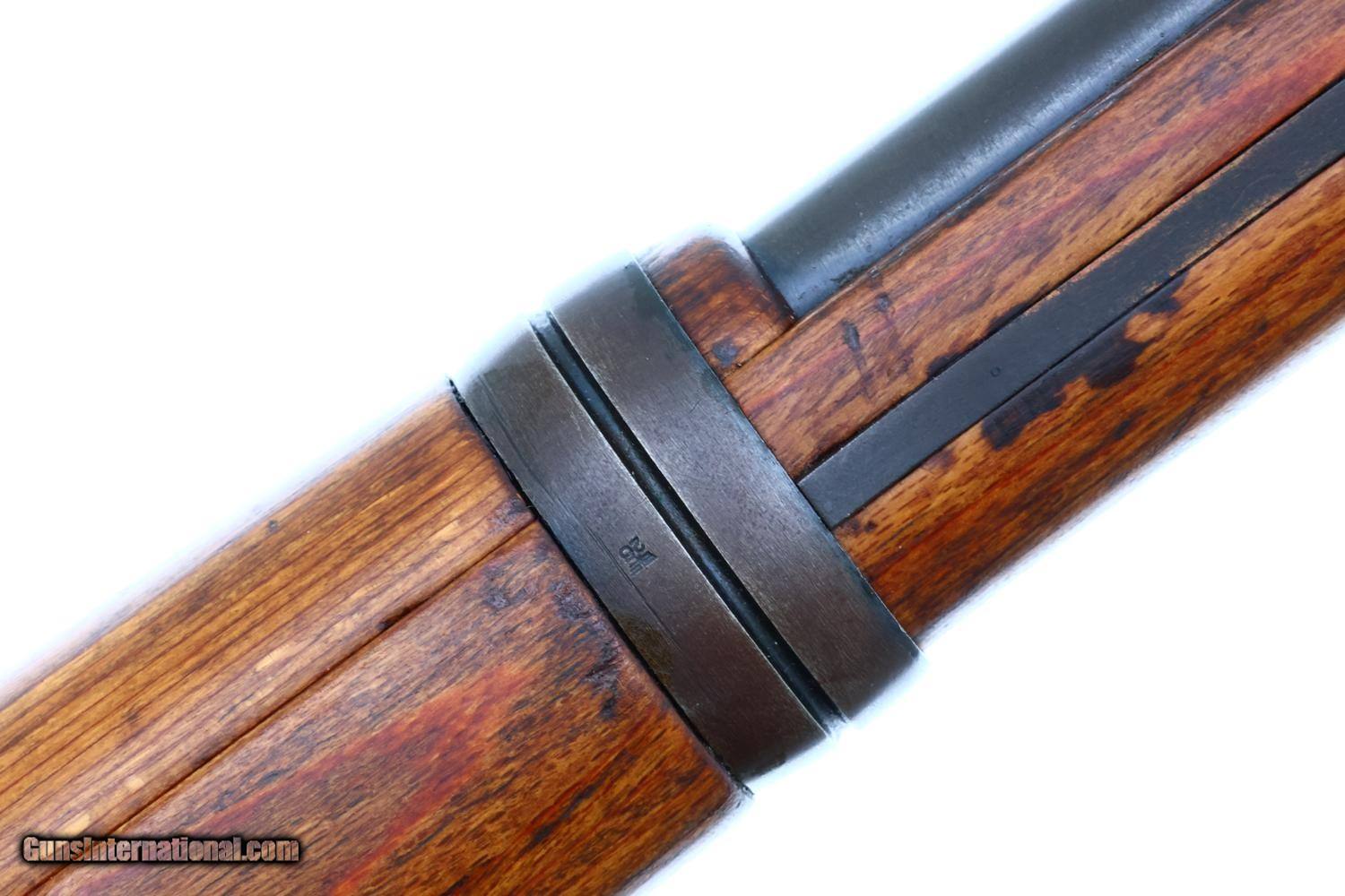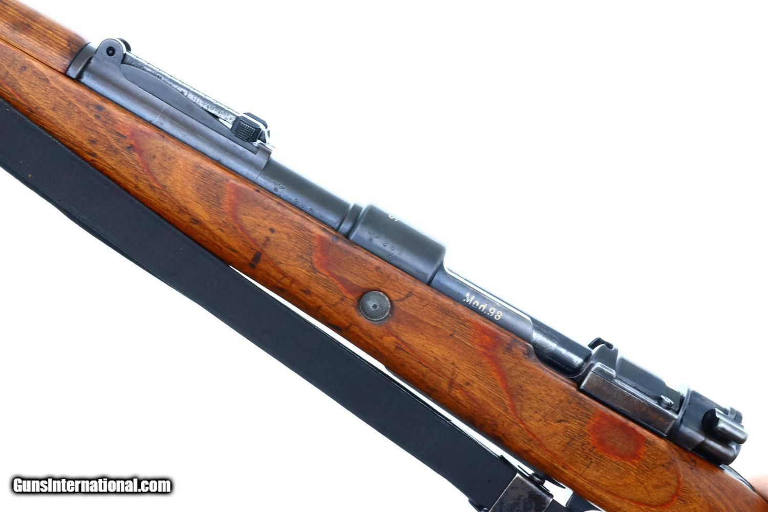 Description: Synopsis: This Berlin-Lubecker K98k is German WWII military rifle made 1938, cal. 8mm, all visible numbers matching, with bright bore and a correct sling. A classic World War II military rifle! Description: Berlin-Lubecke K98k made in 1938 for the German military. Standard configuration rifle with horizontally adjustable, inverted V front sight and tangent rear sight graduated from 1-20. Chamber coded S/237 along with the production year 1938. The left side of the receiver ring was marked with the full serial number 363b that was carried through to all visible/normally matching parts (except cleaning rod) including the bayonet lug, both barrel bands, tangent rear sight, barrel, receiver, all components of the trigger guard and floor plate, all components of the bolt assembly, the magazine follower, and even the butt plate. Cleaning rod #75. Complete with leather sling. Condition: VG with wear as one would expect from a carried gun that was in service throughout World War II. Areas of usual contact and use with toning and early thinning, especially around the forward barrel band and components of the trigger guard, floorplate, and butt plate. Stock and hand guard have been lightly sanded and refinished, the markings on the right side of the butt stock barely discernible. Action was not removed from the stock. Sling is dark and oil soaked. Surprisingly bright bore with strong rifling. Correct manual mechanics. A classic K98k made by Berlin Lubeck in 1938 and used by the German military throughout World War II. SOLD Manufacturer: Berlin-Lubecker Model: K98K Serial Number: 363b Caliber Info: 8mm Condition: VG |
