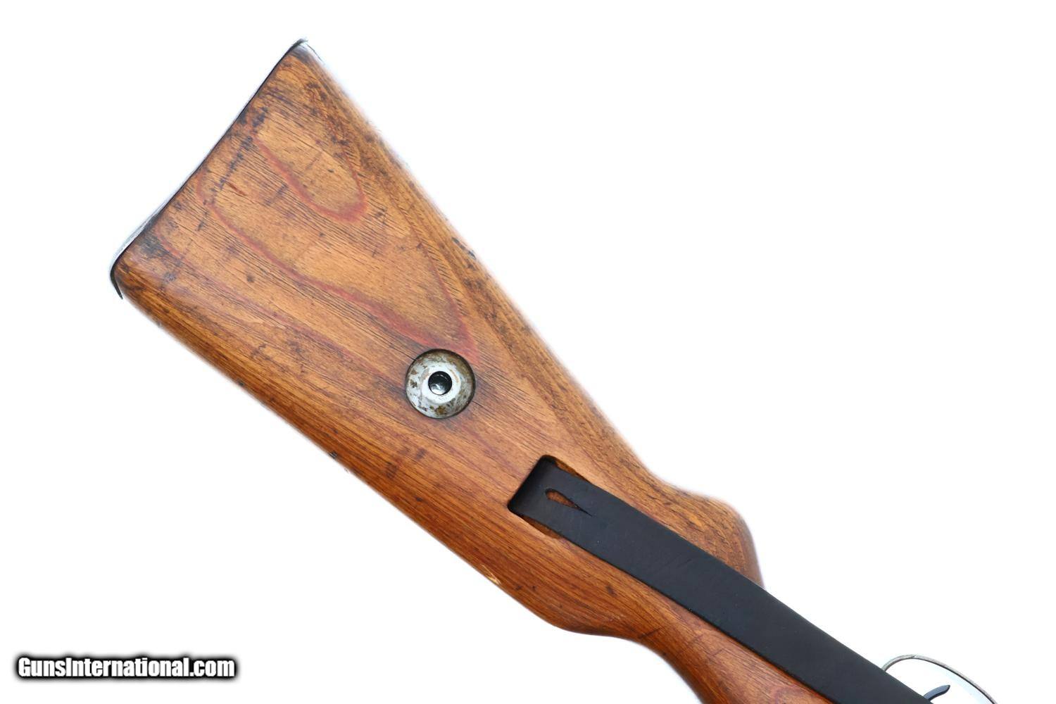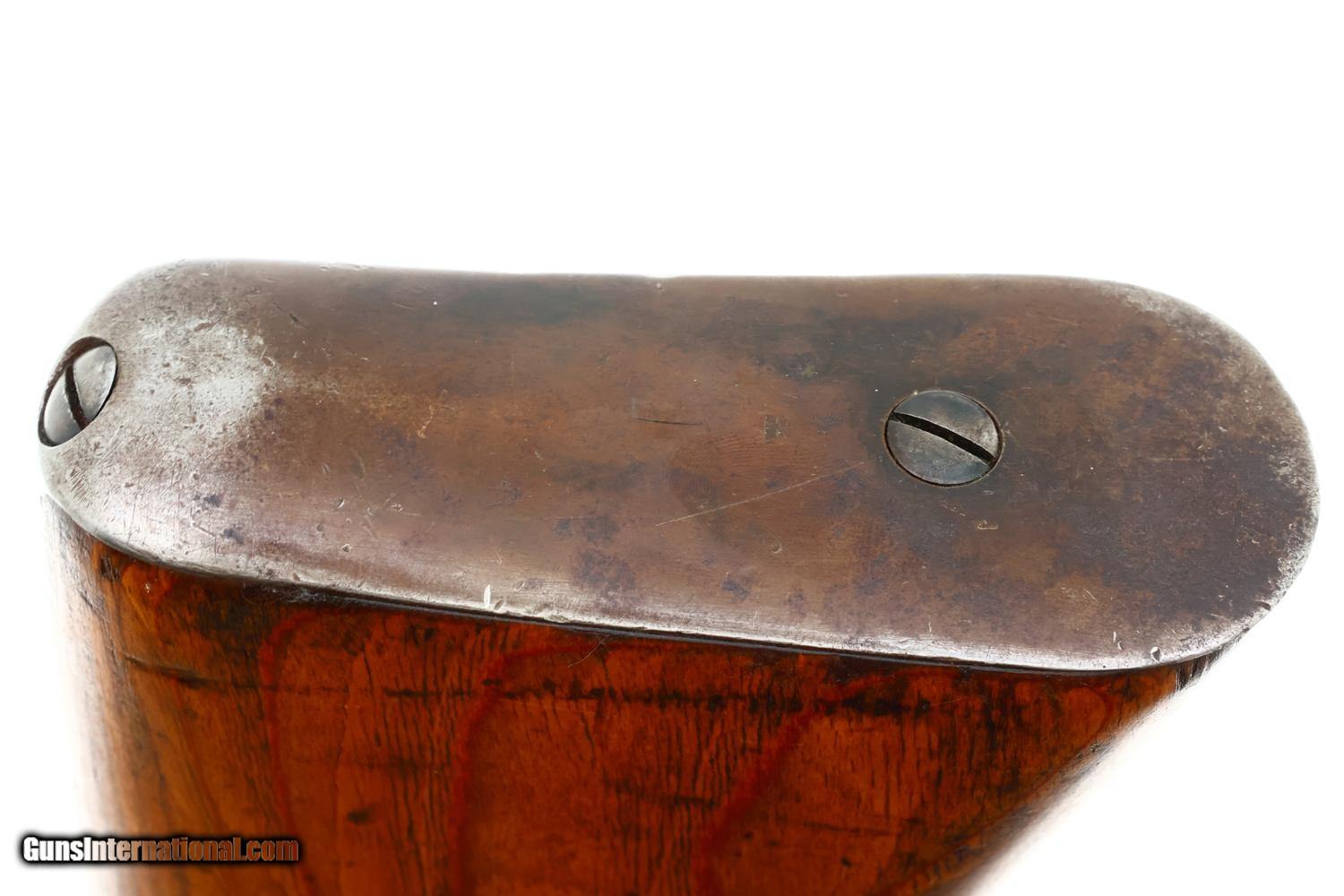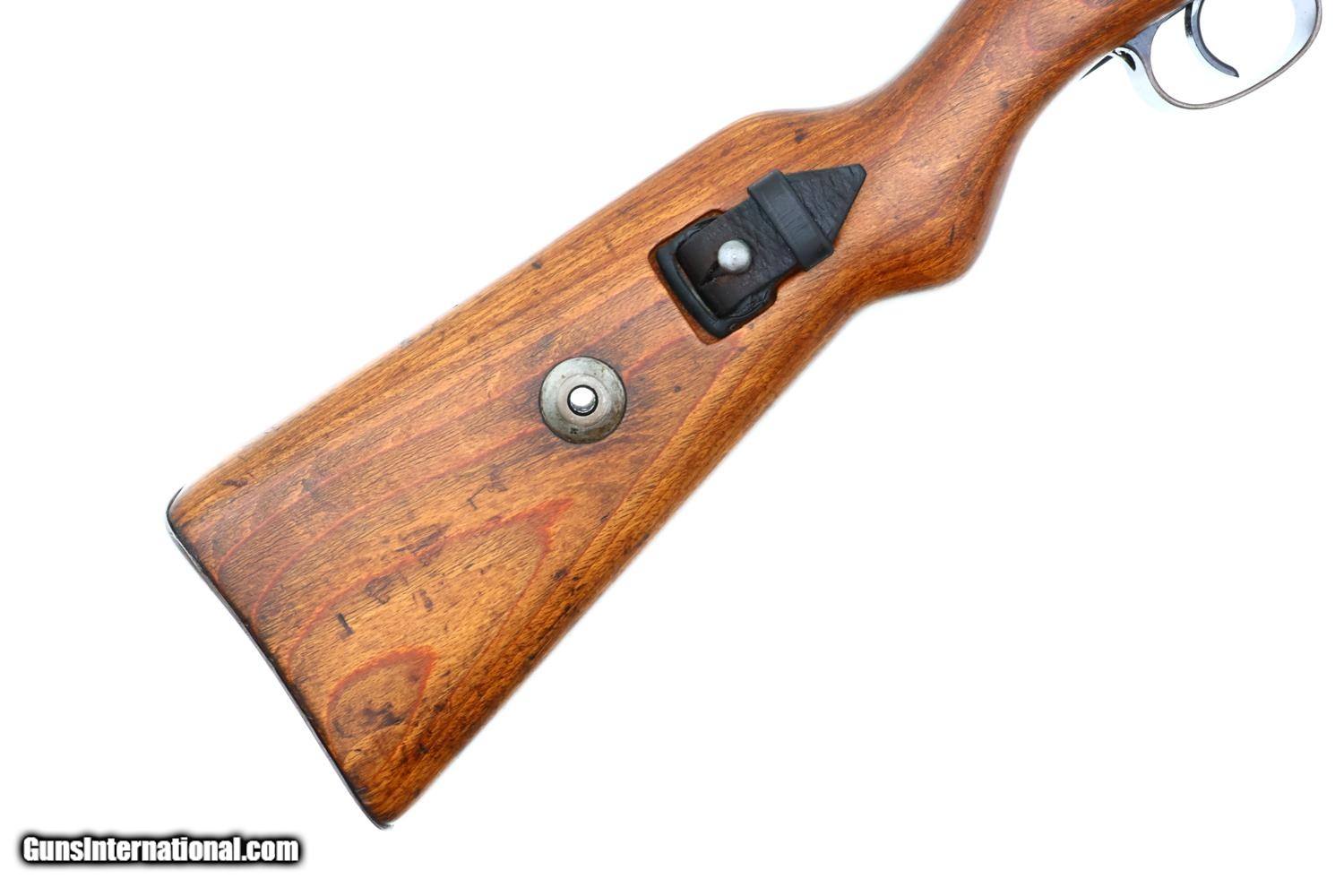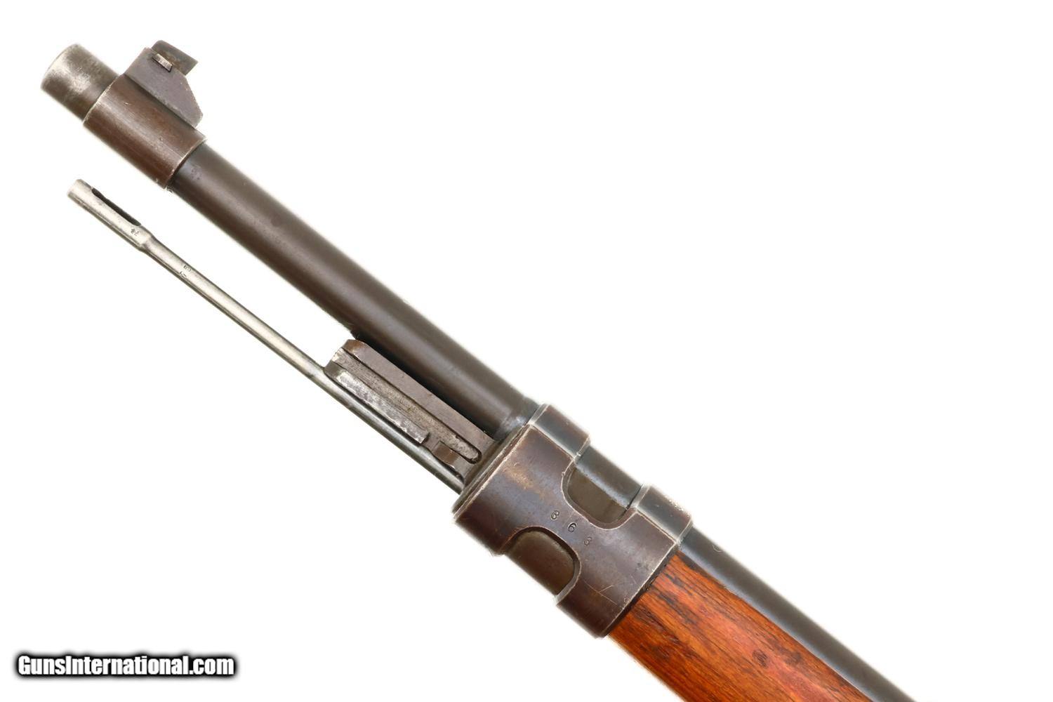 Description: Synopsis: This Berlin-Lubecker K98k is German WWII military rifle made 1938, cal. 8mm, all visible numbers matching, with bright bore and a correct sling. A classic World War II military rifle! Description: Berlin-Lubecke K98k made in 1938 for the German military. Standard configuration rifle with horizontally adjustable, inverted V front sight and tangent rear sight graduated from 1-20. Chamber coded S/237 along with the production year 1938. The left side of the receiver ring was marked with the full serial number 363b that was carried through to all visible/normally matching parts (except cleaning rod) including the bayonet lug, both barrel bands, tangent rear sight, barrel, receiver, all components of the trigger guard and floor plate, all components of the bolt assembly, the magazine follower, and even the butt plate. Cleaning rod #75. Complete with leather sling. Condition: VG with wear as one would expect from a carried gun that was in service throughout World War II. Areas of usual contact and use with toning and early thinning, especially around the forward barrel band and components of the trigger guard, floorplate, and butt plate. Stock and hand guard have been lightly sanded and refinished, the markings on the right side of the butt stock barely discernible. Action was not removed from the stock. Sling is dark and oil soaked. Surprisingly bright bore with strong rifling. Correct manual mechanics. A classic K98k made by Berlin Lubeck in 1938 and used by the German military throughout World War II. SOLD Manufacturer: Berlin-Lubecker Model: K98K Serial Number: 363b Caliber Info: 8mm Condition: VG |