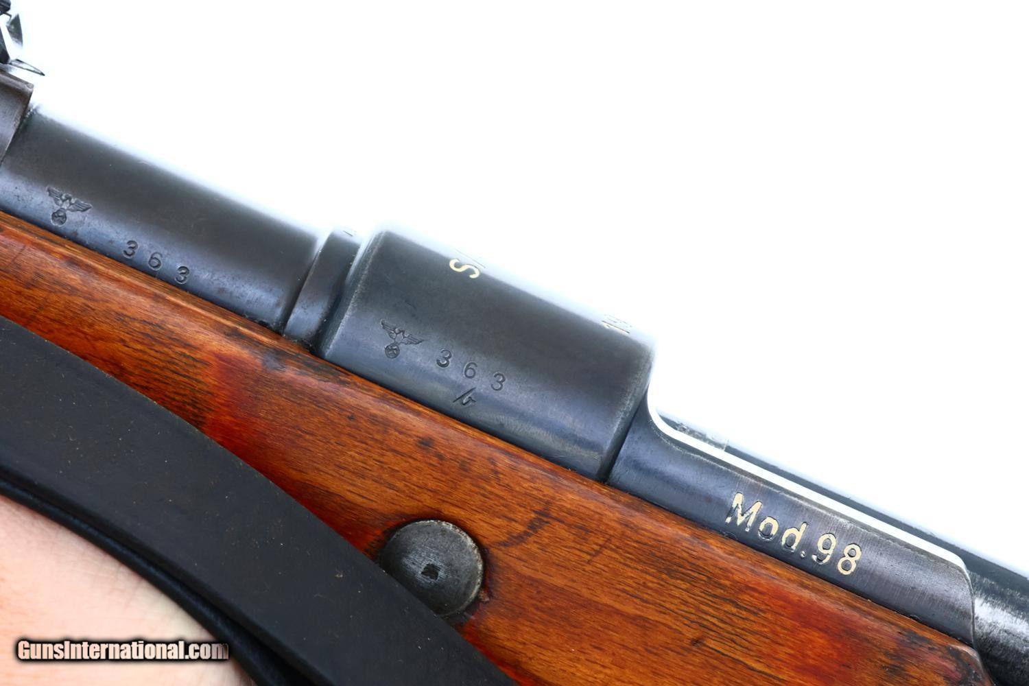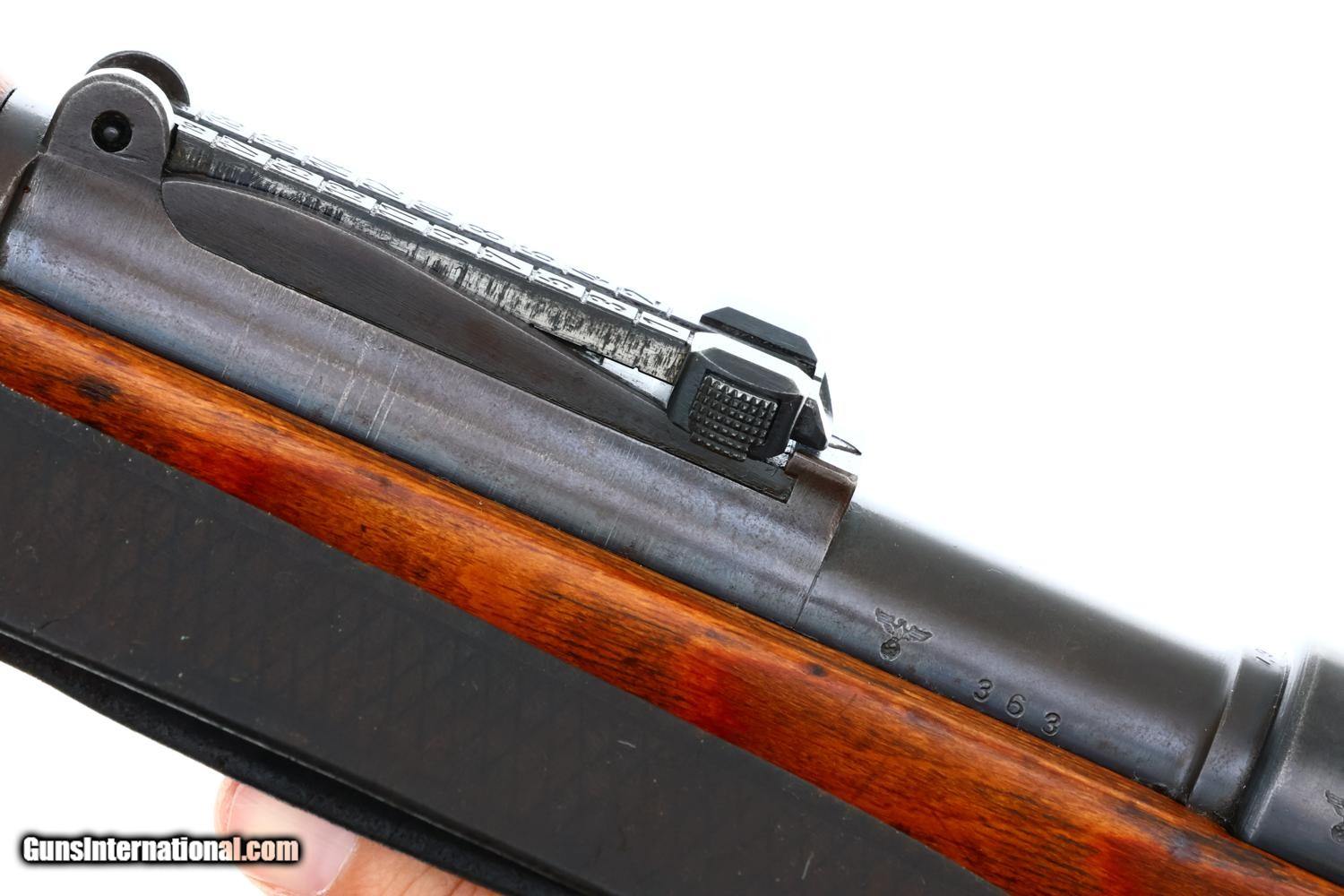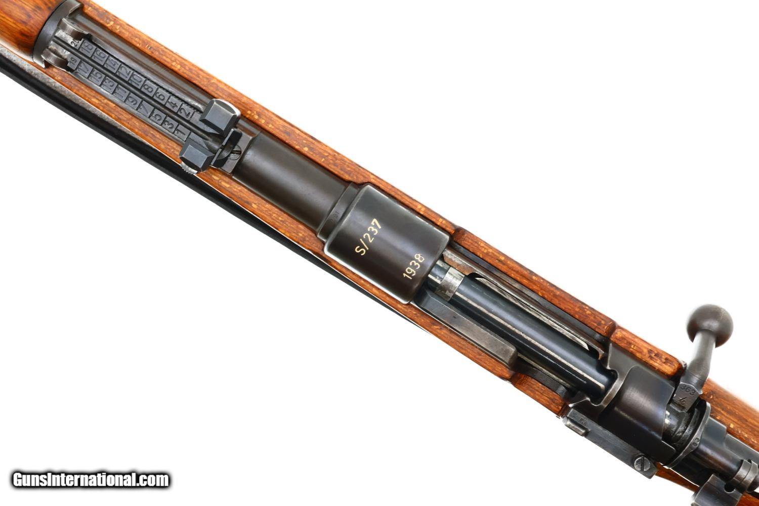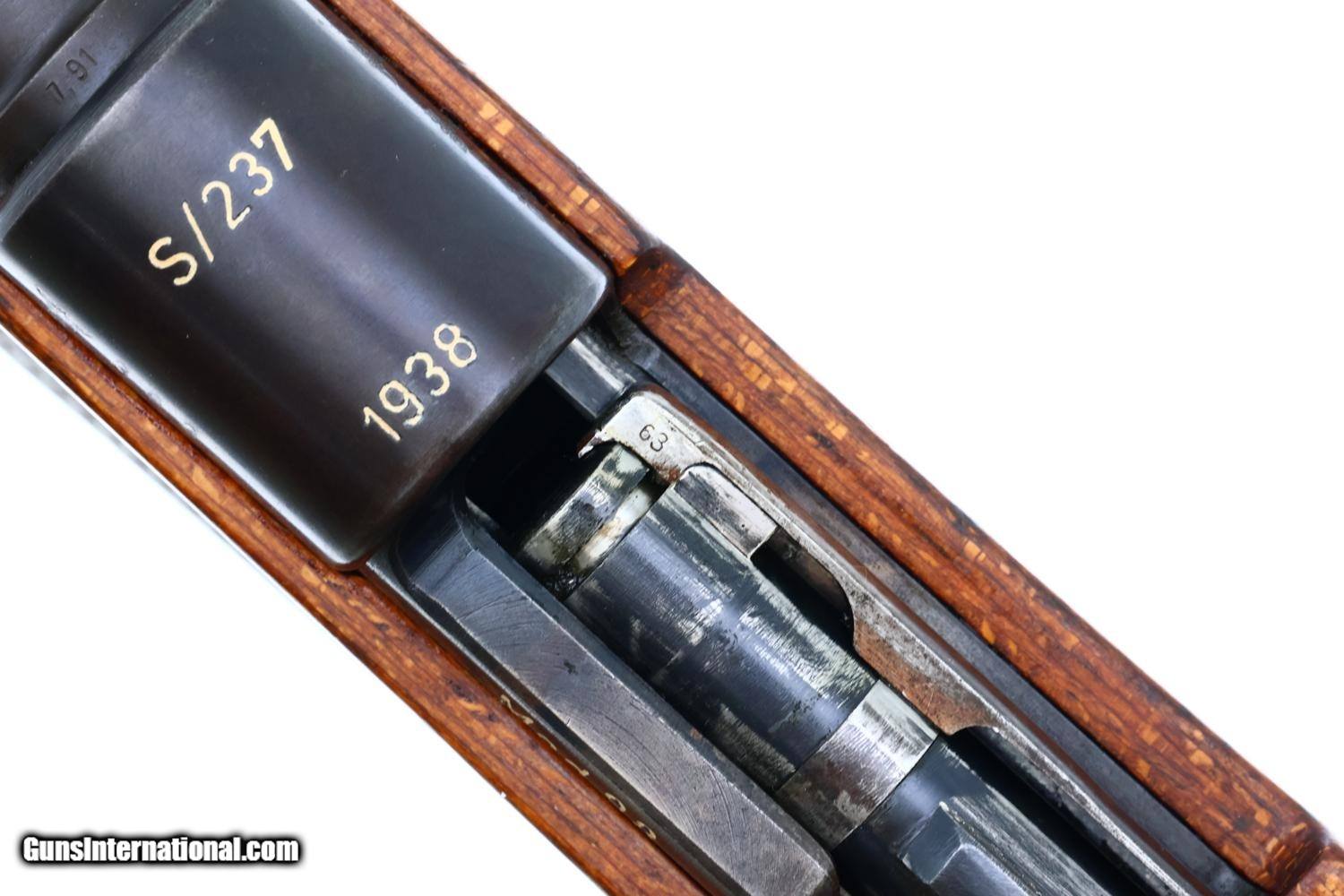 Berlin-Lubecke K98k made in 1938 for the German military. Standard configuration rifle with horizontally adjustable, inverted V front sight and tangent rear sight graduated from 1-20. Chamber coded S/237 along with the production year 1938. The left side of the receiver ring was marked with the full serial number 363b that was carried through to all visible/normally matching parts (except cleaning rod) including the bayonet lug, both barrel bands, tangent rear sight, barrel, receiver, all components of the trigger guard and floor plate, all components of the bolt assembly, the magazine follower, and even the butt plate. Cleaning rod #75. Complete with leather sling.