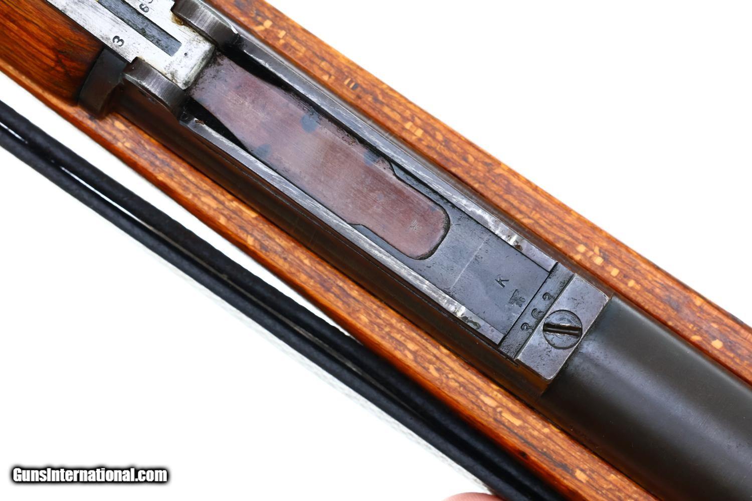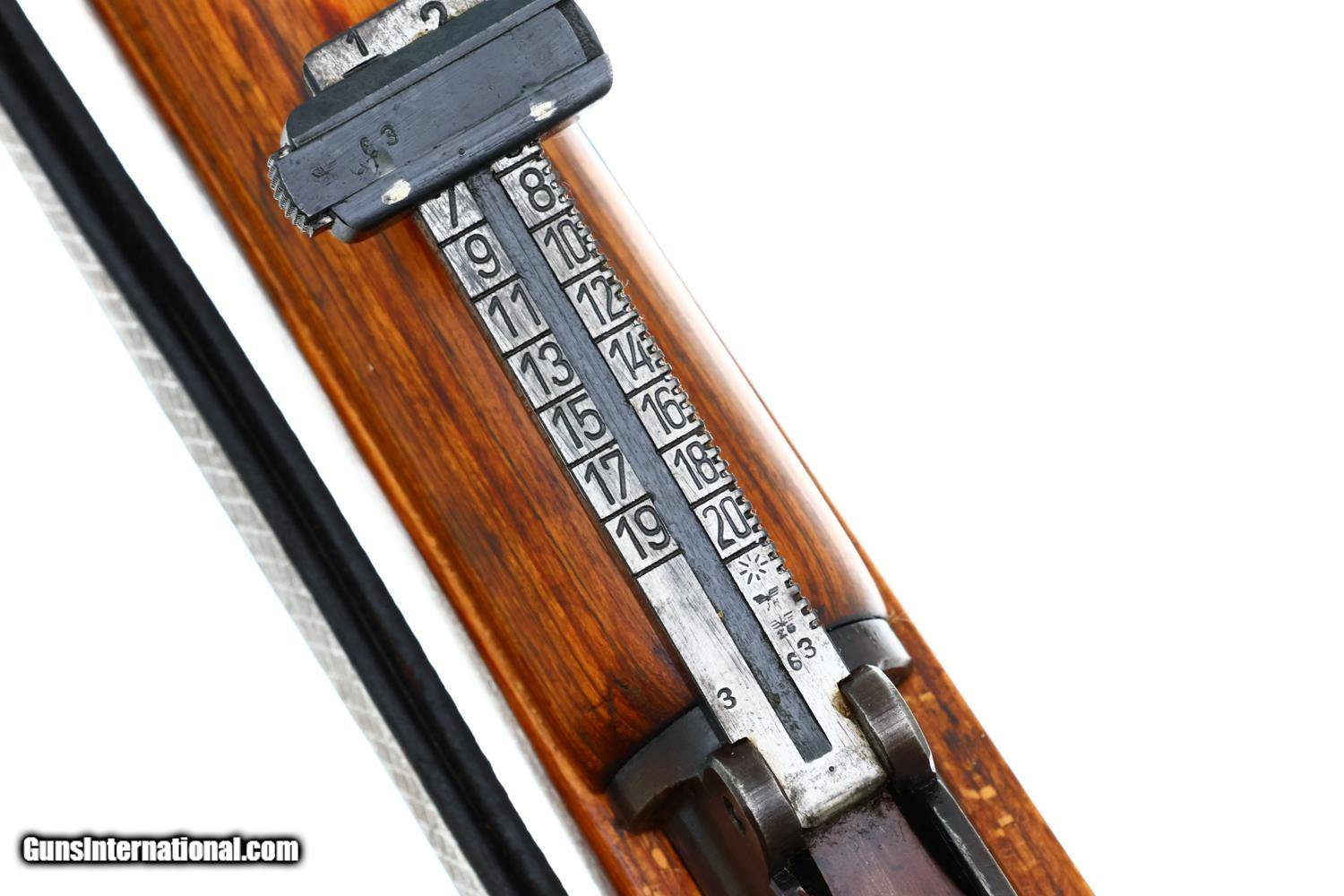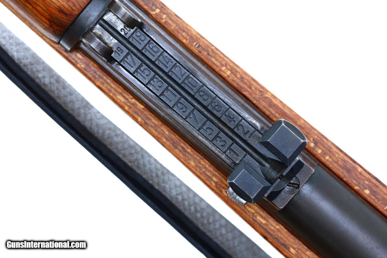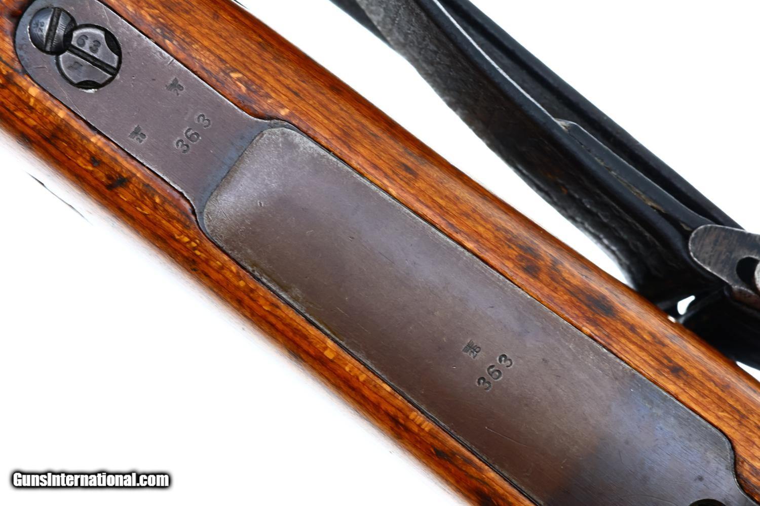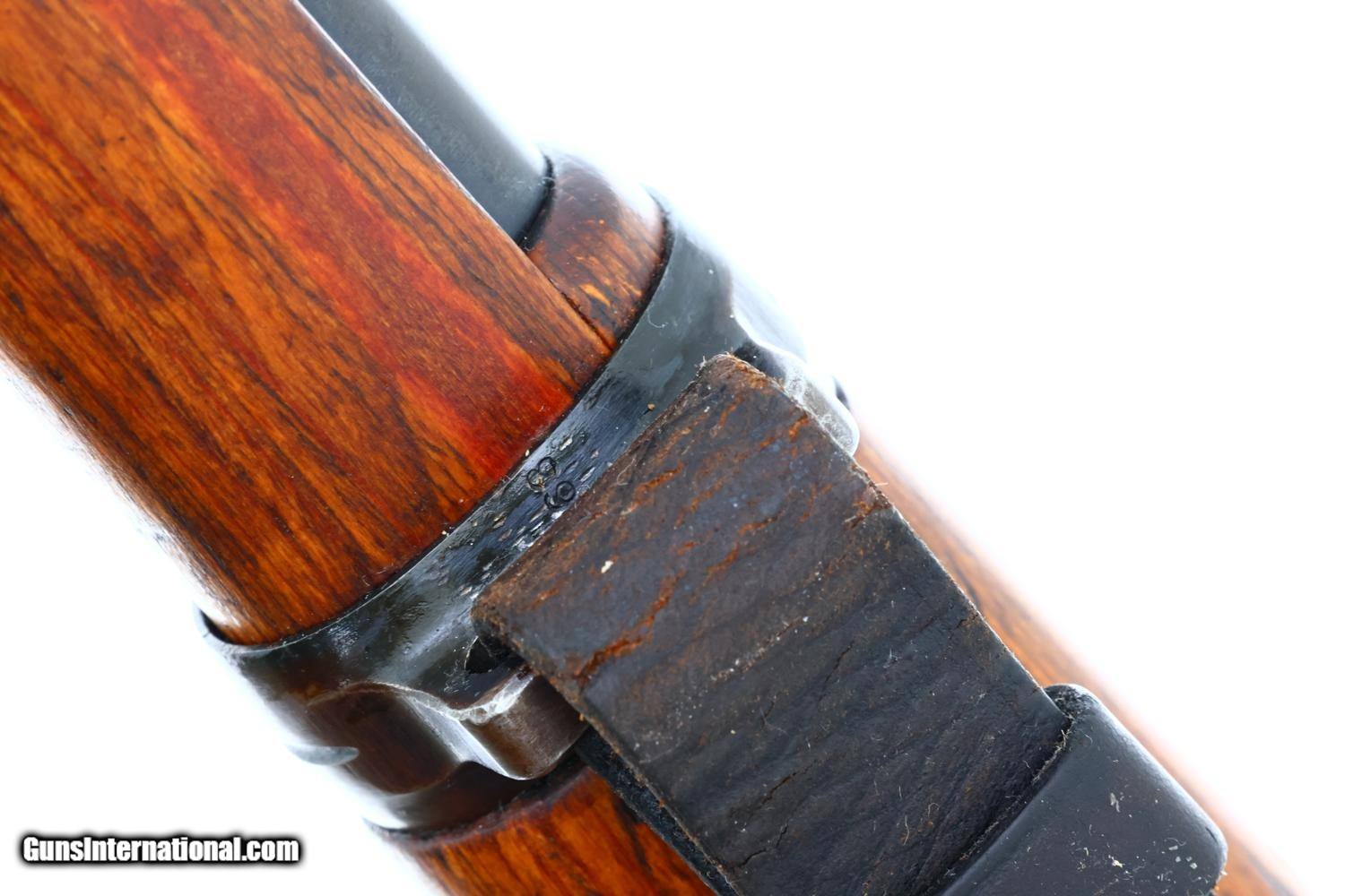 Berlin-Lubecke K98k made in 1938 for the German military. Standard configuration rifle with horizontally adjustable, inverted V front sight and tangent rear sight graduated from 1-20. Chamber coded S/237 along with the production year 1938. The left side of the receiver ring was marked with the full serial number 363b that was carried through to all visible/normally matching parts (except cleaning rod) including the bayonet lug, both barrel bands, tangent rear sight, barrel, receiver, all components of the trigger guard and floor plate, all components of the bolt assembly, the magazine follower, and even the butt plate. Cleaning rod #75. Complete with leather sling.