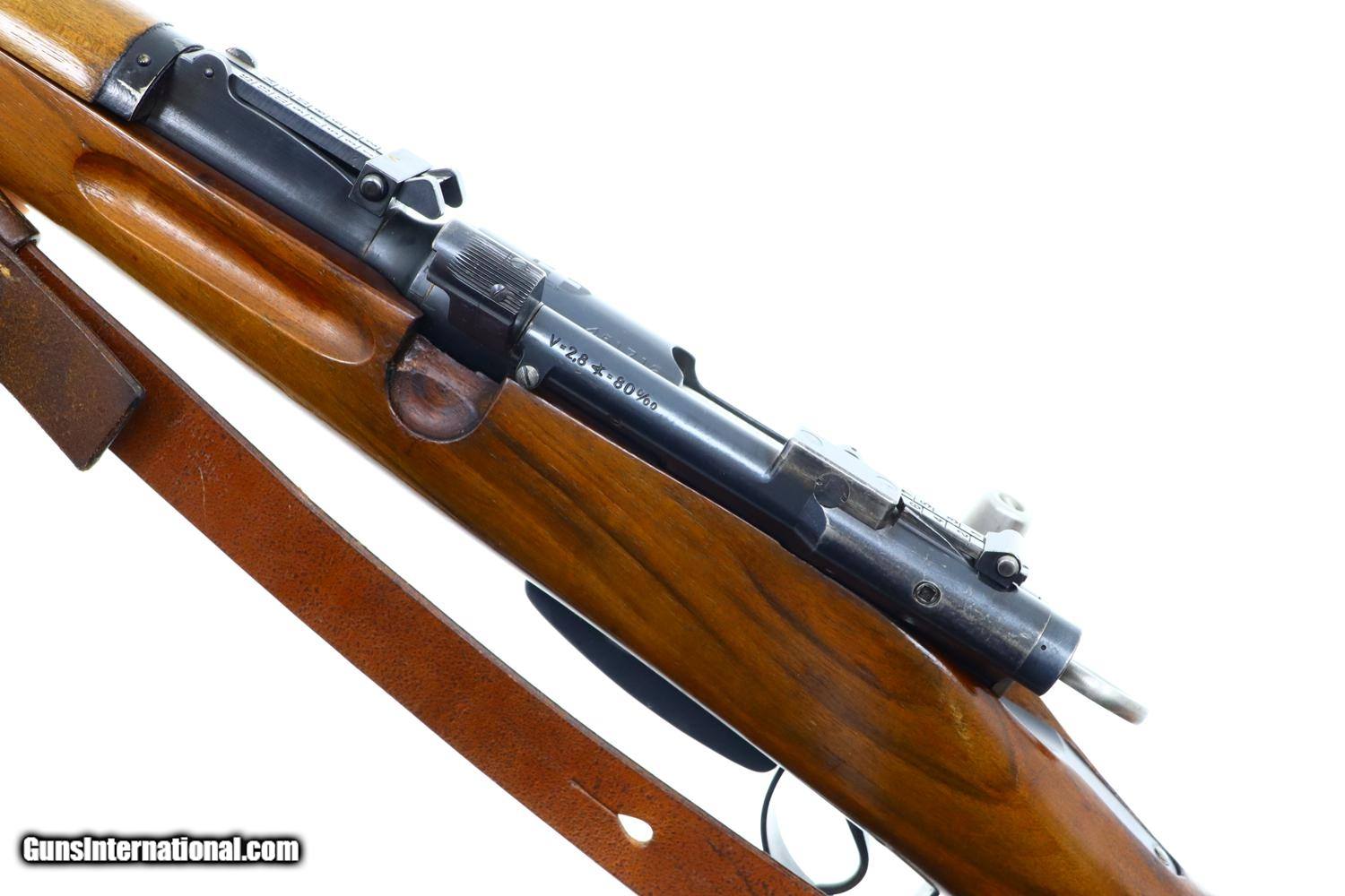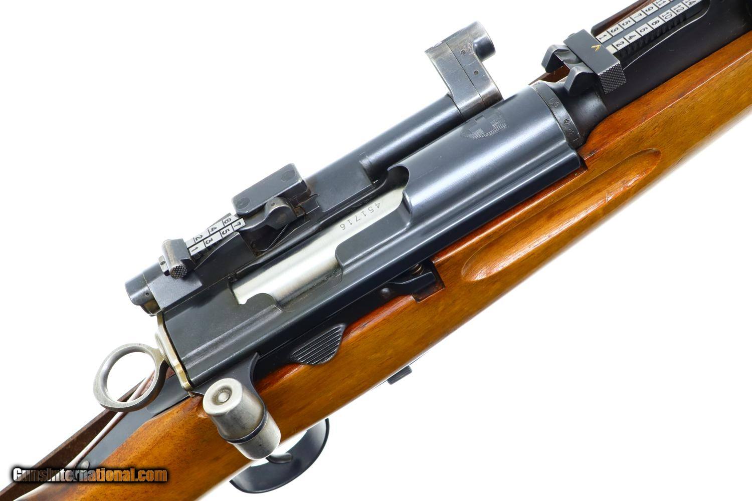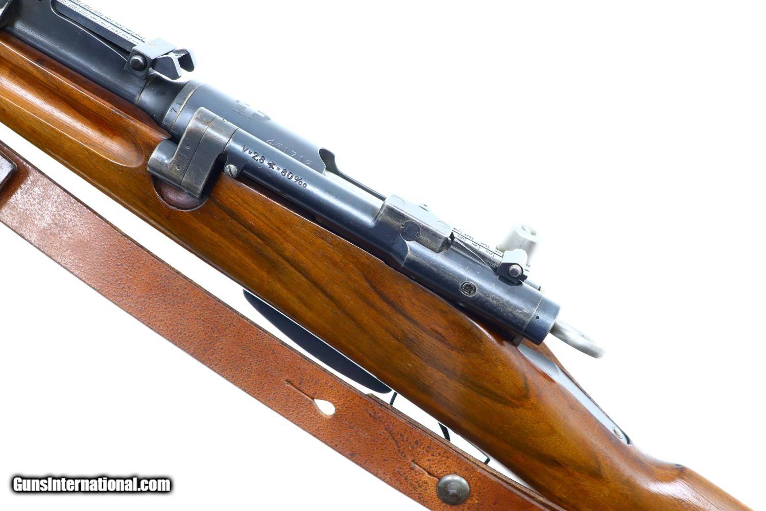 Description: Wonderful Swiss Bern K31/43 Military sniper rifle with sight gradations 1-7 and the far more desirable 2.8 power scope, this example made in 1943. Matching barrel, receiver, bolt, and magazine. Combination brass/steel muzzle cap and military marked sling dated 1963. Synopsis: Excellent Swiss Bern K31/43 Military sniper rifle, 451716, I-1143 Condition: VG-EXC original blue with thinning and sharp edge wear as one might expect from a military rifle that has seen relatively light use. The stock has been lightly revarnished but does not appear to have been sanded. Slightly hazy optics as typical for the K31 sniper rifles but much clearer than the vast majority of these rifles. Bright bore with sharp rifling. Perfect manual mechanics. Excellent later-dated sling. A beautiful rifle that should please the most discerning collector. ~~Insured shipping fee of $50; most packages shipped using FedEx 2nd Day.~~ SOLD Curio/Relic: Yes Manufacturer: Bern Serial Number: 451716 Caliber Info: 7.5x55 |