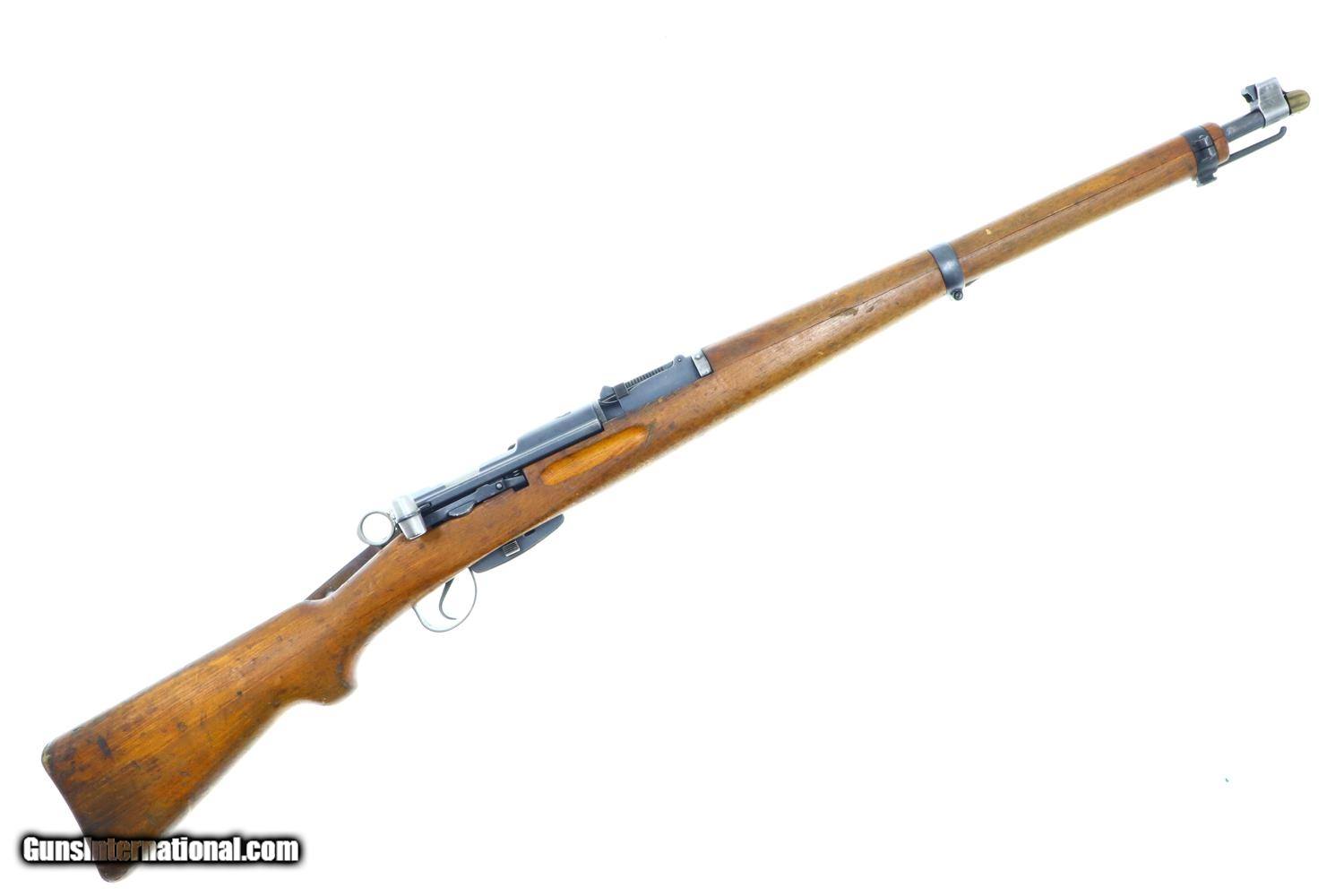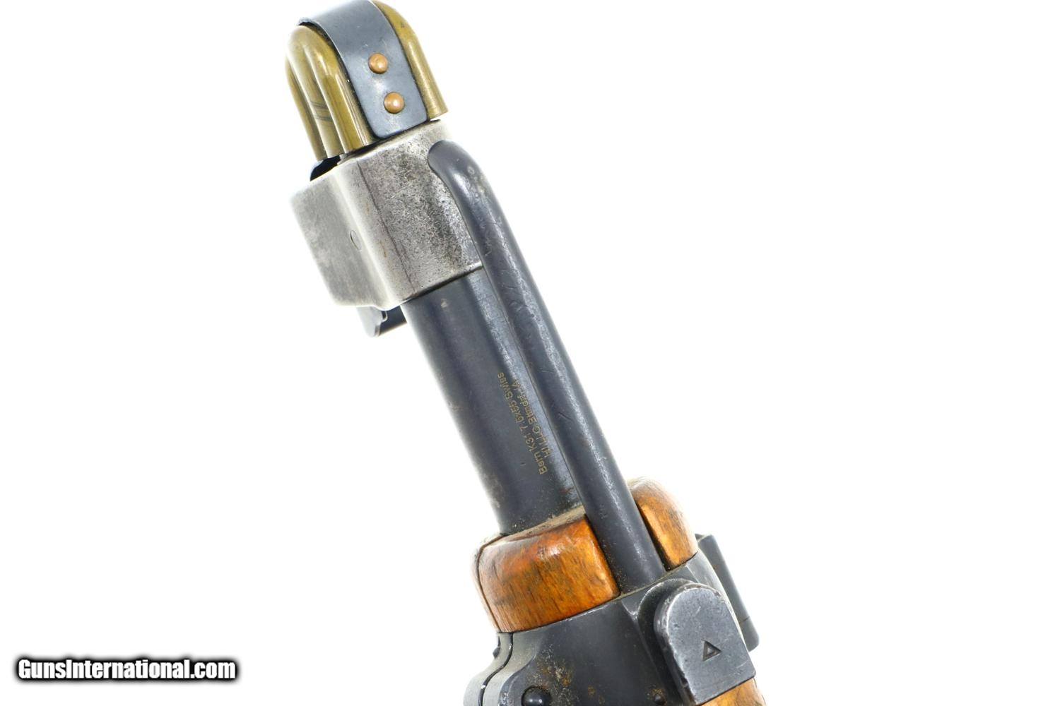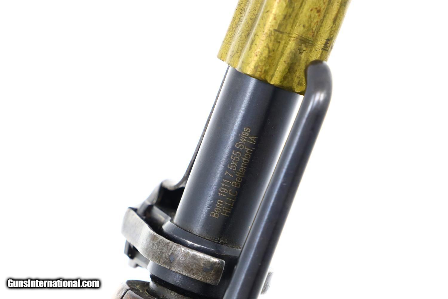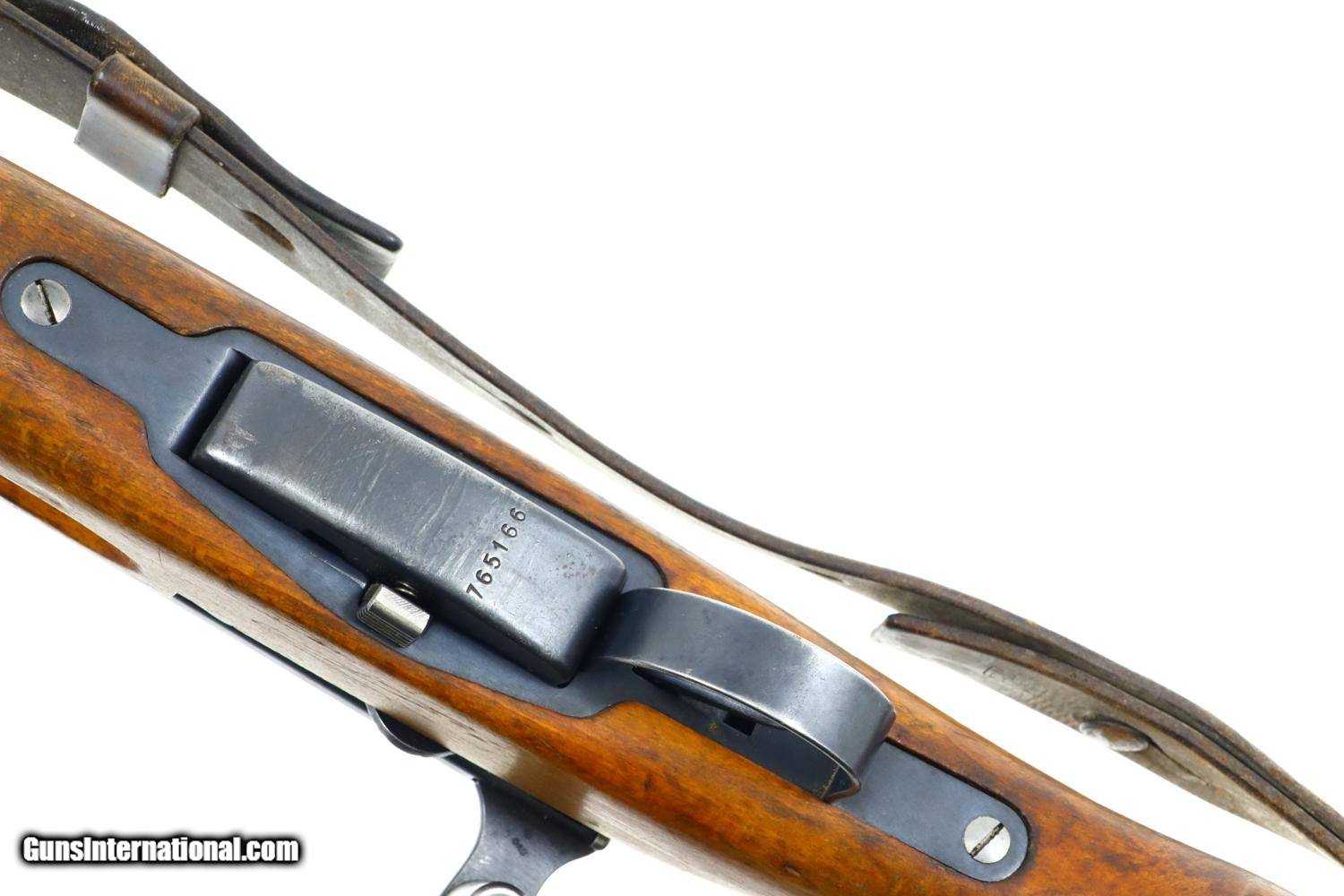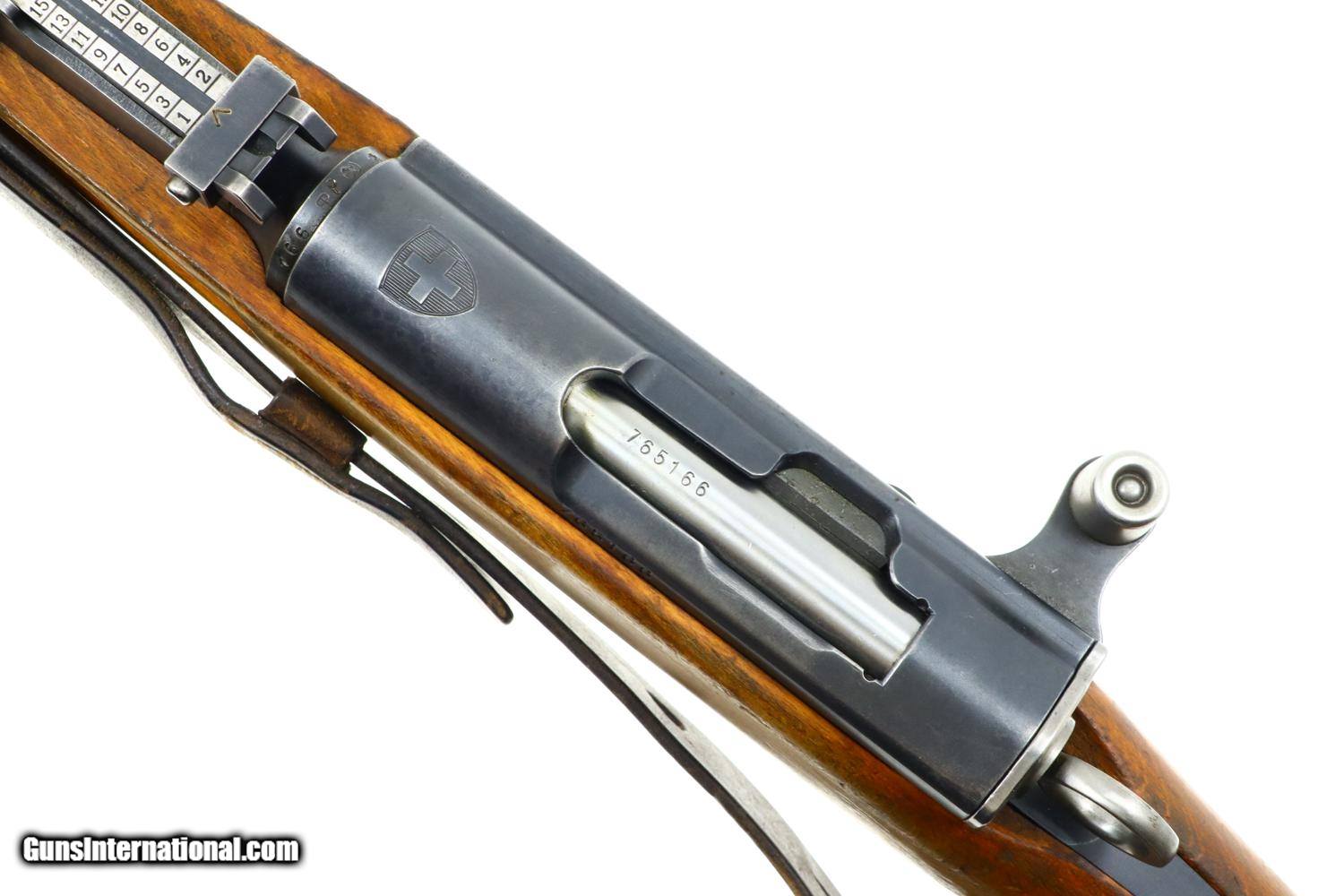 Description: Standard configuration and externally matching Bern K31 rifle, made 1943, with tangent rear sight graduated 1-15, straight pull bolt, detachable magazine, brass muzzle cap and metal buttplate. The left side of receiver is marked 765166 the same number repeated on the bolt and on the bottom of the magazine, the last three digits on the barrel that is import marked. Beech stock, military proofed. Metal buttplate. Military Sling date not discernible. Synopsis: Bern, K31, Swiss Military Rifle, 765166, I-1038 Condition: VG+ condition with handling and fading commensurate with a rifle that has seen moderate service use. Near mirror bore with sharp rifling. Perfect manual mechanics. A classic Swiss military rifle in VG+ condition with a great bore and muzzle cap. ~~Insured shipping fee of $75; most packages shipped using FedEx 2nd Day.~~ SOLD Manufacturer: Bern Serial Number: 765166 Caliber Info: 7.5x55 |