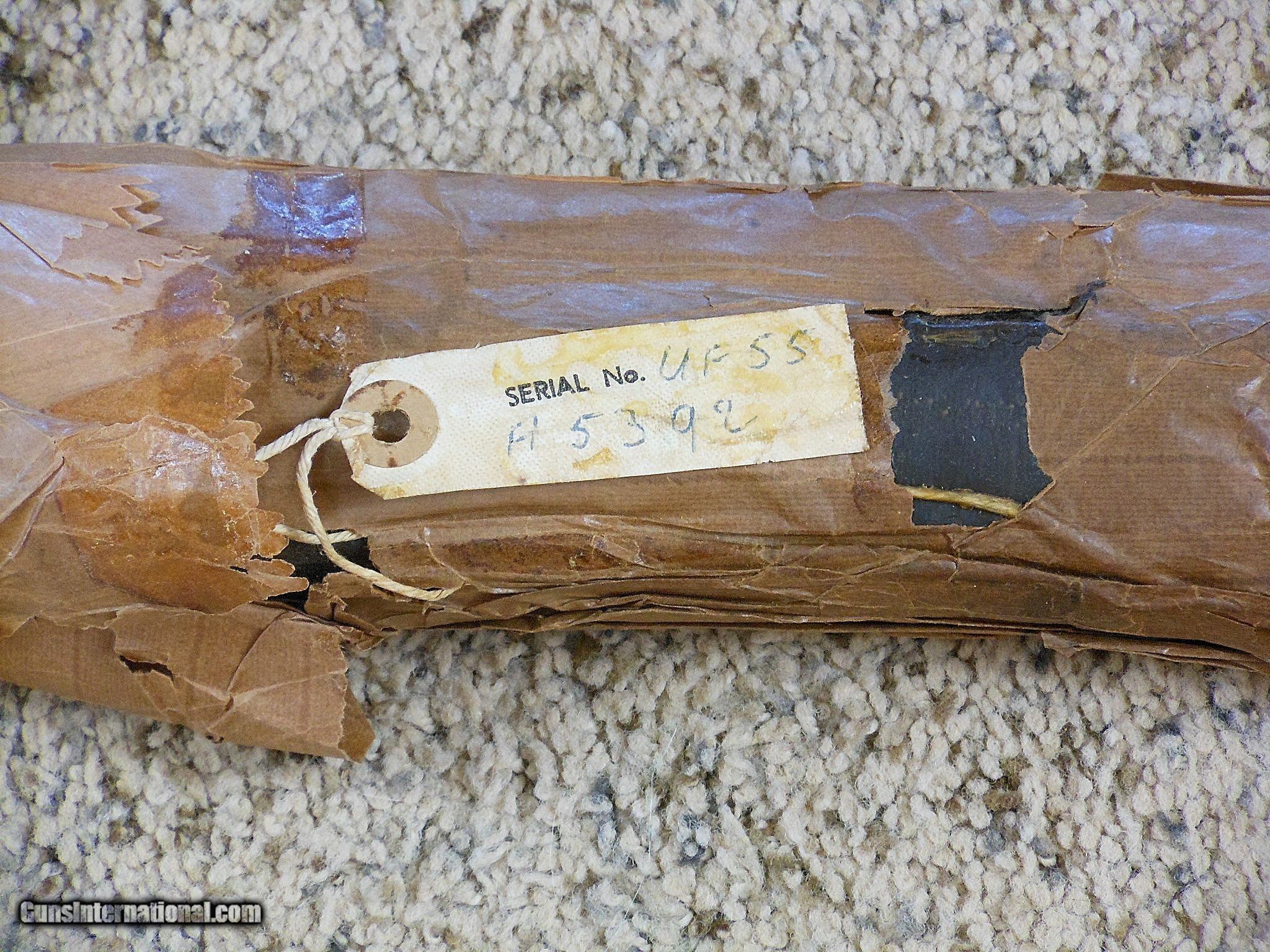 Description: This is the last model Lee Enfield to be produced. It was produced by the Royal Ordnance Factory At Fazakerley, Liverpool England. It is chambered for the British 303 rimmed service cartridge. The rifle's serial number is U F 55 - H 5392. As stated, this rifle is in the original arsenal protective wrapping. This gun is as new from the arsenal and would be all matched numbers as well as the magazine. I cannot tell the year of production as the reciever is still in the wrapping. On the outside of the wrapping is the serial number tag and lot numbers. The wrapping is partially open by the rifle's muzzle. Otherwise the wrapping is intact. These are well made rifles with good quality sights. Here is a brand new never issued still in the protective wrapping British Enfield! This would be a great addition for the military collector for display! There cannot be many of these new condition rifles left today. Search For hlvfineguns on google for more details. Curio&Relic W.T. Consn. (9) F. No. 407 -18 SOLD Curio/Relic: Yes Manufacturer: Royal Arsenal At Fazakerley Model: Model 4 Number 2 Serial Number: U F 55 H 5392 Caliber Info: 303 British Condition: New Metal Condition: New Wood Condition: New Bore Condition: New Barrels: 24 Inch Barrel Type: Rifle Action: Bolt Manufacture Date: 1950's |