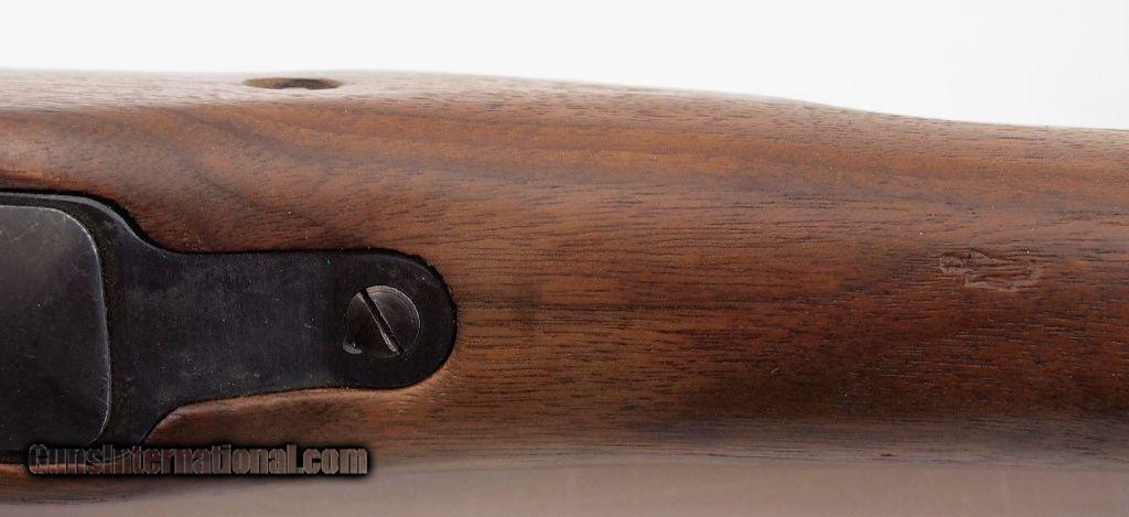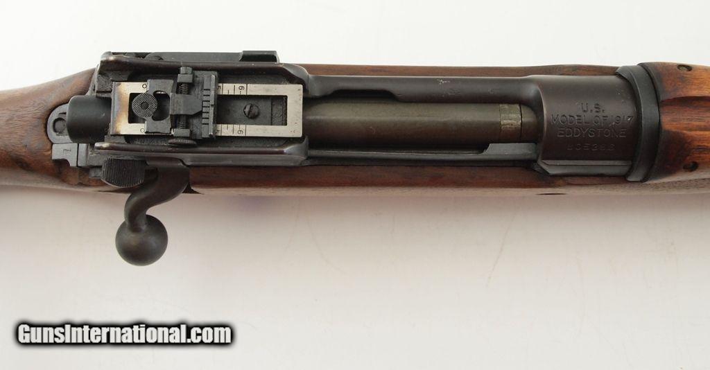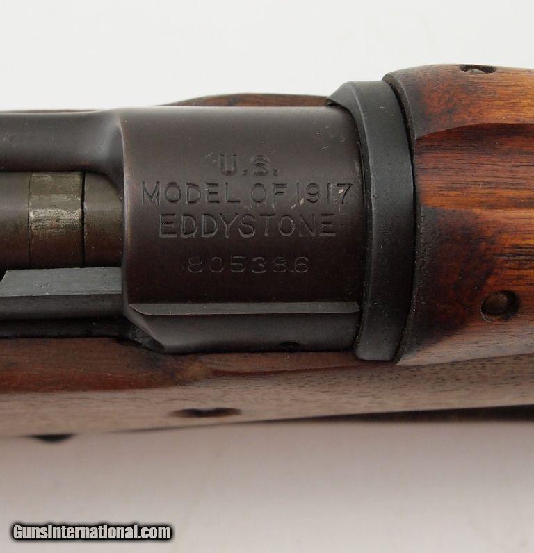 Description: Eddystone US 1917 MFG 1918 .30-06, 26" bbl, bright shiny bore, strong rifling, adjustable rear notch/peep sight, blade in military wings front sight, "U.S." - "MODEL OF 1917" - "EDDYSTONE" - "805386" is stamped on top of the receiver, flaming bomb stamped on left side of the receiver, "E" stamped on the bolt release, "E" - flaming bomb - "6-18" stamped on top of barrel near muzzle, nice smooth stock and covers with "2V" stamped behind trigger housing, an eagle head stamped in front of the trigger/magazine group, and metal butt plate with compartment door. Add 3% for Credit Card Shipping $30.00 SOLD Curio/Relic: Yes |