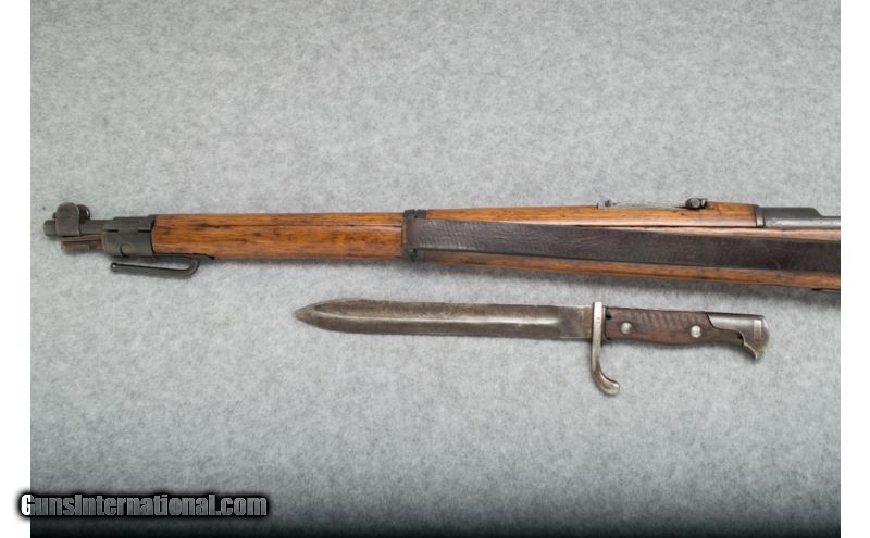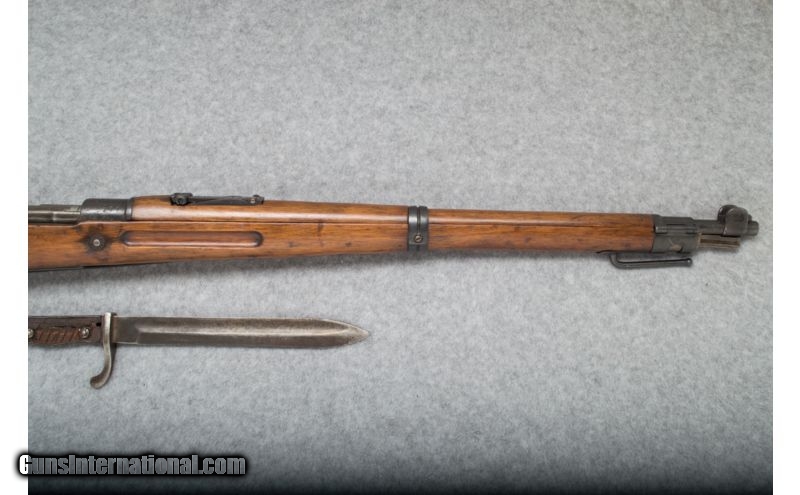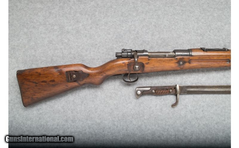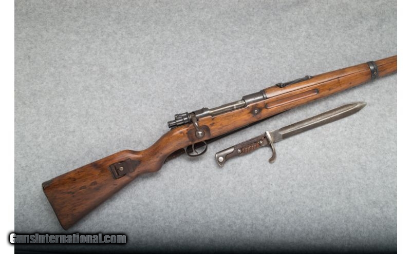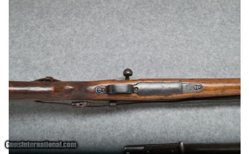 Description: Used. Matching numbers, except for bolt. SOLD Curio/Relic: Yes Manufacturer: Circa: 1917 Caliber Info: 8mm Mauser Metal Condition: Good, overall; some rust pitting on floorplate Wood Condition: Very good, overall Bore Condition: Fair; some pitting and corrosion near muzzle Barrels: 24 Triggers: Smooth steel Stock: Smooth pistol grip hardwood Stock Dimensions: LOP - 13 1/8 Fore End: Full length with barrel band and end cap; stacking hook Butt Pad: Steel butt plate Weight: 7 lbs. 10 oz. Sights: Adjustable rear; blade front with guard Extras: Butcher-style" bayonet(1917); leather sling. Item Location: Sun Prairie, WI |