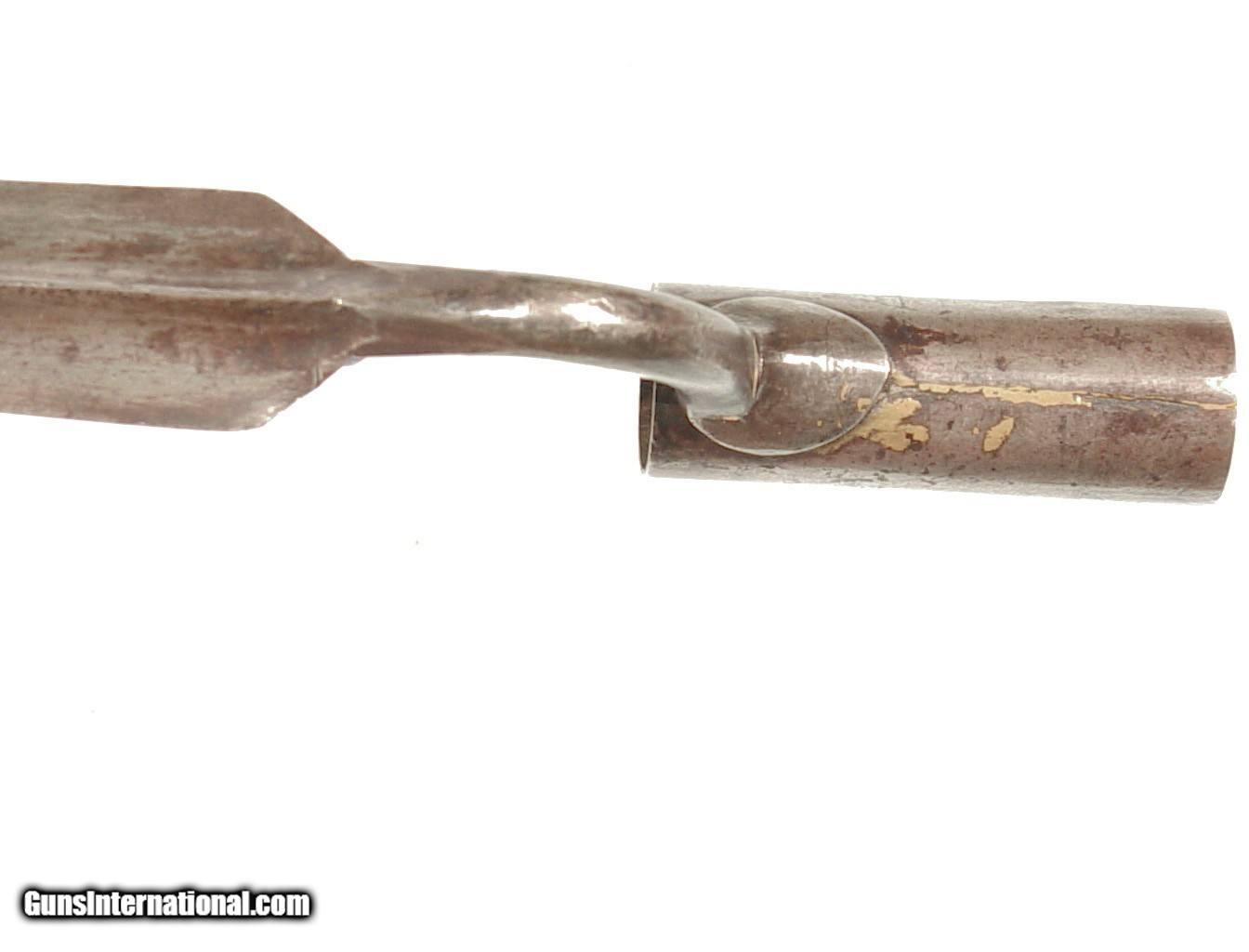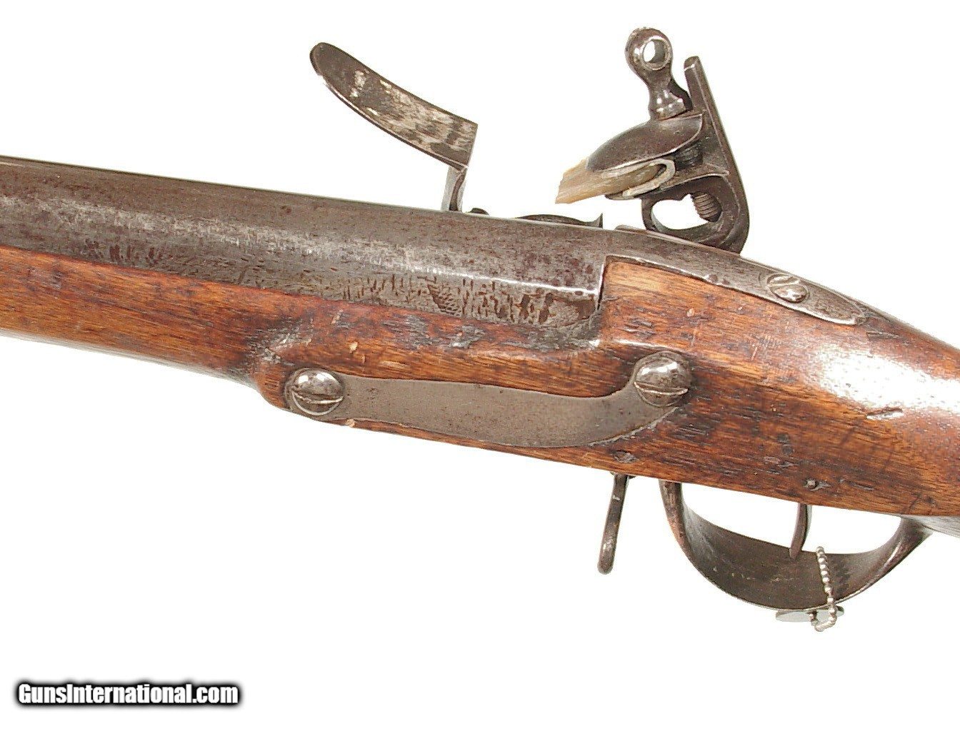 Description: .70 caliber, 42" barrel secured with the correct flat bands. Original flintlock with the convex lock marked " Manufactur / de St Etienne". Full length walnut stock. All of mounts of iron. In beautiful original condition with the metal surfaces showing a pleasing gun metal gray. The lock markings are very crisp and legible. Excellent stock showing the appropriate amount of ware and handling marks. Nice bore and mechanically sound. The accompanying bayonet is certainly of American mfg. and in comparable condition. SOLD Antique: Yes |