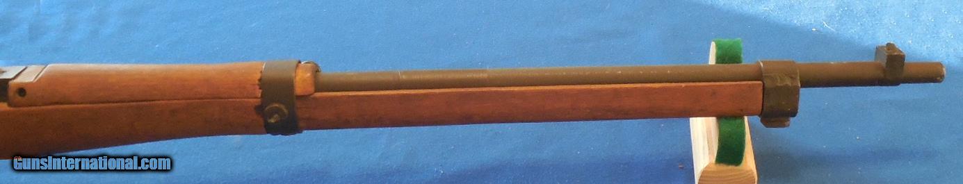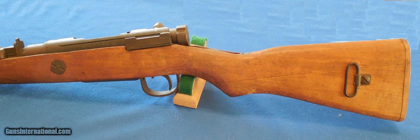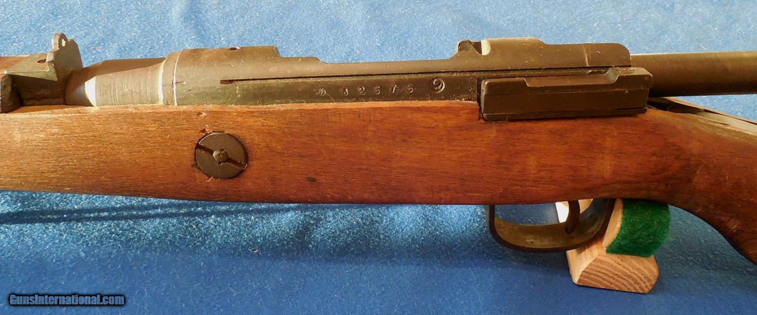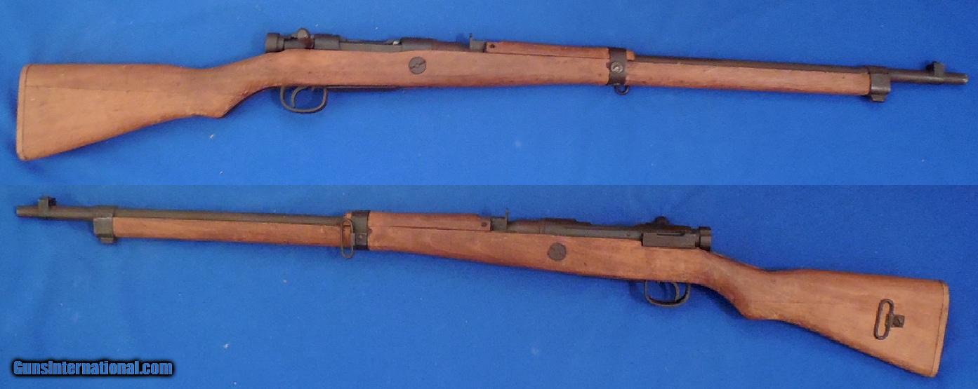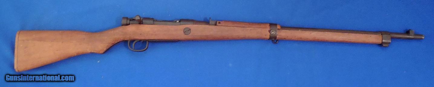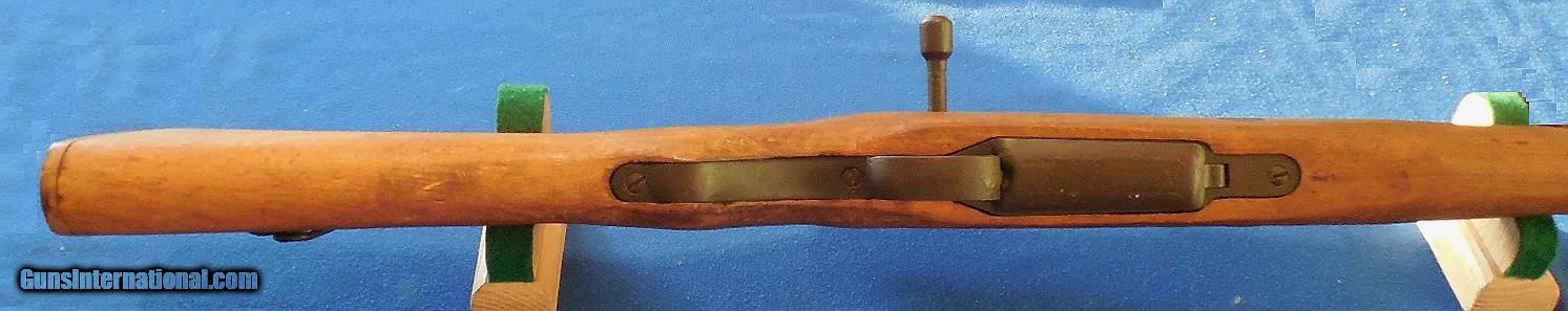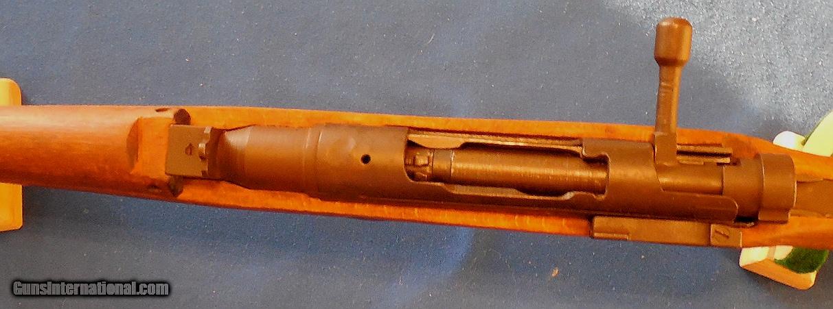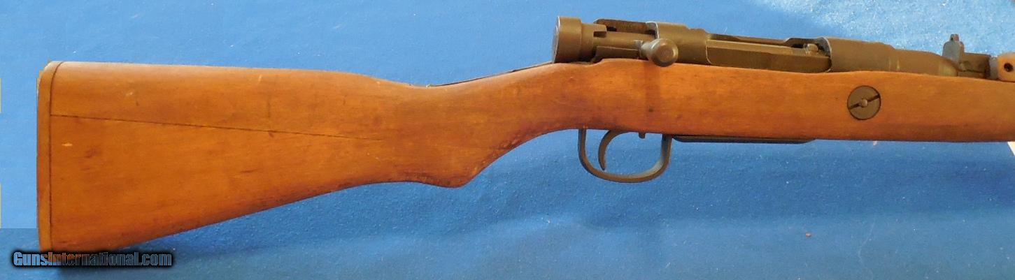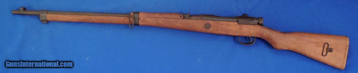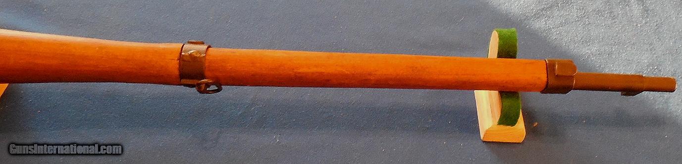 Description: Japanese Arisaka Type 99 Rifle. series 8, manufactured at Nagoya Arsenal, serial # 82575 matching, cal. 7.7mm, with a 26” barrel and a very good bright bore, rifle has a ground Mum, retains 95% blue finish turning brown. This is a series 8 Last Ditch rifle made with no provisions for the cleaning rod, has a two piece stock, wood buttplate along with solid wood showing light use. The bolt is matched with following numbers bolt 575, extractor not marked, firing pin 575 and safety 575. The overall condition as described and photographed is good plus - very good plus. Inv. : # 2-1735 SOLD Curio/Relic: Yes |