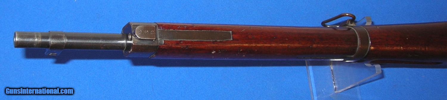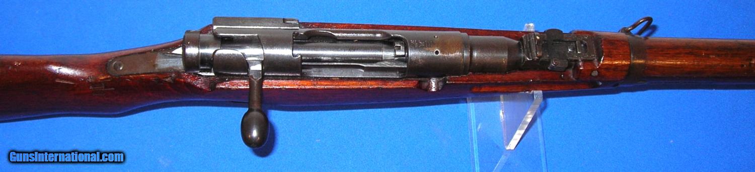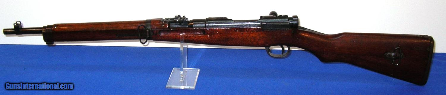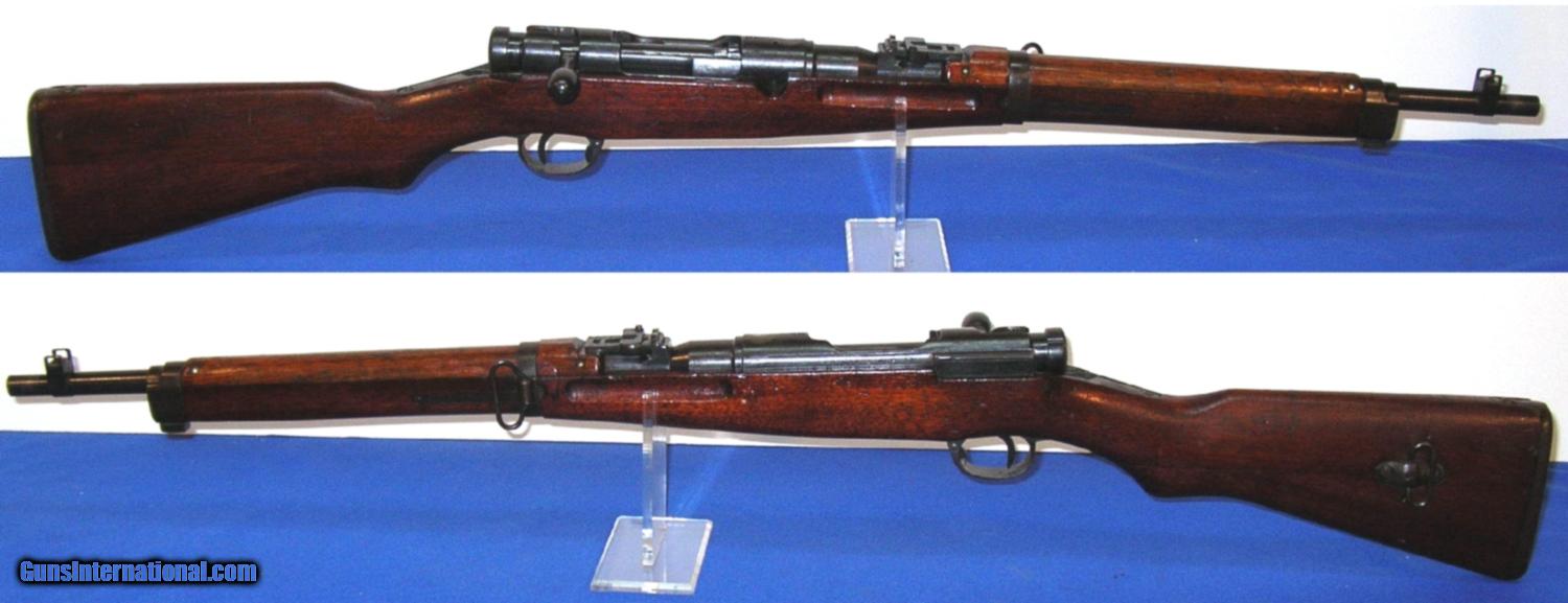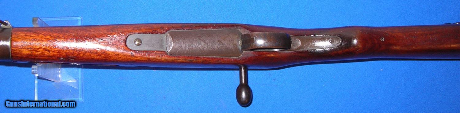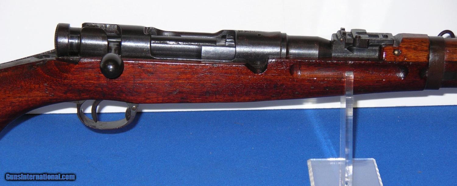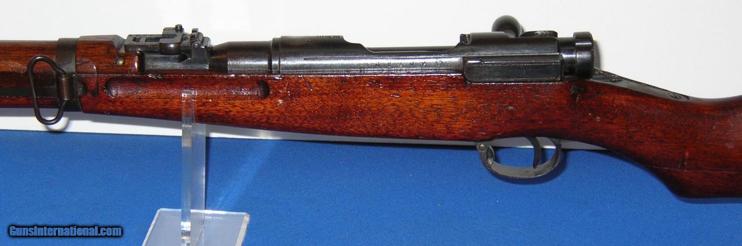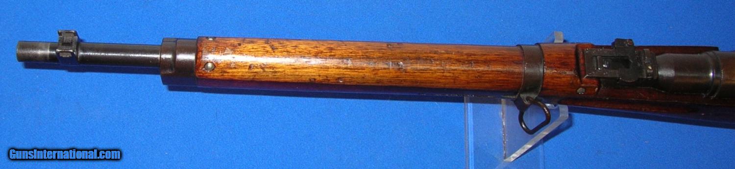 Description: SOLD /// Japanese Type 38 Arisaka Bolt Action Carbine, manufactured NAGOYA, (series 4) serial # 68202, cal. 6.5 Arisaka, 19" barrel with an excellent bore. This non-import marked Arisaka shows metal surfaces which retain about 85-87% of a possible touched up blue finish with light scattered surface oxidation and a bit of silvering at the muzzle. The receiver mum has been removed and a slight concaved brownish gun metal area remains. The wood surfaces rate about near excellent and exhibit light scattered dings and impact marks which certainly enhance this carbine's genuine appearance. The smooth steel cupped buttplate is now a dark freckled brown, triggerguard tang and magazine floorplate are in similar condition. Rifle is equipped with a rear ladder and front sight, front and rear side mounted sling swivels and bayonet lug. The overall condition as described and photographed is good plus plus – very good. Inv.: # 2-1678 SOLD Curio/Relic: Yes |