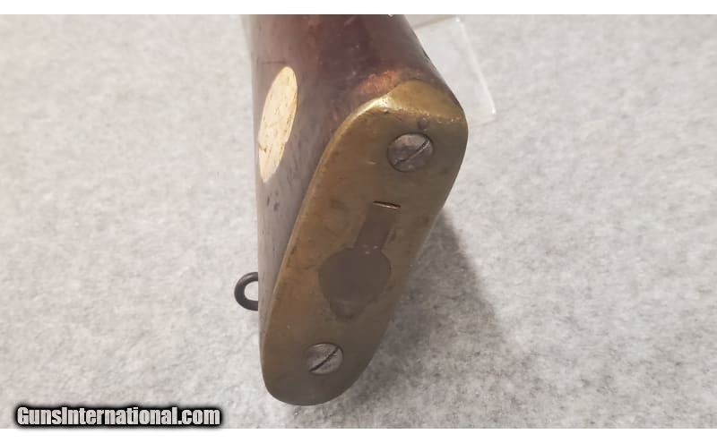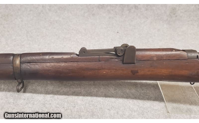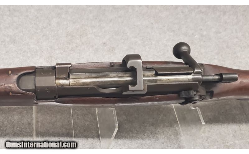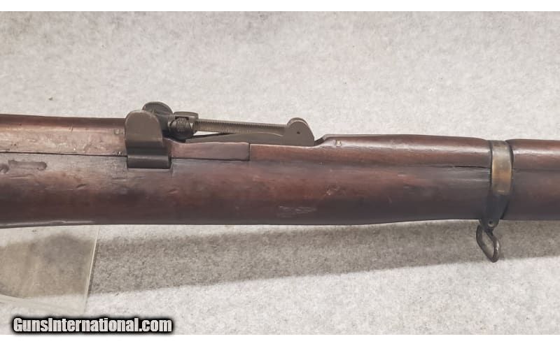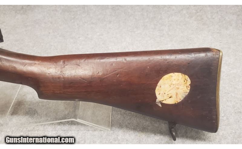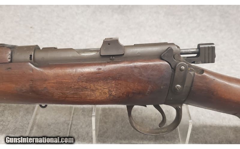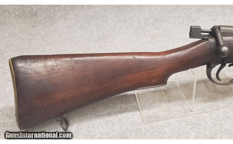 Description: Lithgow SMLE III in .303 British with a ten round capacity removable magazine and a 26" barrel. Import marked on right side of receiver: IA CO SAC CA AUSTRALIA .303. This is a Cadet Training Rifle and is marked with a yellow painted band, denoting that the rifle had wear but was still safe to fire. Brass butt plate with cleaning kit door, empty. Smooth wood stock and front forend. Blued trigger guard, serrated trigger, magazine, receiver, bolt and barrel. Rear left side of receiver serrated safety switch. Inside trigger guard located magazine release. Under barrel fixed bayonet lug. Rear flip up adjustable and front fixed blade sight. Metal loops for mounting a shoulder sling. Bottom of wood stock marked: 38. Condition: Good with scratches, wood dings, rust and finish wear/loss. The rifled bore has light rust with strong rifling. .303 British SOLD Chambers: .303 British Metal Condition: Good Wood Condition: Good Bore Condition: Good Barrels: 26 Fore End: Good Butt Pad: Good Weight: 6lbs 8oz Sights: Open Sights Item Location: Berlin |