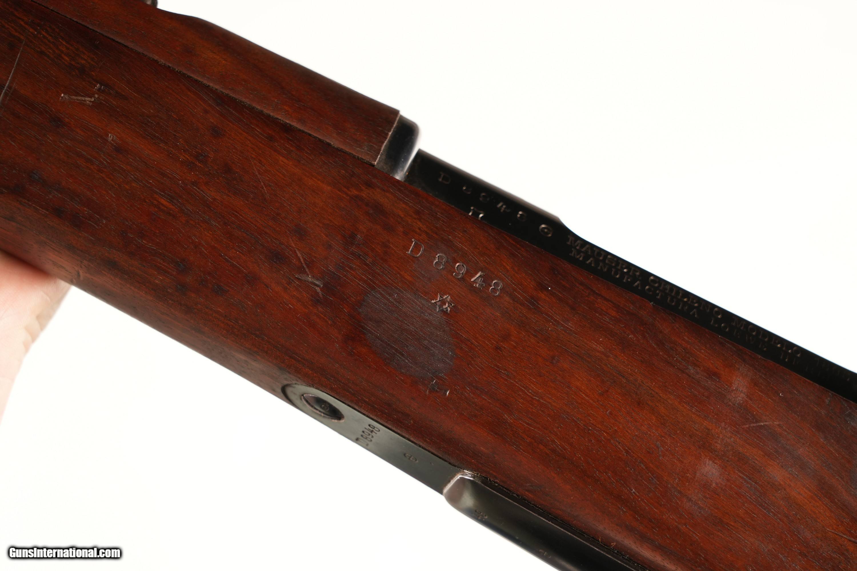 Description: Model 1895 Chilean Mauser Rifle Cal, 7x57 Mauser produced at Lowe Berlin. Blue finished with all matching serial numbers (including cleaning rod). Crisp 1895 dated Chilean cartouche in right side of butt. Crisp Chilean crest on receiver ring. Blue finished with Fire blue trigger , extractor assembly, magazine follower and rear sight slide. Bright polished bolt assembly. . Condition, Very fine with older dried storage grease in protected areas. Bore is brilliant bright with sharp rifling. Stock and hand guard are very fine with period of use impressions and bruises from storage. Rifle retains over 97% original Lowe Berlin arsenal blue finsih. A very small import marking is found on underside of barrel. Mechanically excellent . A superb Antique South American Mauser • Free Shipping, No Credit Card Fees. • Lay-a-way available for this firearm. • 1/3 Down, a 1/3 in 30 Days, 1/3 in 60 Days. Antique: Yes Rifle Caliber: 7x57mm Mauser Manufacturer: Loewe Model: 1895 Serial Number: D8948 Barrel Length: 29 Bore Info: 7X57 Mauser Condition: Excellent Metal Condition: Excellent Wood Condition: Excellent Bore Condition: Bright Barrels: 29 Barrel Type: Round Action: Bolt Stock: Walnut Finish: Blue Sights: Factory Manufacture Date: 1895 Price: $995.00 Buy Now Contact Seller |