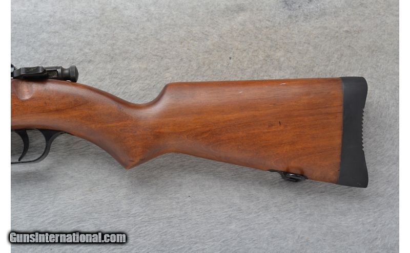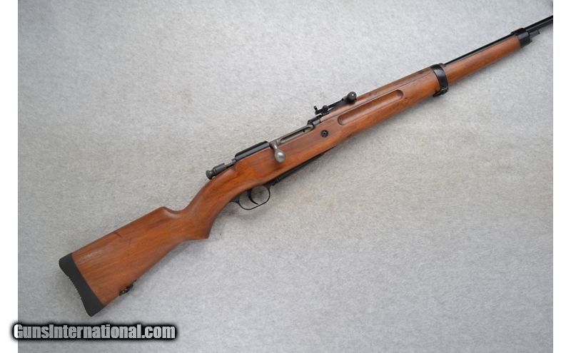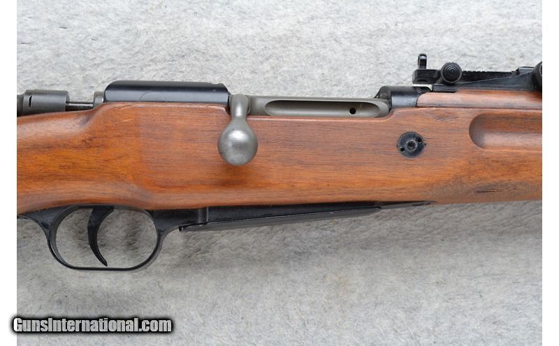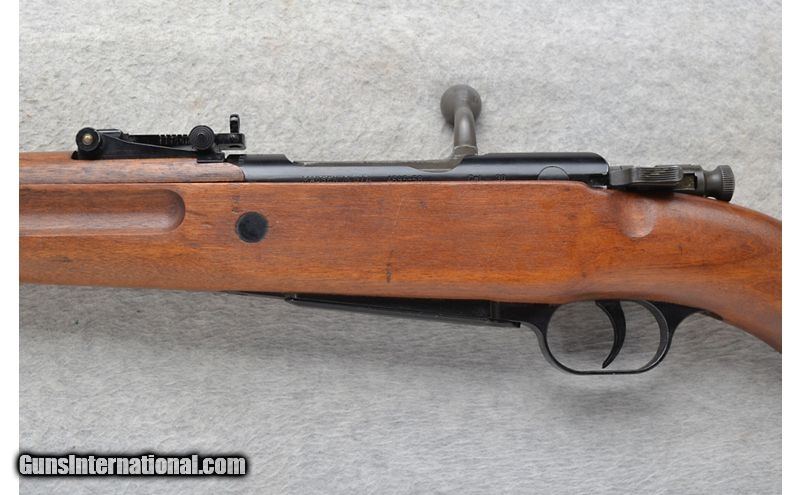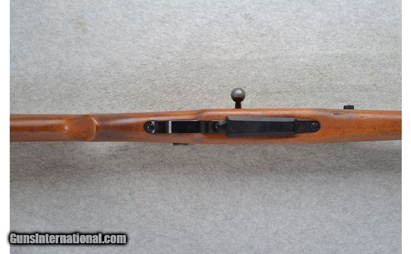 Description: This Madsen Model M.G/A is a right hand bolt action rifle in .30-6 Sprg. Cal. It has a 24 inch barrel. A hooded front post sight and a numbered sliding adjustable aperture middle sight. The butt stock is a smooth grip walnut pistol grip. The forearm is a smooth grip walnut with finger grooves and a barrel band. .30-06 Springfield SOLD Chambers: Right hand bolt action internal magazine. Metal Condition: Excellent. Wood Condition: Very good with light handling marks. Bore Condition: Excellent. Barrels: 24 inch with the muzzle break. Stock Dimensions: LOP 13 1/8 inches. Fore End: Smooth grip walnut with finger grooves and a barrel band. Butt Pad: Ribbed black rubber. Weight: 8 lb. 8 Oz. Sights: Hooded post front. Numbered sliding adjustable aperture middle. Item Location: Richfield, WI |