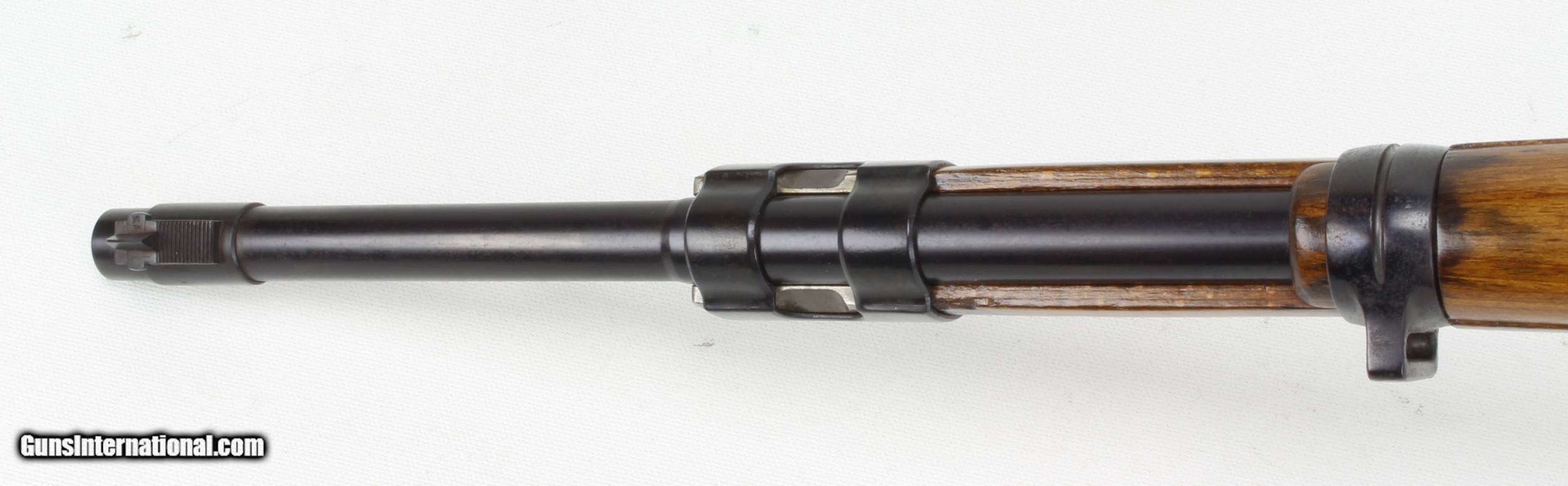 Description: MAUSER, K98, 8MM, 24", "CODE 243, MAUSER BORSEGWALDE-BERLIN", SN#1273, MFG: 1940. Original Sling, Refinished Stock, and Re-Blued Metal. "ALL MATCHING NUMBERS", Stock Cartouches Faint. VG Bore, Mechanically Excellent: Ships to Lower 48, W/Insurance: $45.00 SOLD Curio/Relic: Yes Manufacturer: MAUSER Model: K98 Serial Number: 1273 Caliber Info: 8MM Bore: VG Condition: EXCELLENT Metal Condition: EXCELLENT Barrels: 24 |