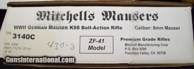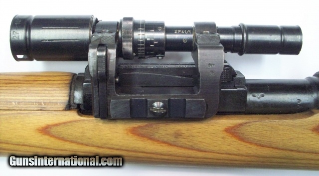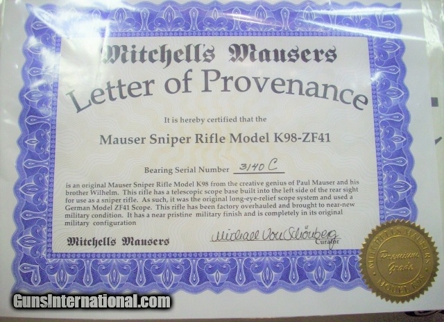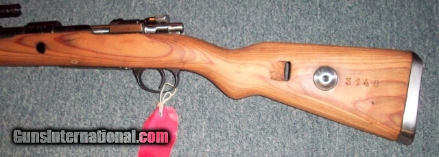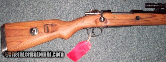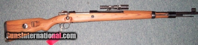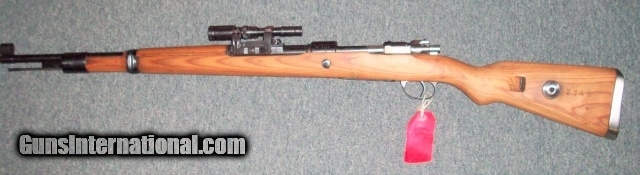 Description: This Mauser SNIPER rifle Mod. K98-XF41 S# 3140C is a 8 MMMauser Cal. Collector Grade. CORRECT Scope and mount in excellent condition but S# do not match. This rifle is in 100% condition with pouches, sling, book and Certificate. $2600.00. rmg SOLD |
