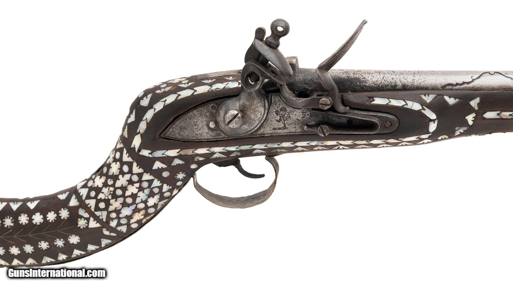 Description: Guns Listing ID: 578153 NSN, manufactured circa early 20th century, chambered in .58 caliber with a 43 ¾" round rifled barrel. The barrel exhibits a smooth grey patina with a simple style chiseled pattern at both the breech and muzzle, secured by five hand-formed brass barrel bands. The lock plate is crisply marked with a lion over Crown/2, while the rear of the hammer bears a clear 1815 date.The distinctive curved stock is a hallmark of the Afghan Jezail, and this example is lavishly inlaid with mother-of-pearl, forming intricate geometric patterns across the entire length. Mechanically, the action holds firmly at both half and full cock. (AL10266) Manufacturer: MUSKETEER RIFLES Model: AFGHAN FLINTLOCK JEZAIL MUSKET .58CAL Caliber Info: .58 CAL BLACK POWDER Condition: Used - Non-Certified Barrels: 43.75" BARREL Action: SINGLE SHOT Finish: patina Price: $995.99 Contact Seller |