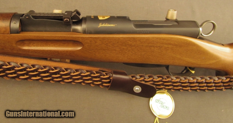 Description: Serial #915256, .22 LR, 25 1/2” barrel wit an excellent, bright bore. This is number 228 of only 500 rifles manufactured in 1990/1991 to commemorate the 700th anniversary of the Swiss Confederation by the Association of Swiss Gunsmiths. These rifles were made using ex-military 7.5mm K.31 Short Rifles and sleeving the barrels to .22 caliber. A fixed, semi-cylindrical loading tray (and an offset rimfire firing pin) was added to the original, matching numbered bolt, and this fits into a corresponding recess surrounding the chamber mouth and allows the cartridge to be positioned correctly for loading. The metal retains 99% plus of its original mixture of bright blue on the barrel and matte black on the receiver with gold highlighted Swiss shield, “Jubilaums” on the left side, “KK-Karabiner” on the right. The bolt retains its original bright finish with satin textured finish on the aluminum knob, and the original matching numbered magazine is still present. The select, straight grain walnut stock and handguard are also in virtually pristine condition with almost no handling marks or blemishes marring the beautiful semi-gloss finish and the inset oval plaque on the right side has no chipping or damage around the inletting. The rifle still has its original 10 shot/50m test target in a sealed plastic hang tag, the original woven leather sling, which is in excellent, virtually unused condition, is also included. An original metal muzzle cover completes the package. These are absolutely splendid rifles that are seldom seen on the market today, especially in the U.S. and this example is in virtually new condition and exhibits practically no use. FFL SOLD Manufacturer: Swiss Model: K-31 Serial Number: 915256 Caliber Info: .22LR Gauge Info: .22LR |