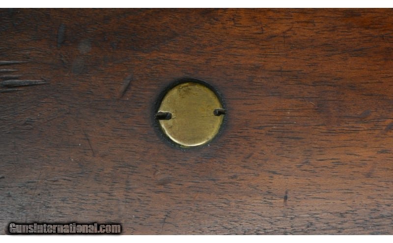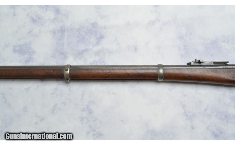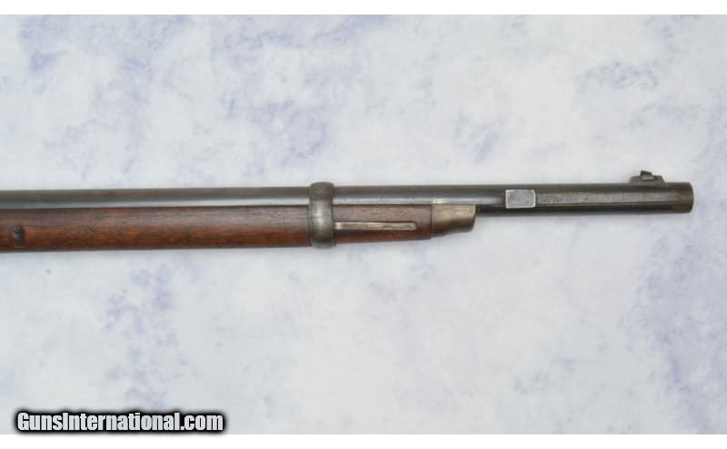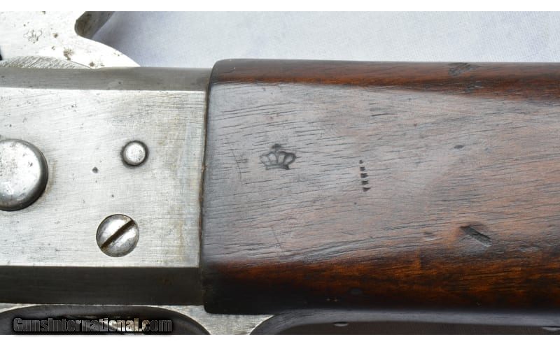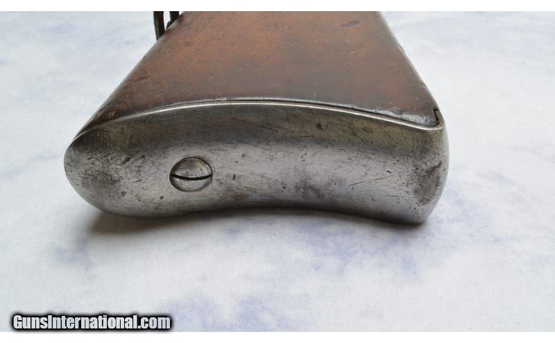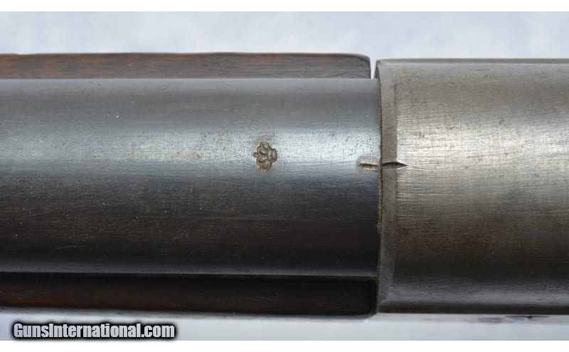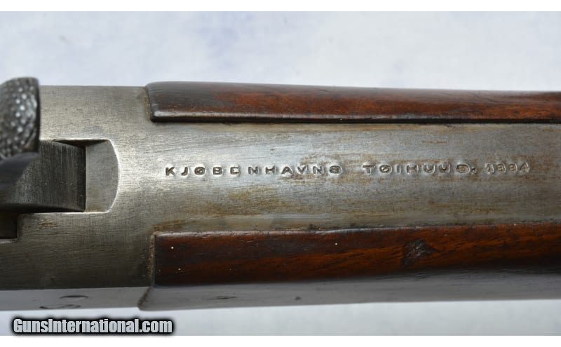 Description: Receiver is stamped with a Crown over the Royal Cypher & M-1867. The upper tang is stamped KJØBENHAVNS TOIHUUS 1884, Missing Cleaning Rod, reverse mounted Long Ladder Rear Sight, Long Range Volley Sight Stud, Windage driftable Blade Front Sight and Bayonet Boss with long front extension. 11.35MM Danish Centerfire Cartridge (also commonly known as the 11.7x51R or 11.7mm x 51mm Danish Remington). Original firing pinhole is left in the breech block to allow use of rimfire rounds by swapping the pin. Gebr.Weyersberg Solingen yataghan type sword bayonet. This bayonet also has a leaf spring catch, and not a coil spring, indicating production prior to 1884. Along with the Danish Crown on the pommel, this is a correct bayonet for a Danish Remington. It is also marked on the cross guard with Danish regimental markings: 57B 364 & serial number 60427. Unknown SOLD Metal Condition: Good Wood Condition: Good Bore Condition: Good Sights: "Long Ladder Rear Sight, Long Range Volley Sight Stud; Windage driftable Blade Front Item Location: Green Bay |