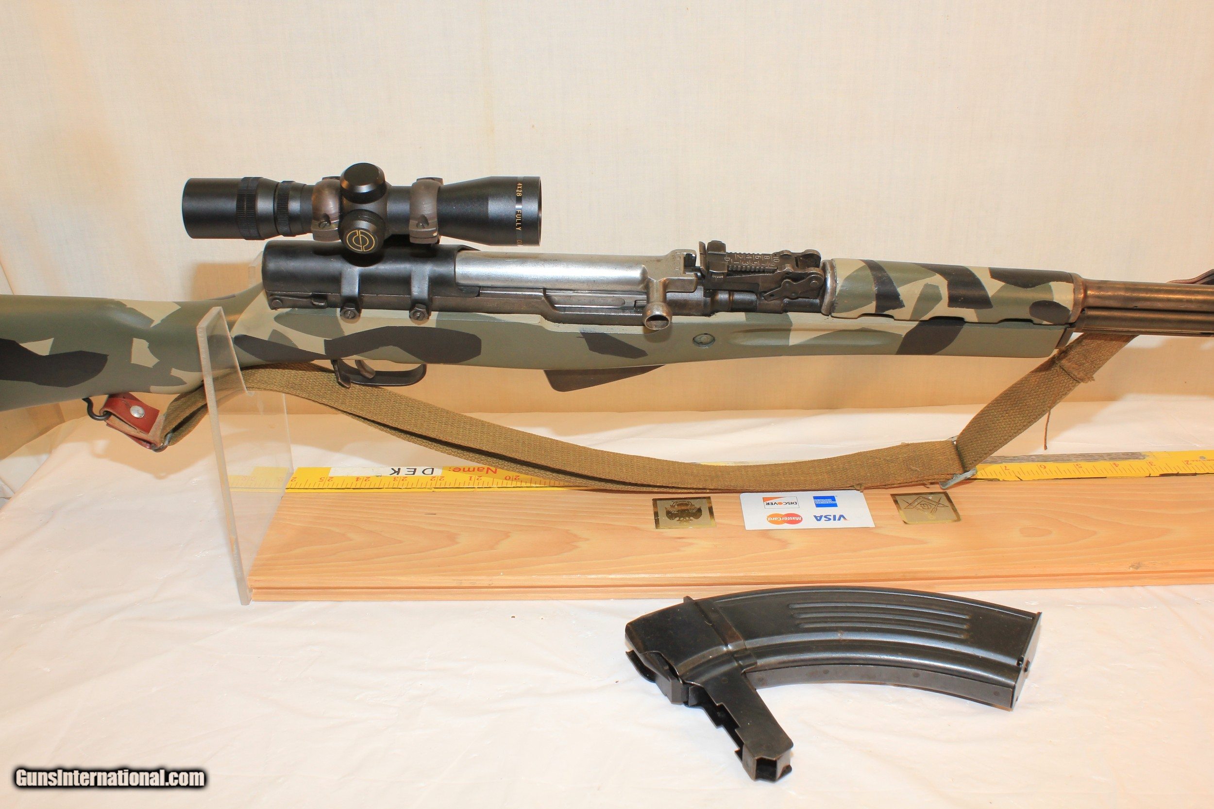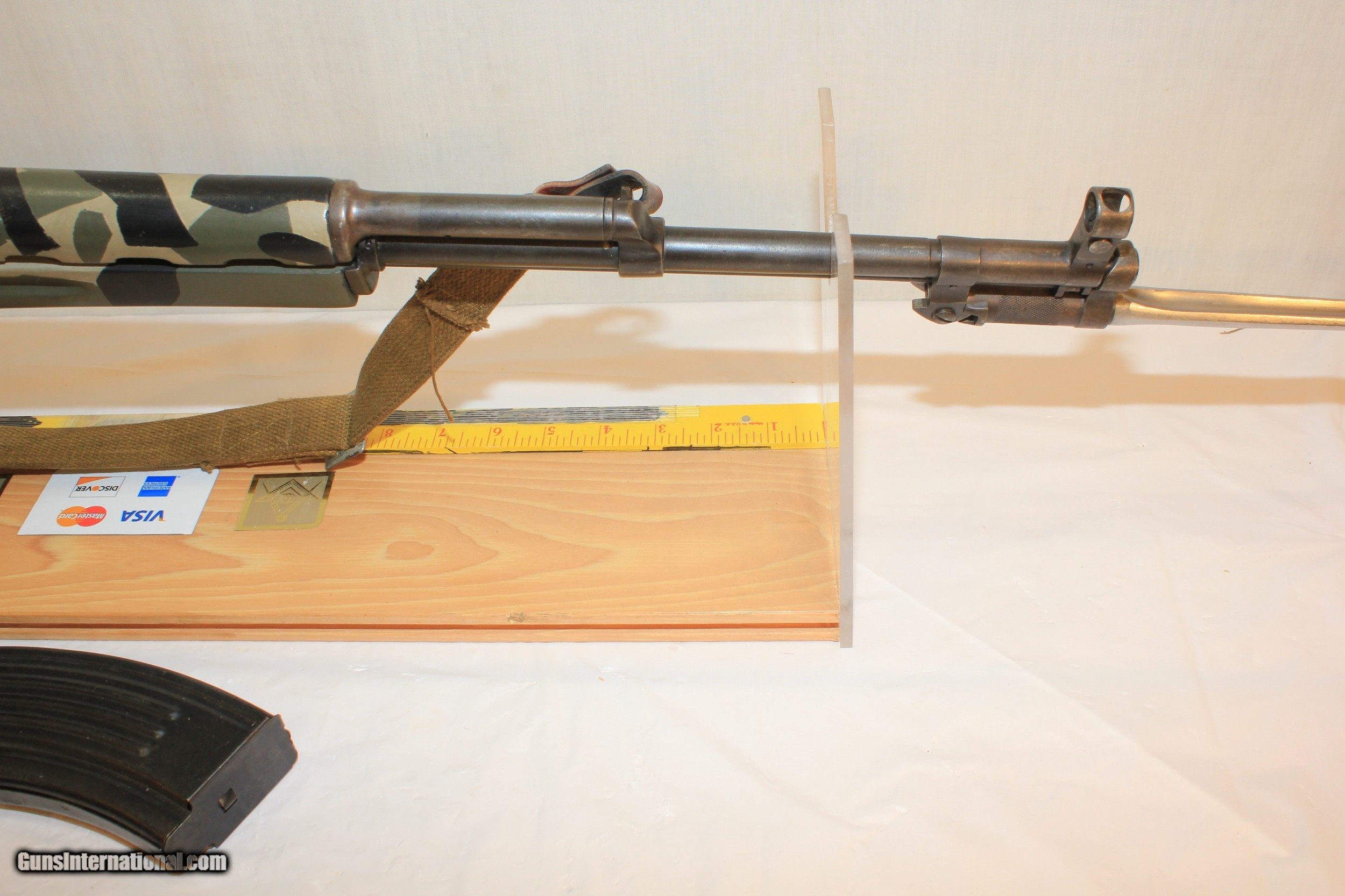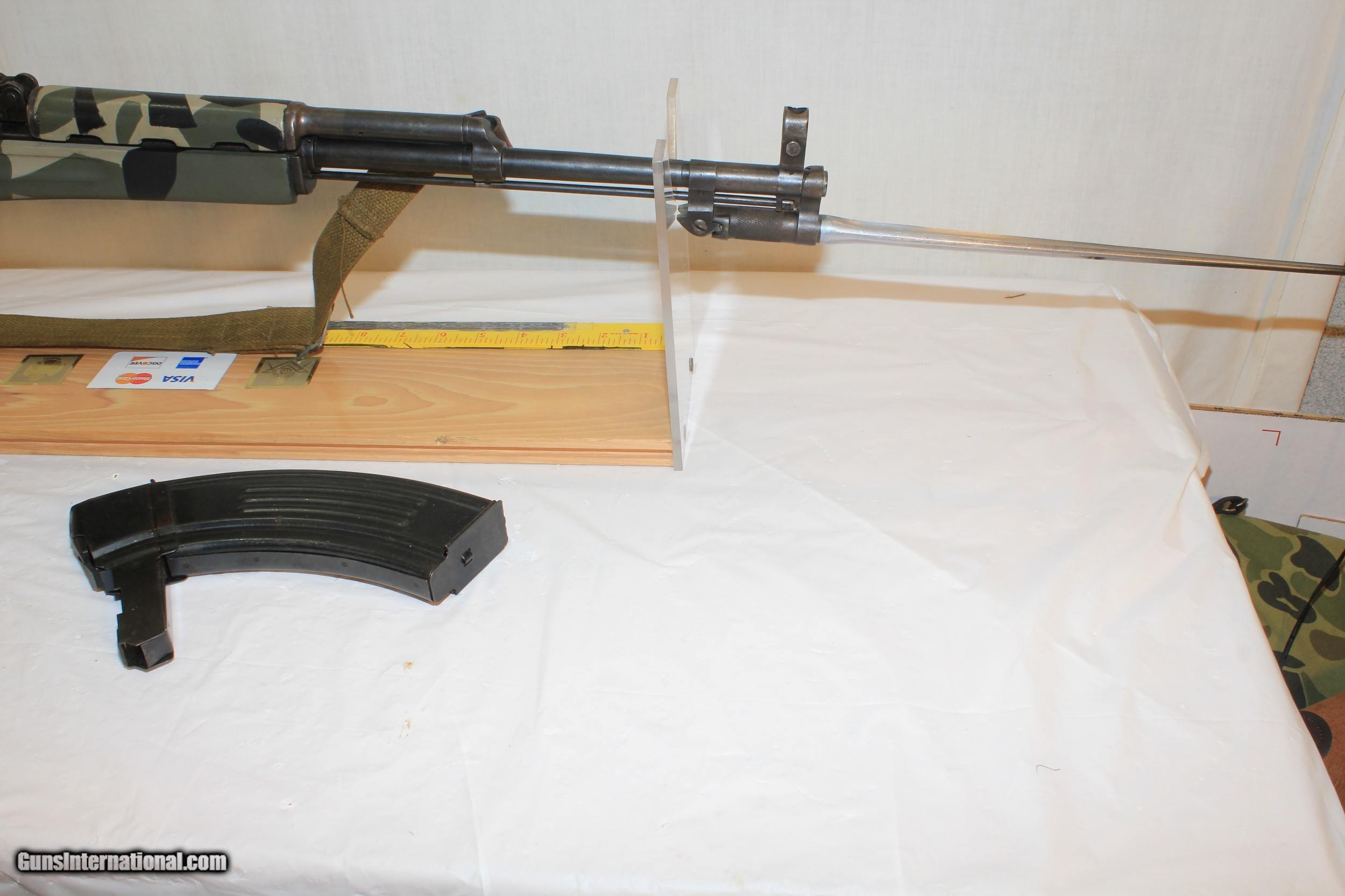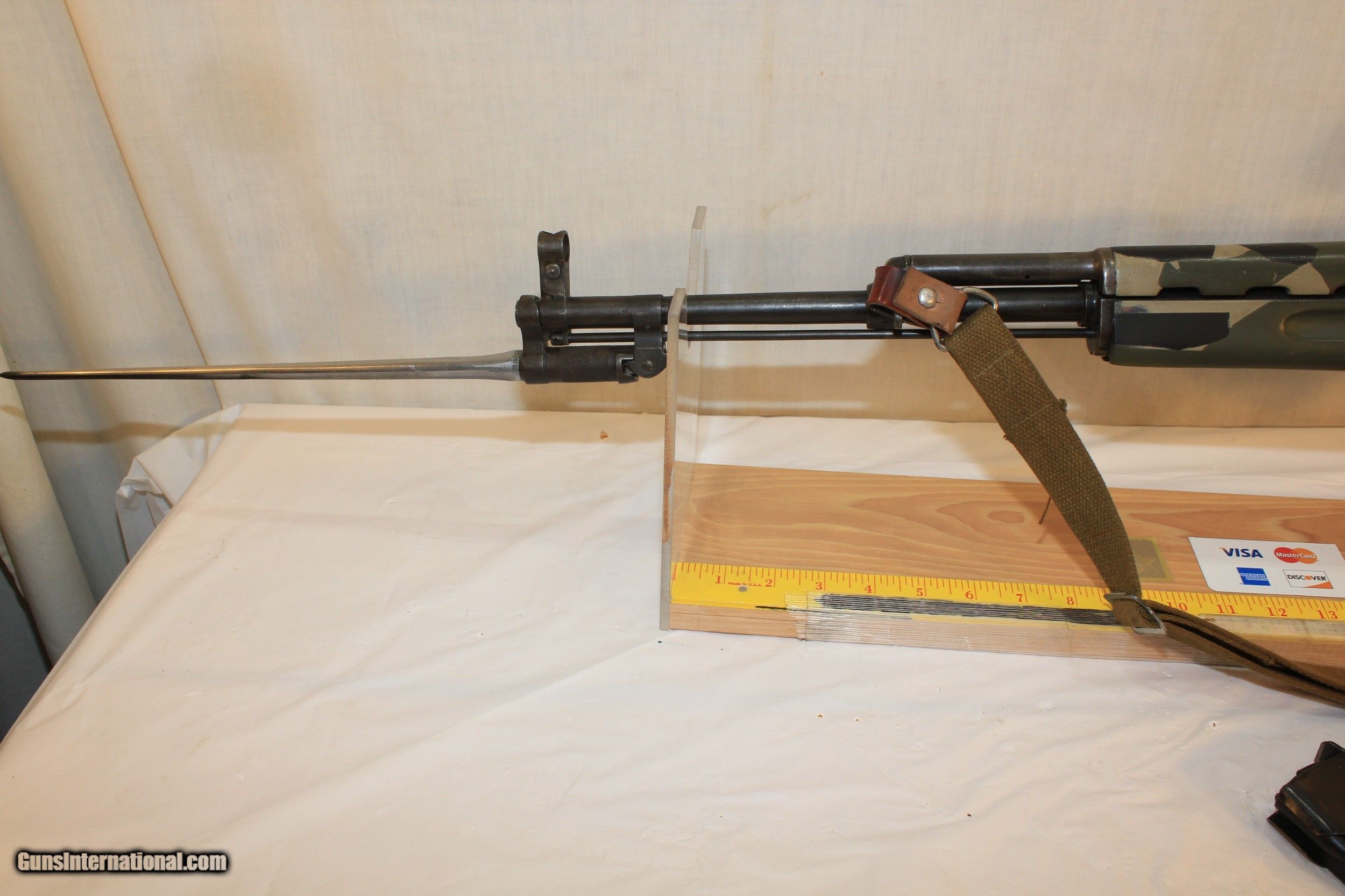 Description: A nice clean China made SKS in 7.62x39mm caliber with a wood stock that has been painted camouflage so if you drop in in the woods you can't find it. It has a folding spike bayonet, proper sling and a Simmons 4X scope with mount. You can use the bayonet to finish off some critter you wounded and save ammunition. An extra high capacity magazine goes with the gun. It is complete with the cleaning rod and cleaning kit in the butt trap. A good reliable rifle for sport or defence. $50.00 Shipping via Priority Mail SOLD |