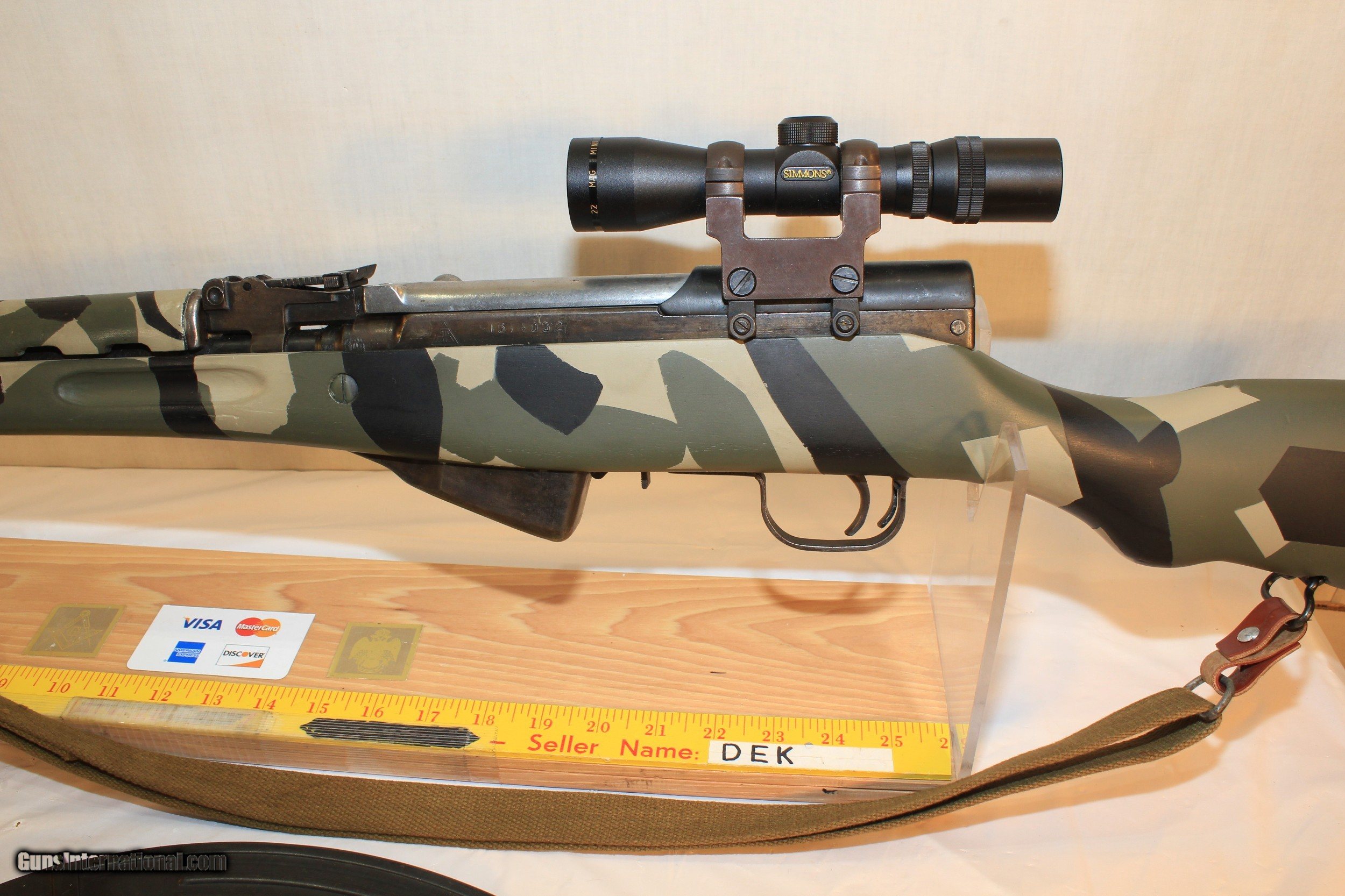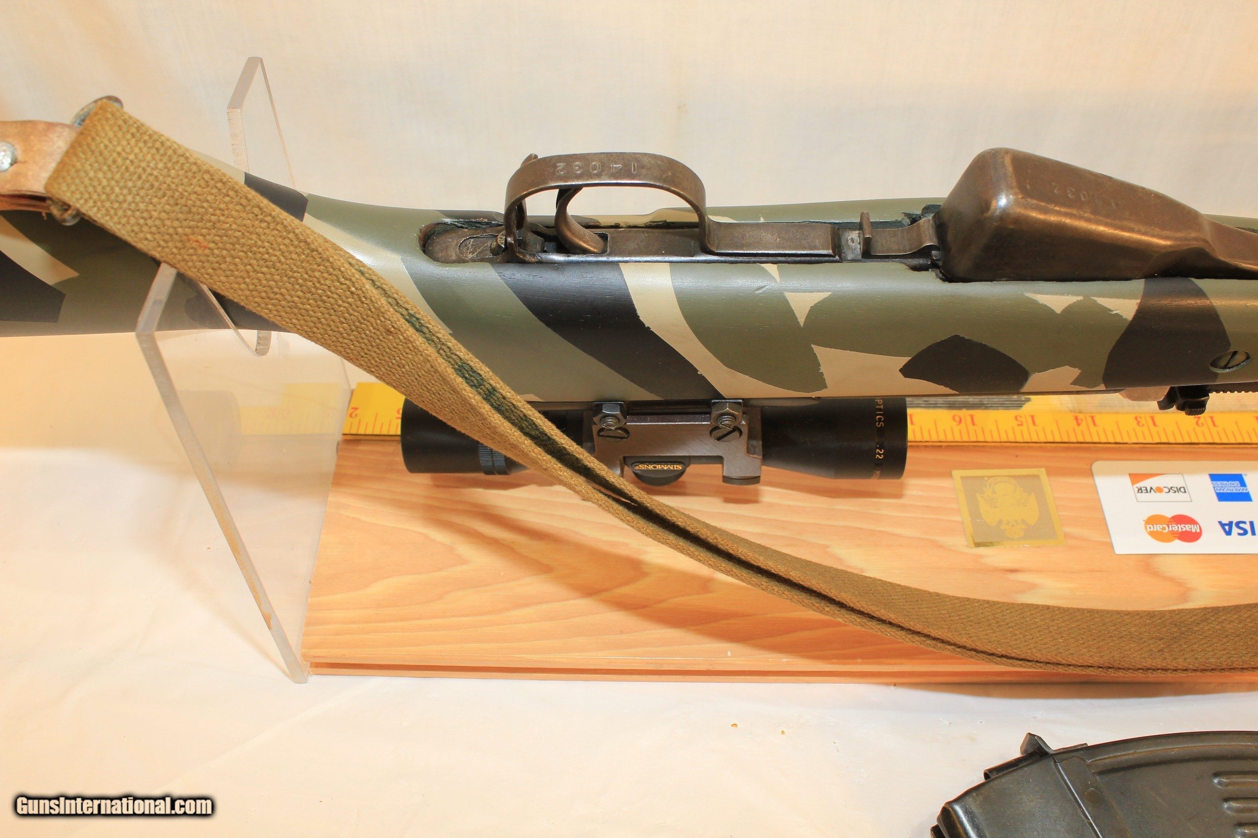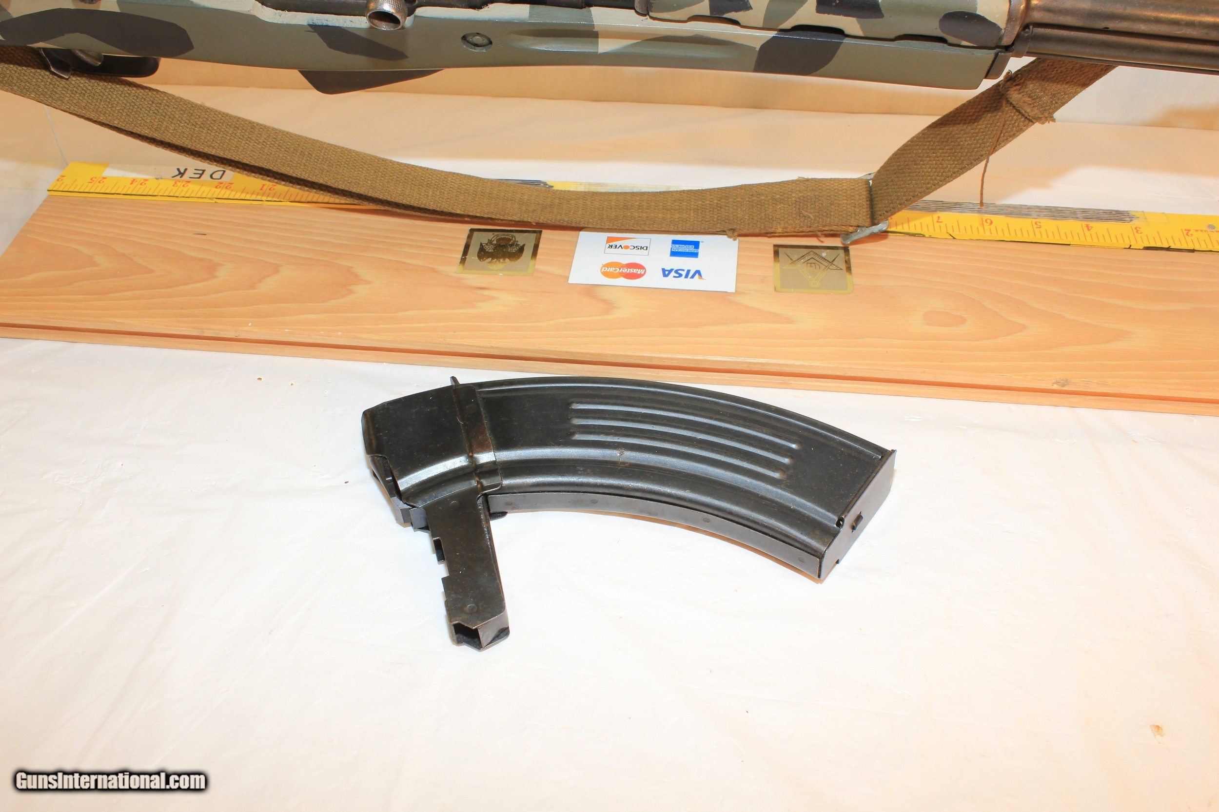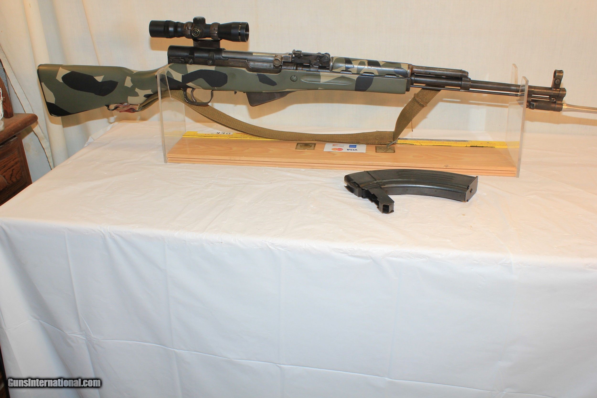 Description: A nice clean China made SKS in 7.62x39mm caliber with a wood stock that has been painted camouflage so if you drop in in the woods you can't find it. It has a folding spike bayonet, proper sling and a Simmons 4X scope with mount. You can use the bayonet to finish off some critter you wounded and save ammunition. An extra high capacity magazine goes with the gun. It is complete with the cleaning rod and cleaning kit in the butt trap. A good reliable rifle for sport or defence. $50.00 Shipping via Priority Mail SOLD |