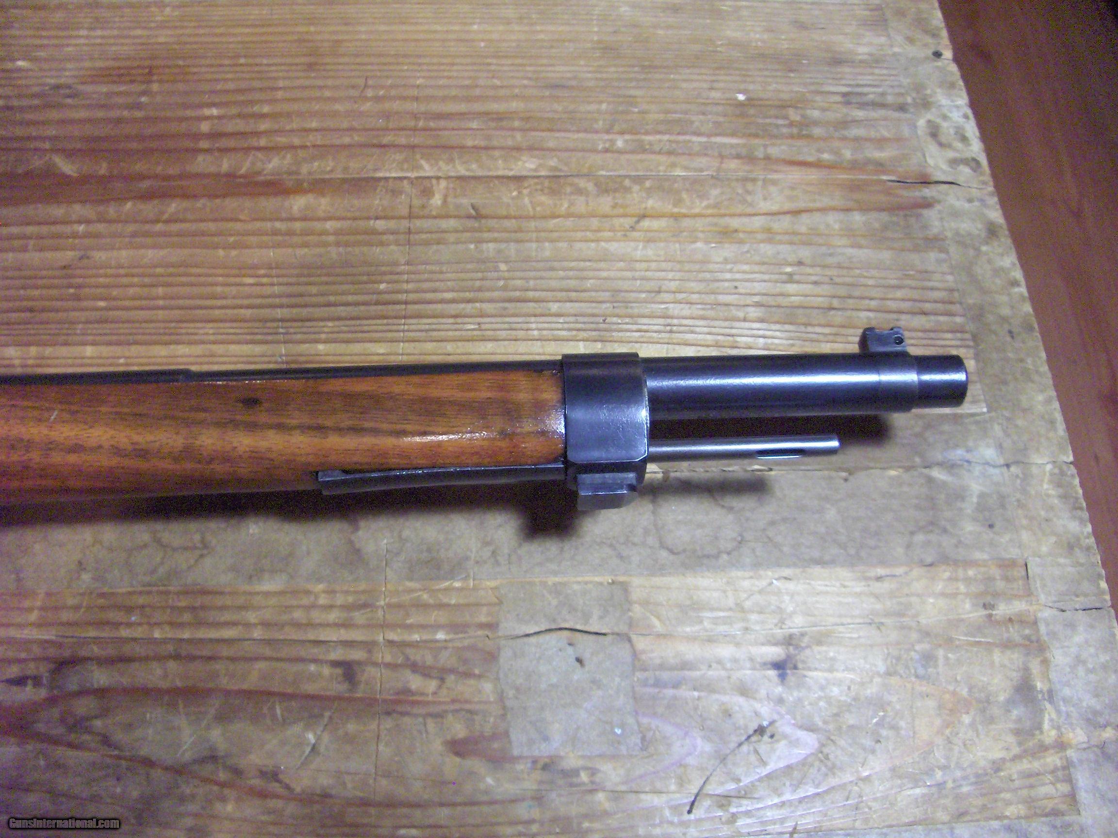 Description: 1895 7X57 Mauser carbine. 22" barrel. Stock redone leaving metal proud. Bore very good,rifling sharp. Front sight missing. SOLD Antique: Yes |
