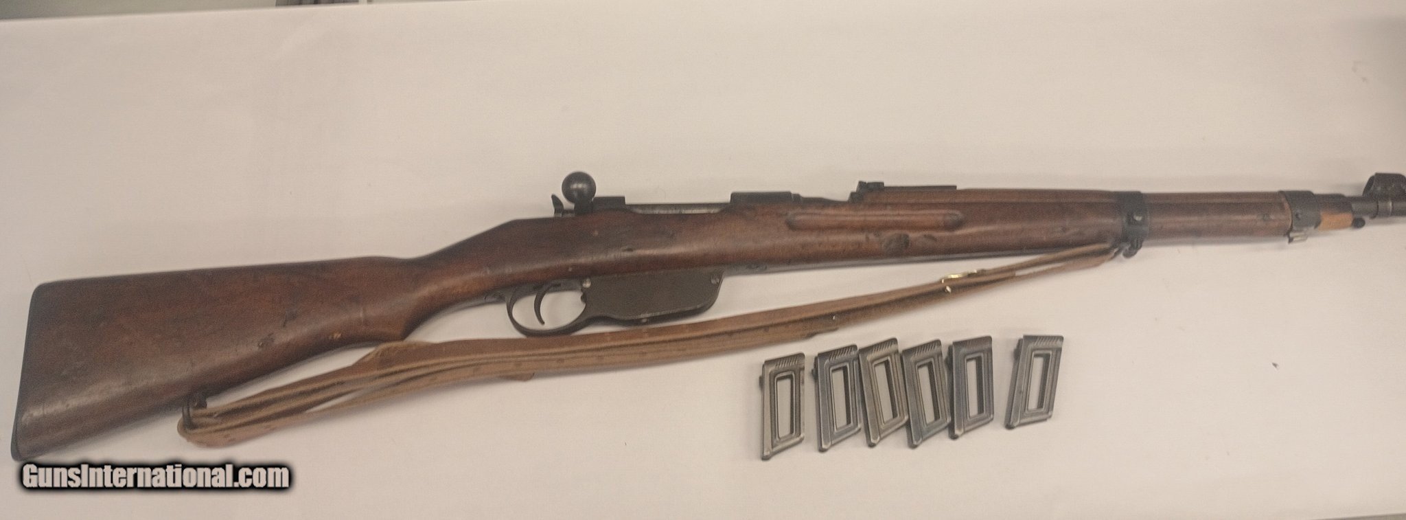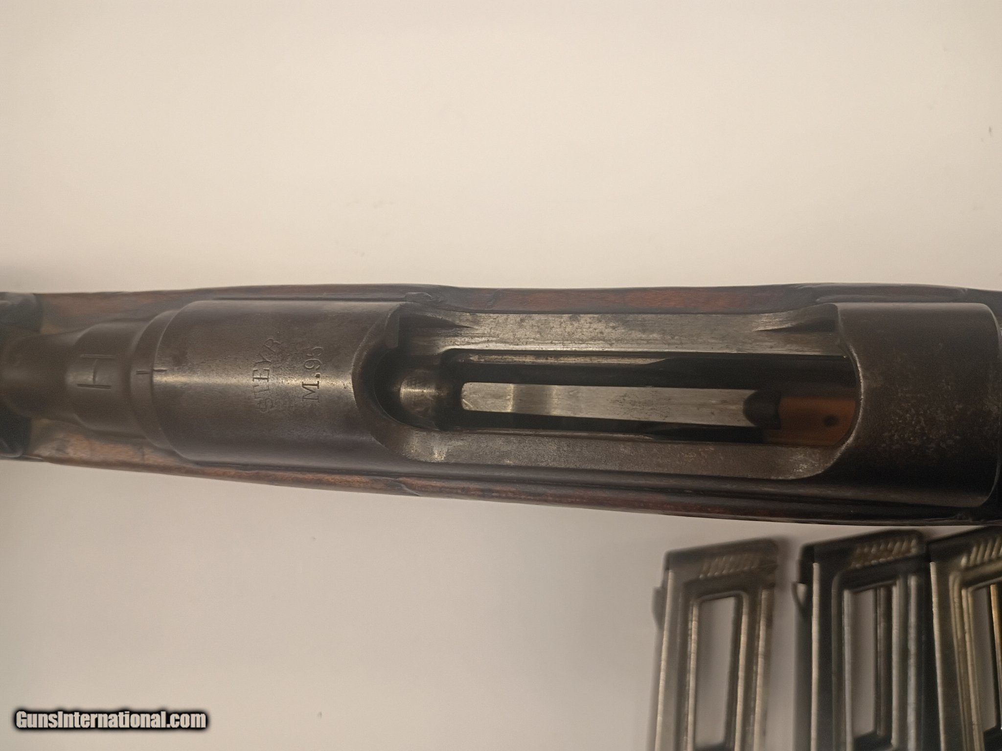 Description: Guns Listing ID: 585656 An Austrian made m95 updated to 8x56r in Hungary. Metal has patina, bore is in fair overall shape. Includes sing and 6 en-bloc clips. Also very rare to find with the original front sight protector. These were usually removed. However there is a small crack at the end of the stock and looks like someone tried to fit a different bayonet by filing on the front bayonet lug. Action is smooth and appears mechanically fine. Manufacturer: STEYR Model: M95/30 Caliber Info: 8X56MMR Condition: Used - Non-Certified Barrels: 19" BARREL Action: BOLT ACTION Finish: black /w wood stock Price: $450.99 Contact Seller |