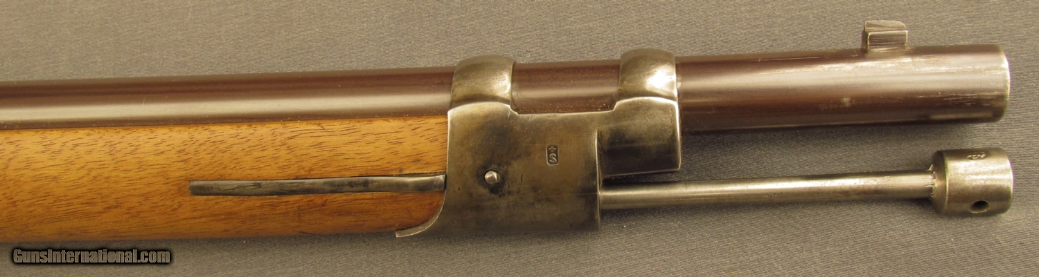 Description: SN 313 bright, as new condition bore. This is a very scarce Swiss Amsler rifle model 1866/67. Small bore. This rifle takes a 10.4 X 38 (41 Swiss) rimfire cartridge. The sight is graduated to 800 meters. The lock is marked V. Saverbrey, the breech marked T.H. Klaus. The serial # 313 is marked on the breech, barrel and stock. The metal retains 95% plus original finish, the small parts are numbered 98 on screws and bands with the rod showing #1098. A very uncommon Swiss conversion in the USA. An excellent overall collector grade condition. A piece for the Swiss, or the military conversion collector. Antique SOLD Antique: Yes Manufacturer: Swiss Model: 1866/67 Serial Number: 313 Caliber Info: 10.4x38mm Gauge Info: 10.4x38mm |