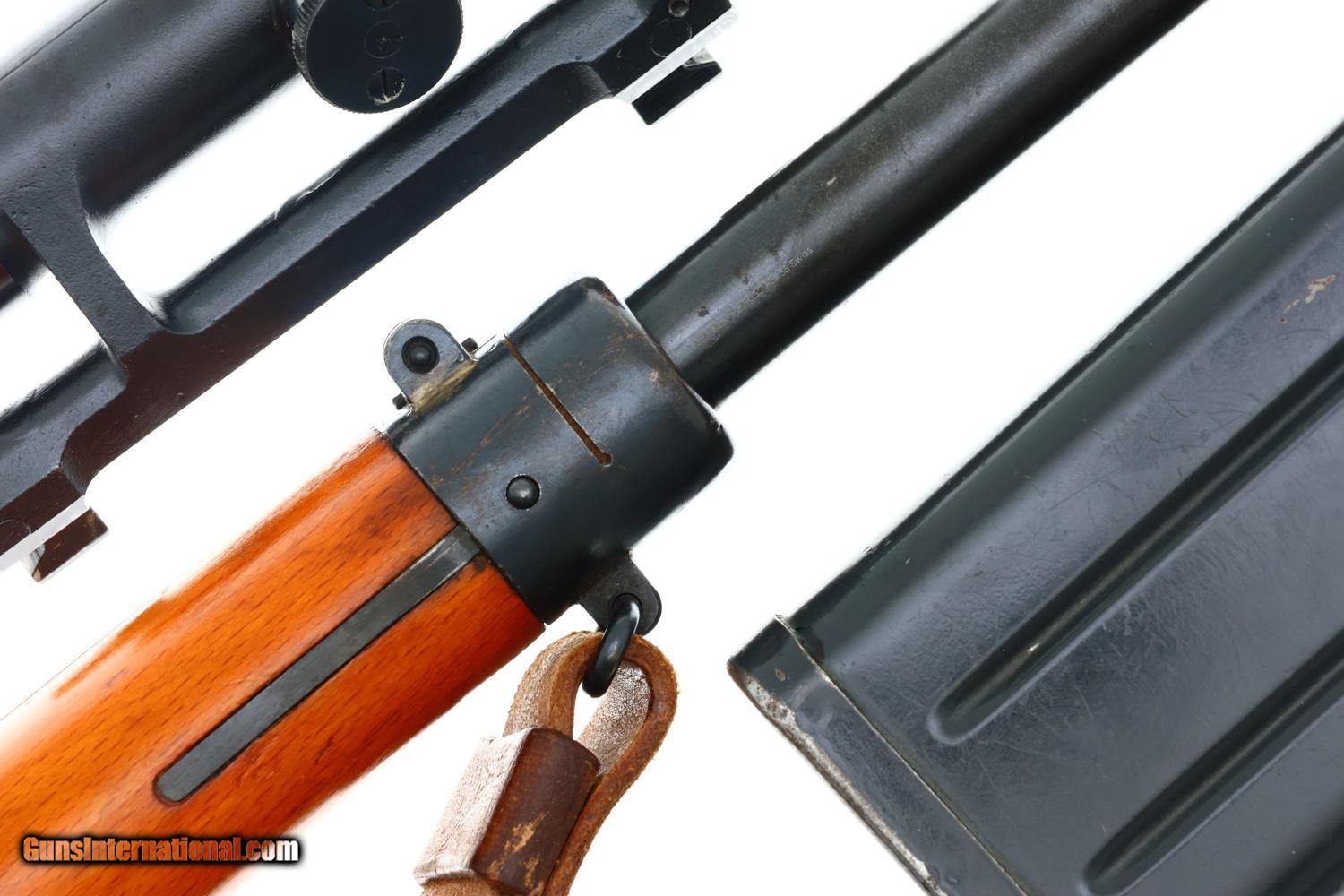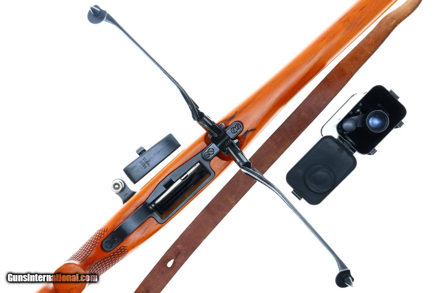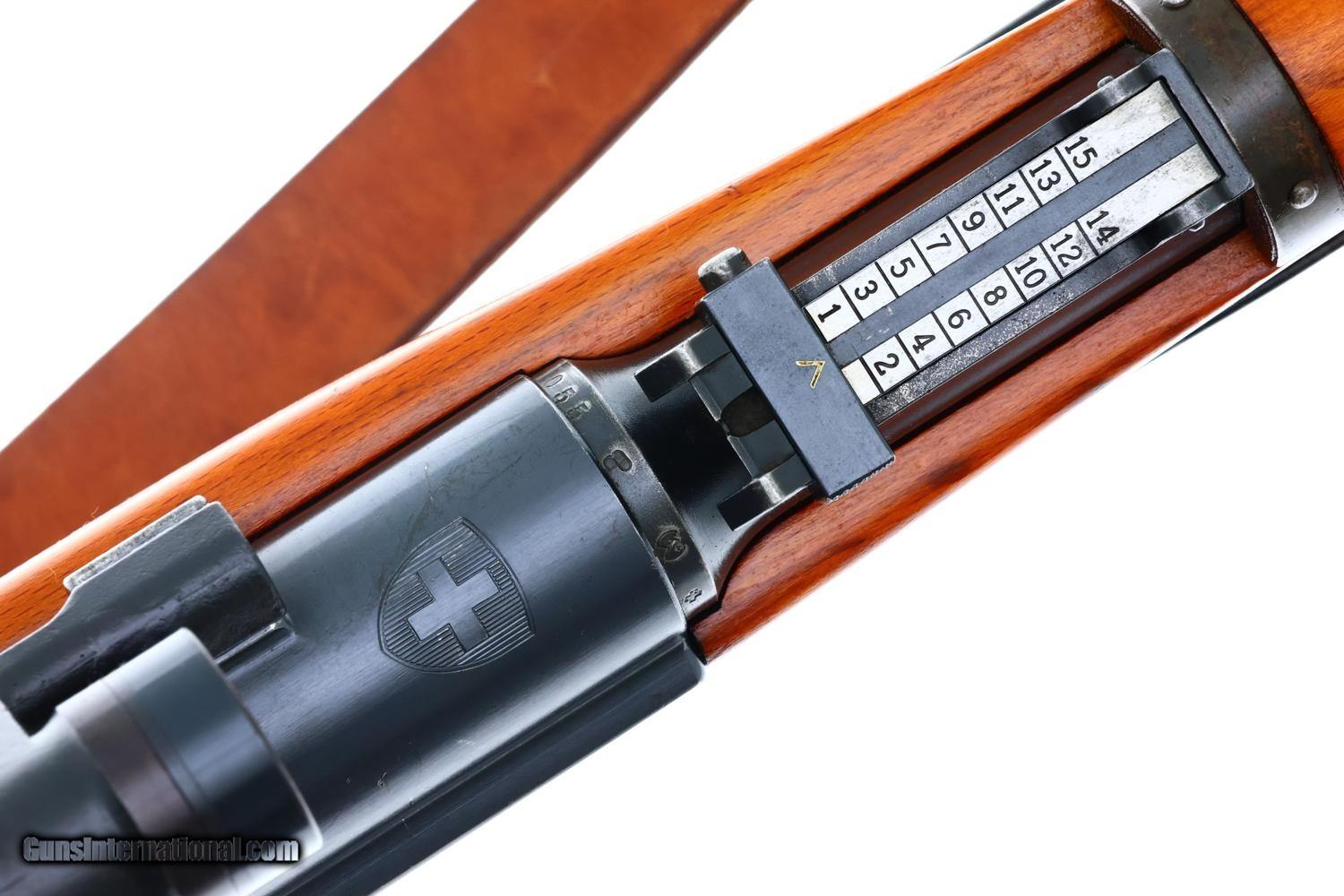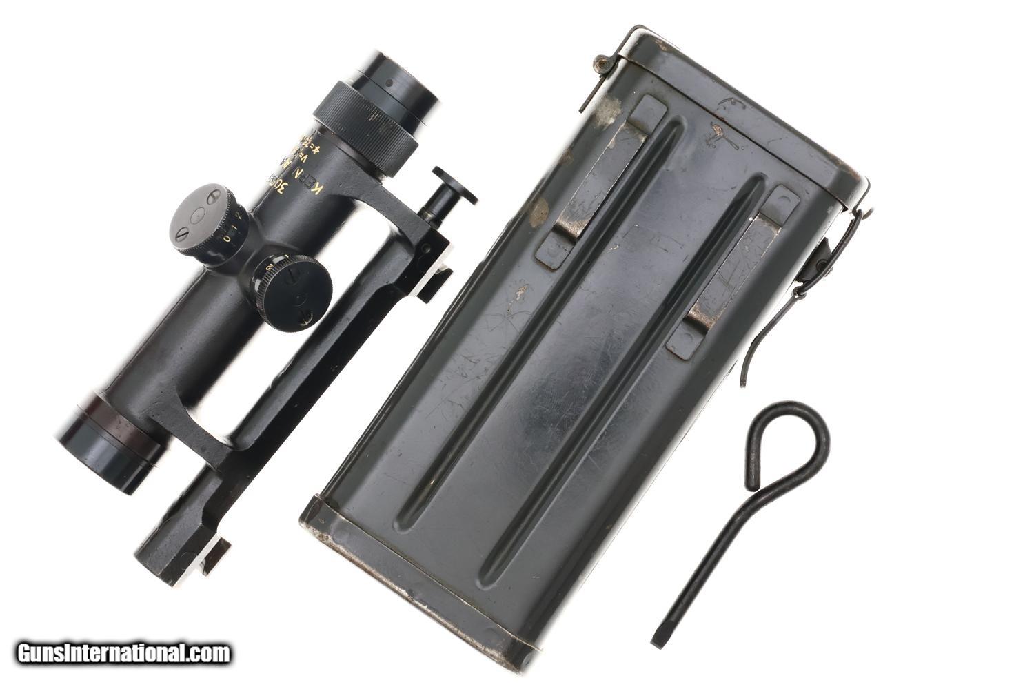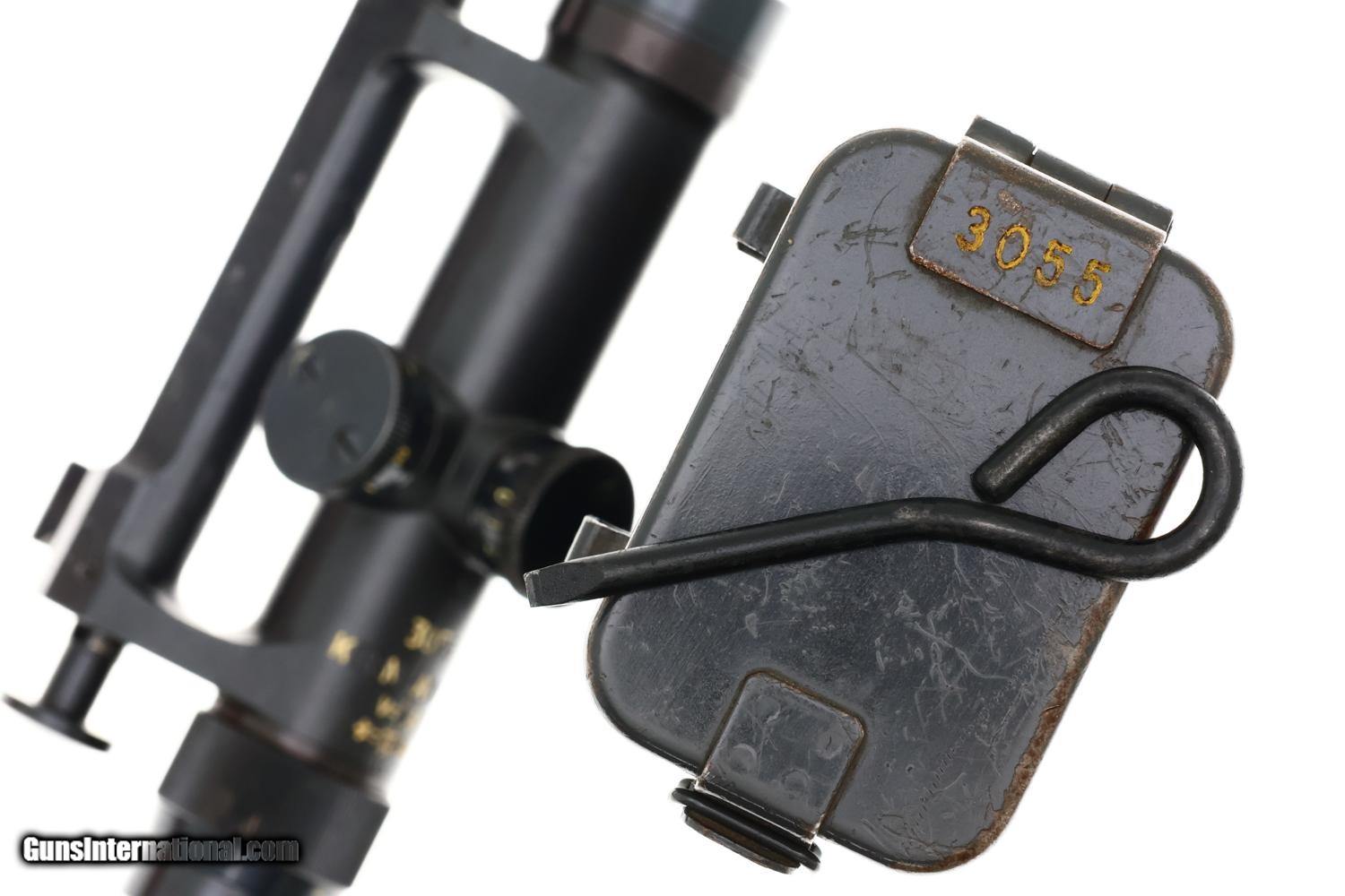 Standard configuration ZFK 31/55, one of approximately 5000 such rifles, an evolution of the K31 /42 and K31/43 sniper rifles, this one with telescopic sights, heavy barrel, flash suppressor/muzzle brake, and center-mounted foldable bipod. In addition to the standard K31 rear sight calibrated from 1-15, these guns were fitted with a quick detachable 3.5 power Kern telescopic sight, with serial numbering on top surface, whose reticle includes a thick central post with two thinner horizontal bars. The receiver has a Swiss “cross over chamber” with full serial number on left receiver and bolt. Matching barrel, magazine, scope, scope can (that includes the screw driver). Complete with unmarked military-style sling.