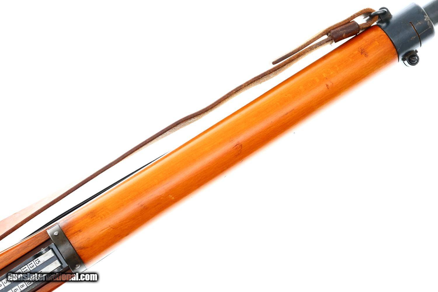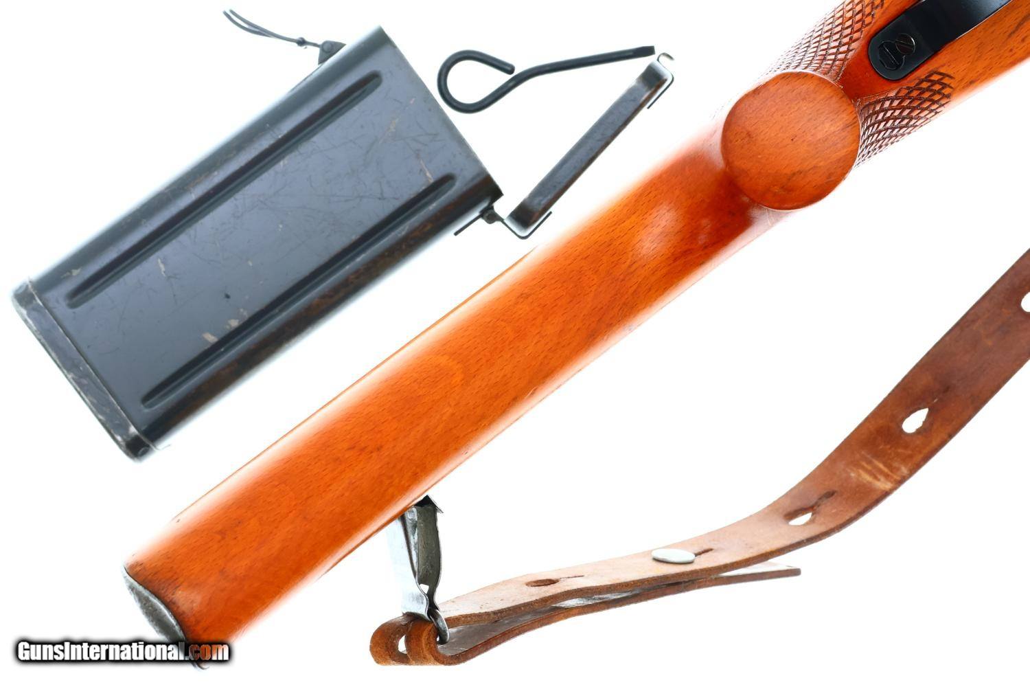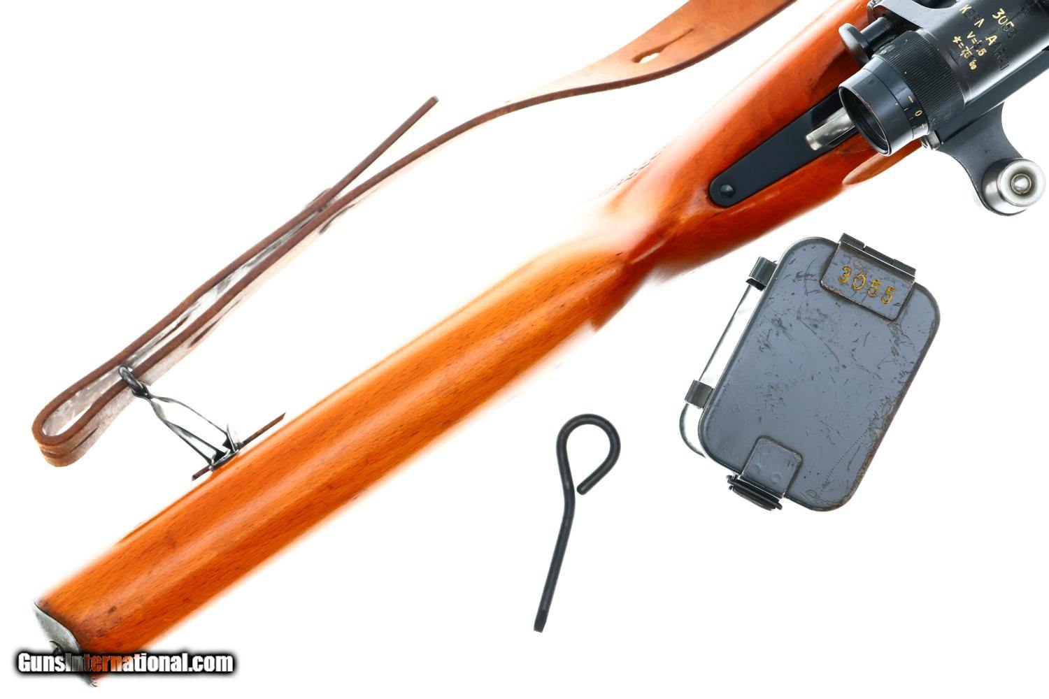 Near EXC original blue with sharp edge wear and light handling marks except as concerns the bipod whose surface scuffing is consistent with the overall condition of the rifle. In-the-white parts are bright with minimal staining and magazine wear is negligible. Near EXC stock with a few superficial handling marks, no cracks or repairs, the acceptance stamp on the right side of the buttstock having broken through the finish. The buttplate is grey with impressions. Excellent original finish scope, can, and included screwdriver, the scope with comparably bright optics and correct manual adjustments. EXC sling with supple leather, light oil staining. Mirror bore. Correct manual mechanics. A beautiful Swiss Bern K55 sniper rifle with a bright matching scope / can and a mirror bore!