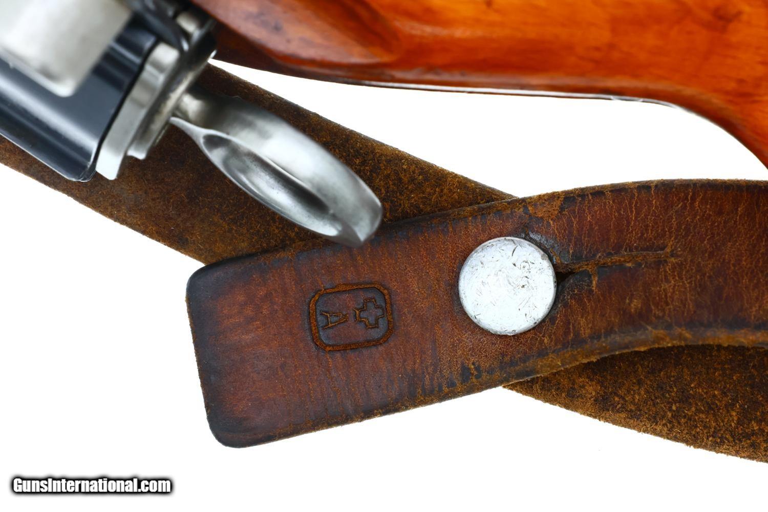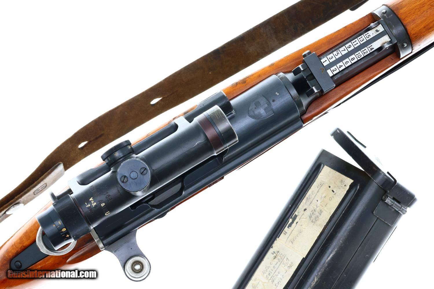 Standard configuration ZFK 31/55, one of approximately 5000 such rifles, an evolution of the K31 /42 and K31/43 sniper rifles, this one with telescopic sights, heavy barrel, flash suppressor/muzzle brake, and center-mounted foldable bipod. In addition to the standard K31 rear sight calibrated from 1-15, these guns were fitted with a quick detachable 3.5 power Kern telescopic sight, with serial numbering on top surface, whose reticle includes a thick central post with two thin horizontal bars. The receiver has a Swiss “cross over chamber” with full serial number on left receiver and bolt. Matching barrel, magazine, scope, scope can (does not include screw driver). Military sling without discernible acceptance date.