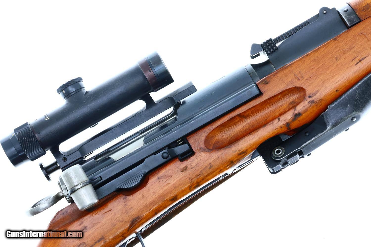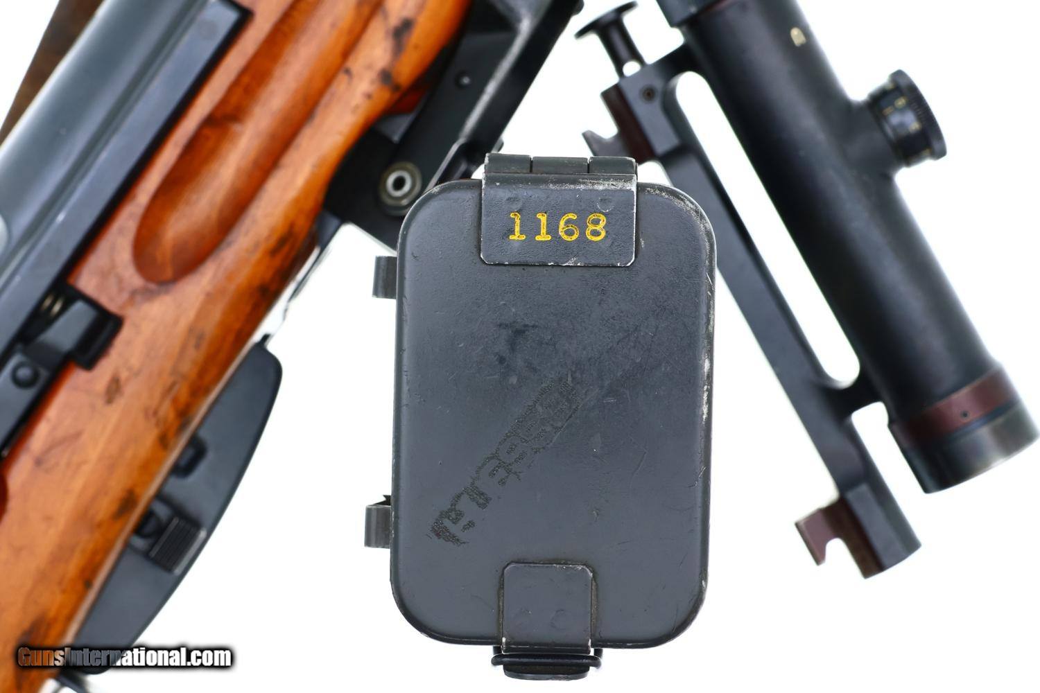 VG+ original blue with sharp edge wear and light handling, barrel with thinning blue, bipod with moderate surface scuffing. In-the-white parts are bright with minimal staining and there is little wear on the magazine. Stock is VG with numerous bruises and handling mark discolorations, but no cracks or repairs. Near excellent original finish scope, can, screwdriver not included, with bright optics and correct manual adjustments. G sling with oil staining. Mirror bore. Correct manual mechanics. A nice, all-original and all-matching Swiss Bern K55 sniper rifle with a bright matching scope, mirror bore, and matching scope can.