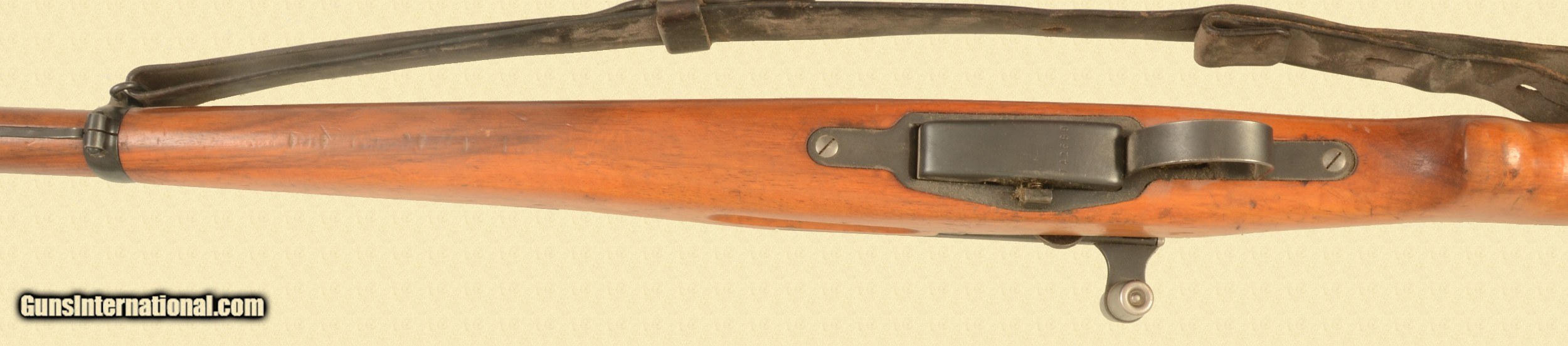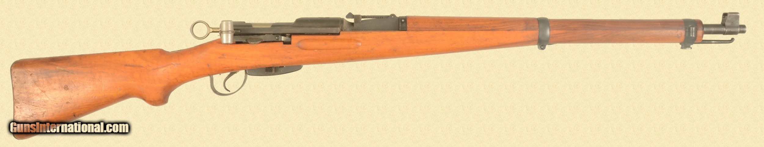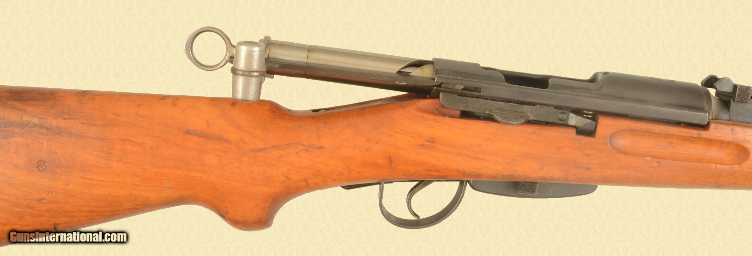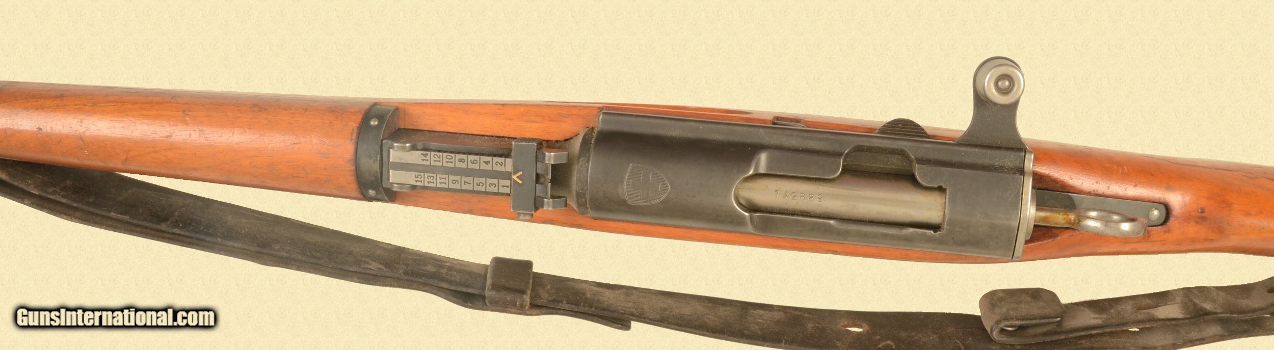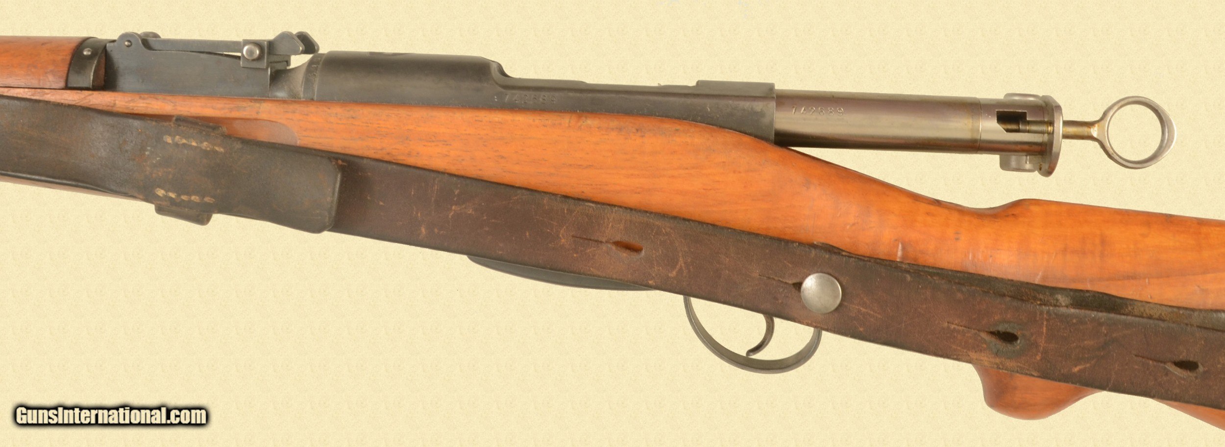 Description: 95% blue, excellent bore, very good stock, 25.6'' barrel , Manufactured in 1943. The front sight is a wing protected drift adjustable blade. Tangent adjustable rear sight graduated to 1500m. The bolt is matching. The metal finish has mild muzzle and edge wear along with some mild thinning on receiver. Crisp shielded cross on stock. Stock has mild handling/storage wear. The bore is bright with strong rifling. It is fitted with a leather sling. Import marked., $565.00 SOLD Curio/Relic: Yes Rifle Caliber: 7.5x55mm Swiss Serial Number: 742689 |